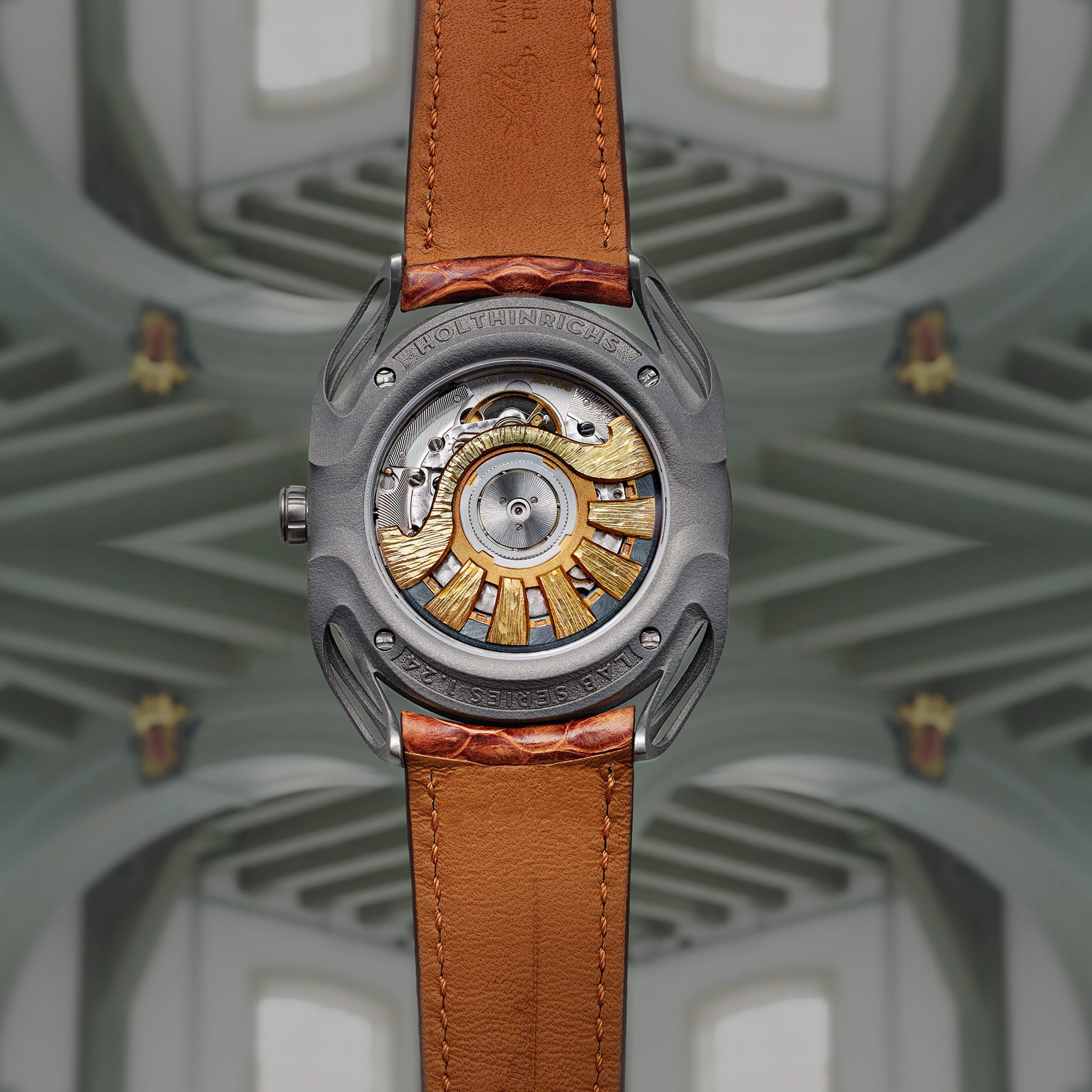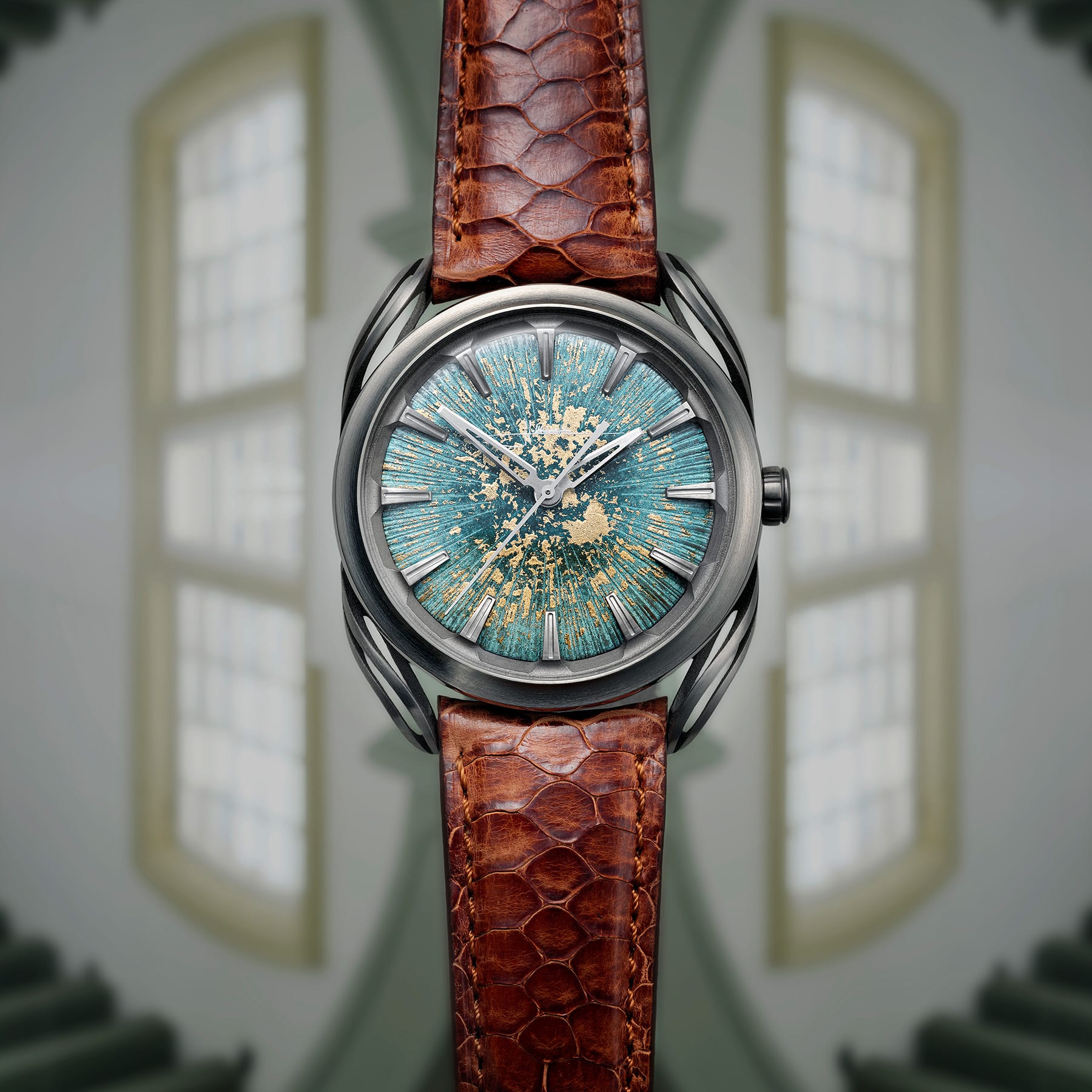 The Holthinrichs SIGNATURE ORNAMENT LAB Series 1.24 is a limited edition of 79 pieces, crafted with a 3D-printed Grade 5 titanium case and a domed patina dial enhanced with hand-applied 24-carat gold leaf by Chris Alexander, a.k.a. The Dial Artist. Known for blurring the line between contemporary art and horology, his craftsmanship adds unique refinement to this avant-garde timepiece. Powered by a modified Sellita SW-300 with a patinated rotor, the LAB Series 1.24 celebrates Dutch heritage, innovative design, and haute horlogerie at the highest level