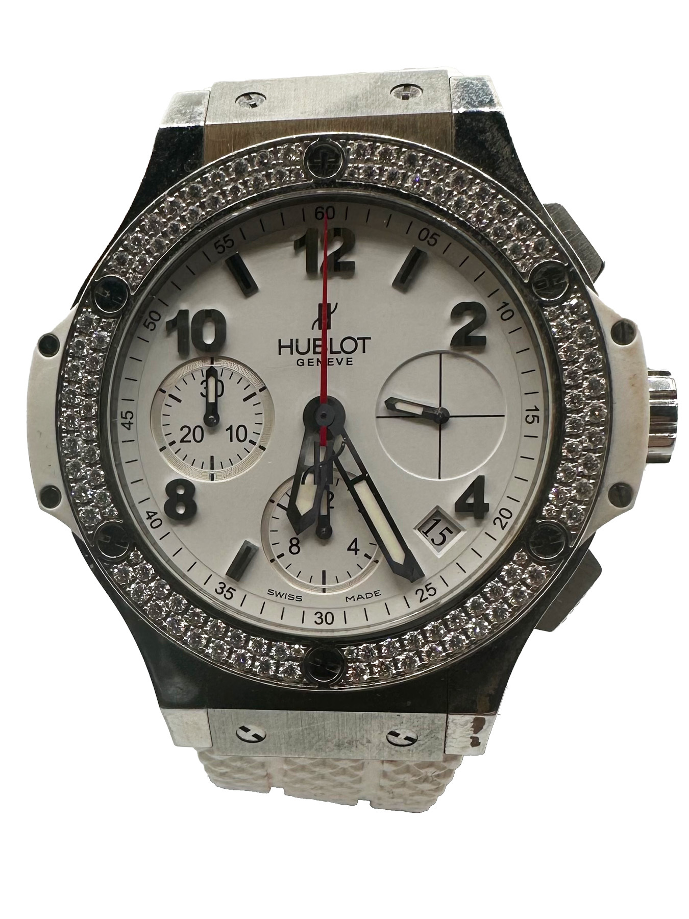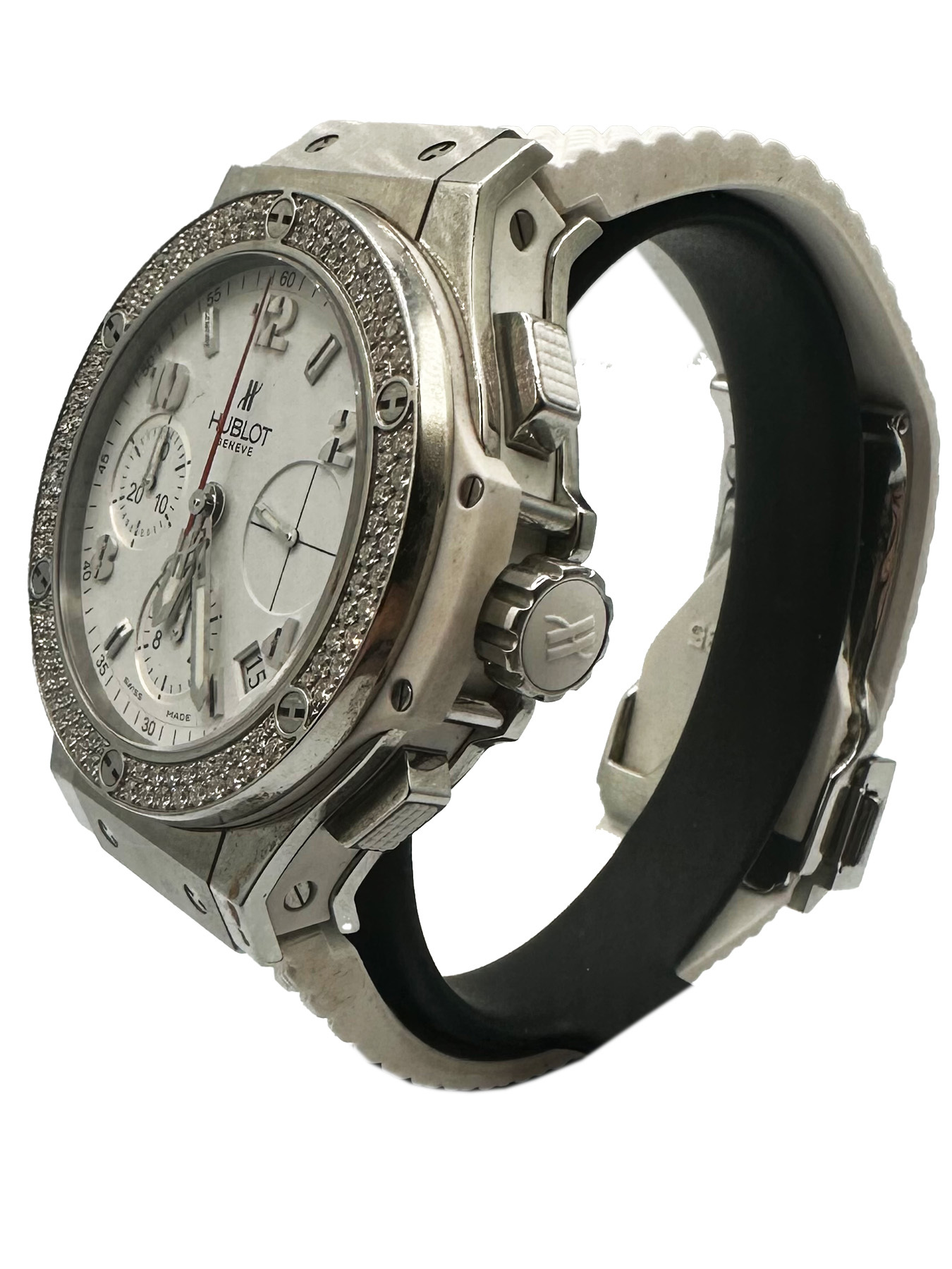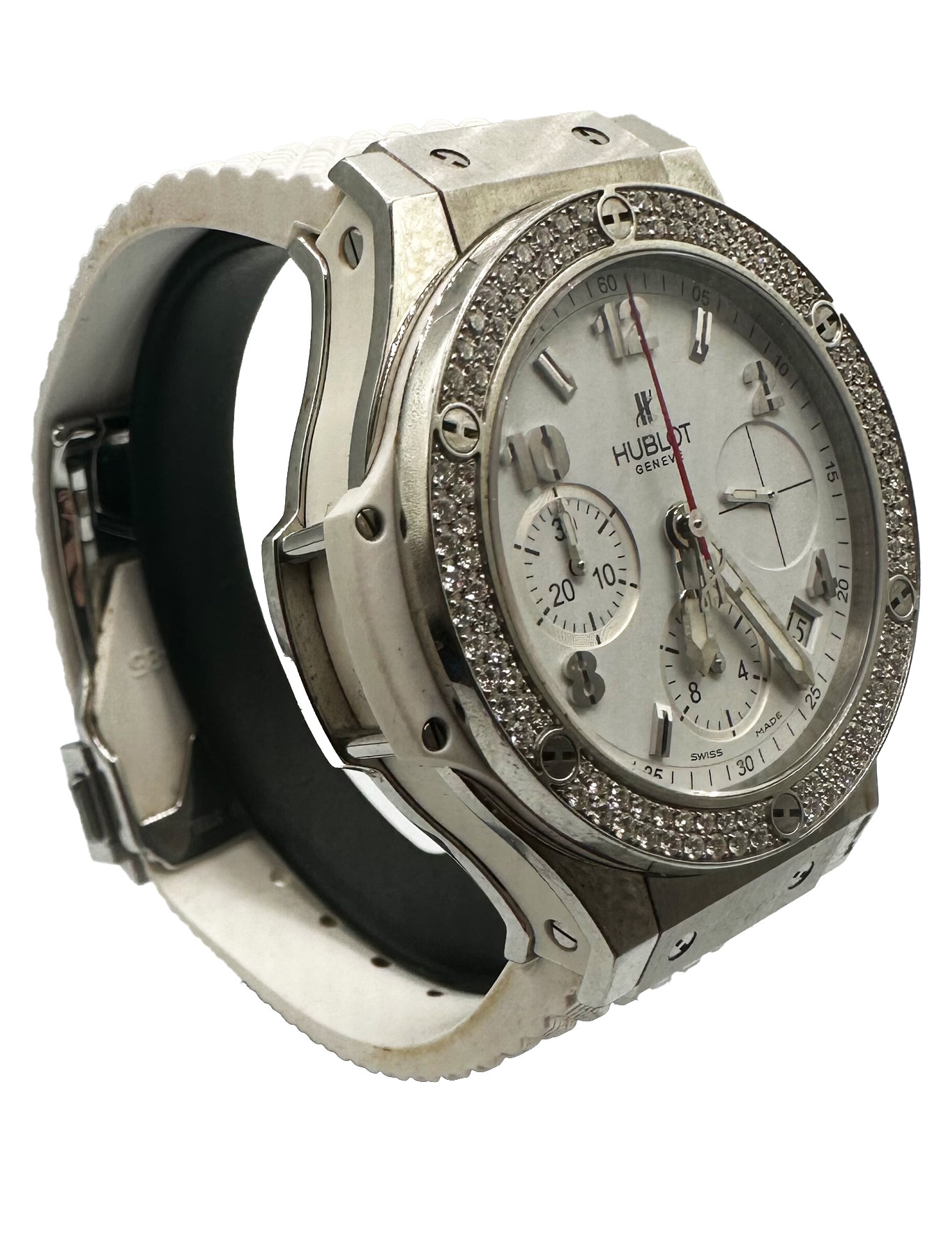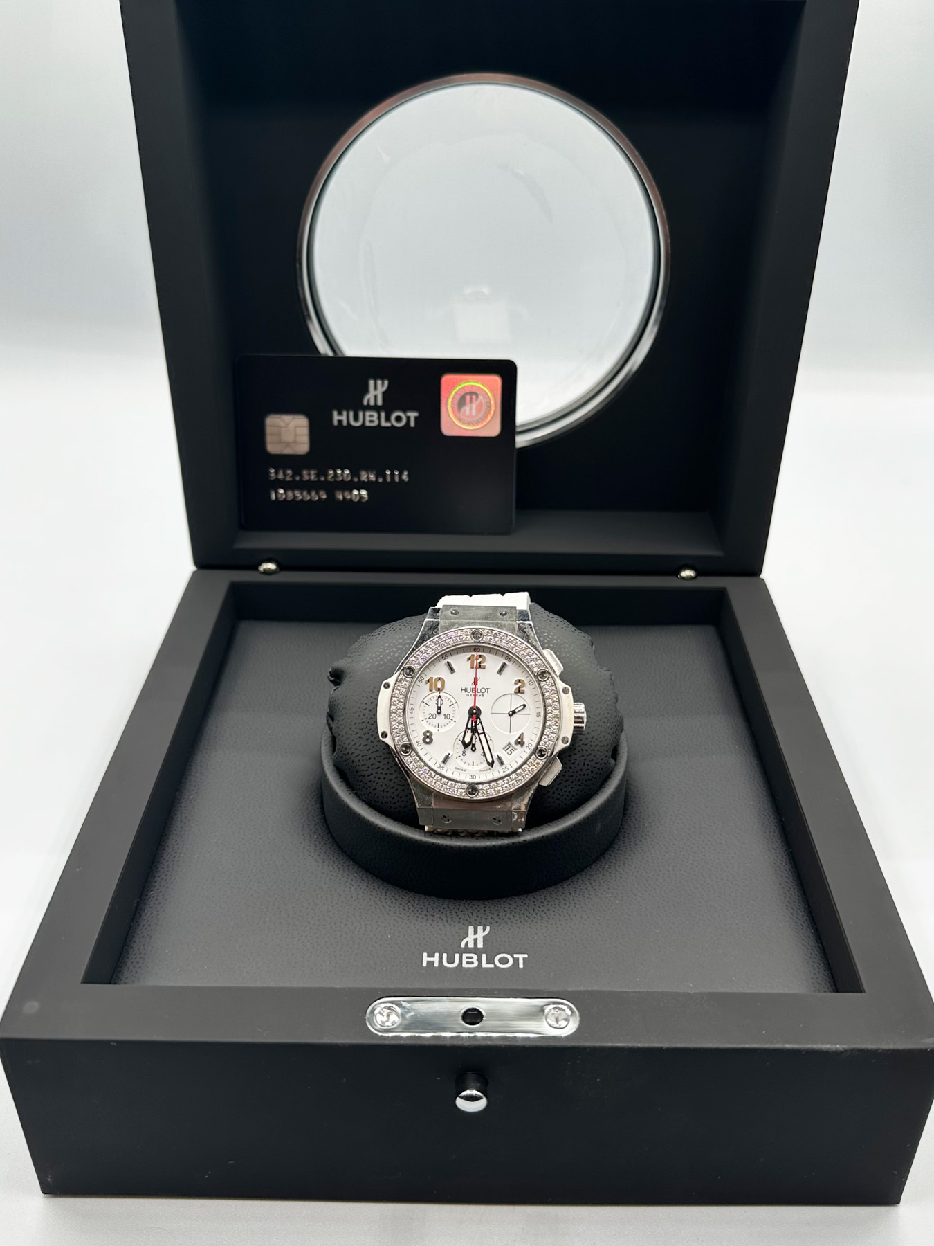 This Hublot 342.SE.230.RW.114 Big Bang Steel White Diamonds is in EXCELLENT condition. It has boxes and papers. This watch has been fully authenticated and certified by Exquisite Timepieces.