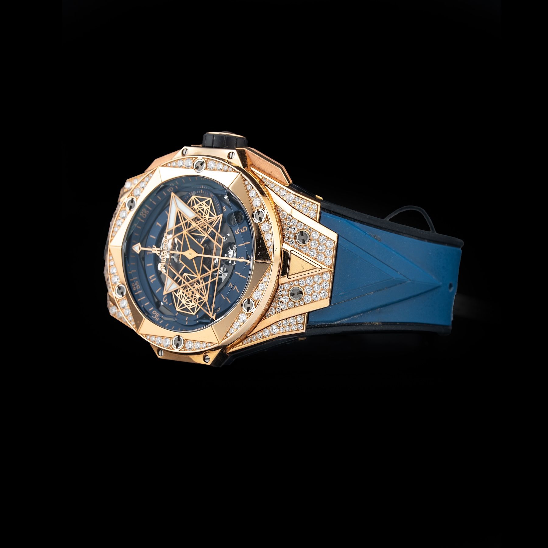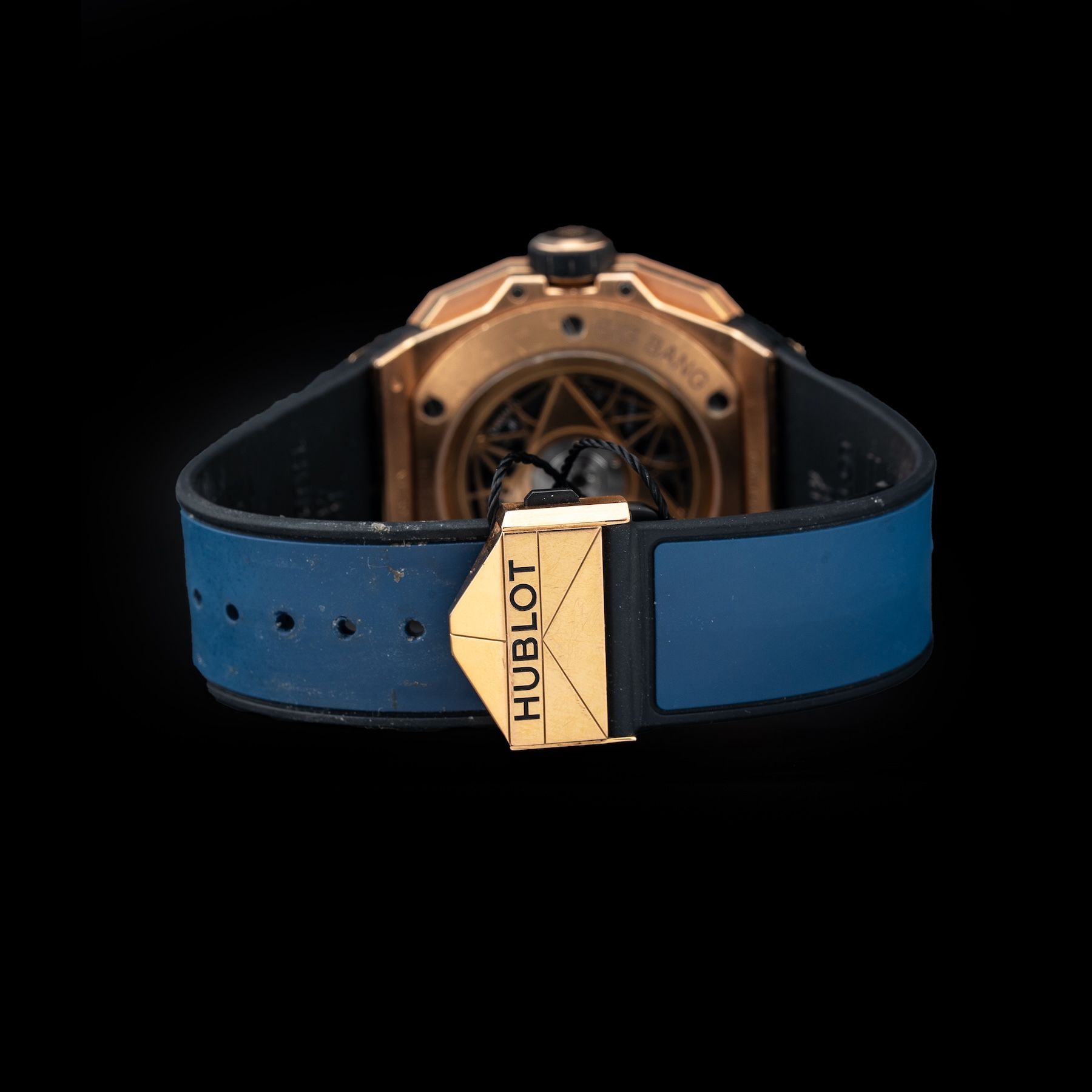 This watch features a 45mm 18k king gold case on rubber strap. This watch also sports a matte blue dial. Powered by a mechanical automatic movement. Water resistance up to 100 meters.