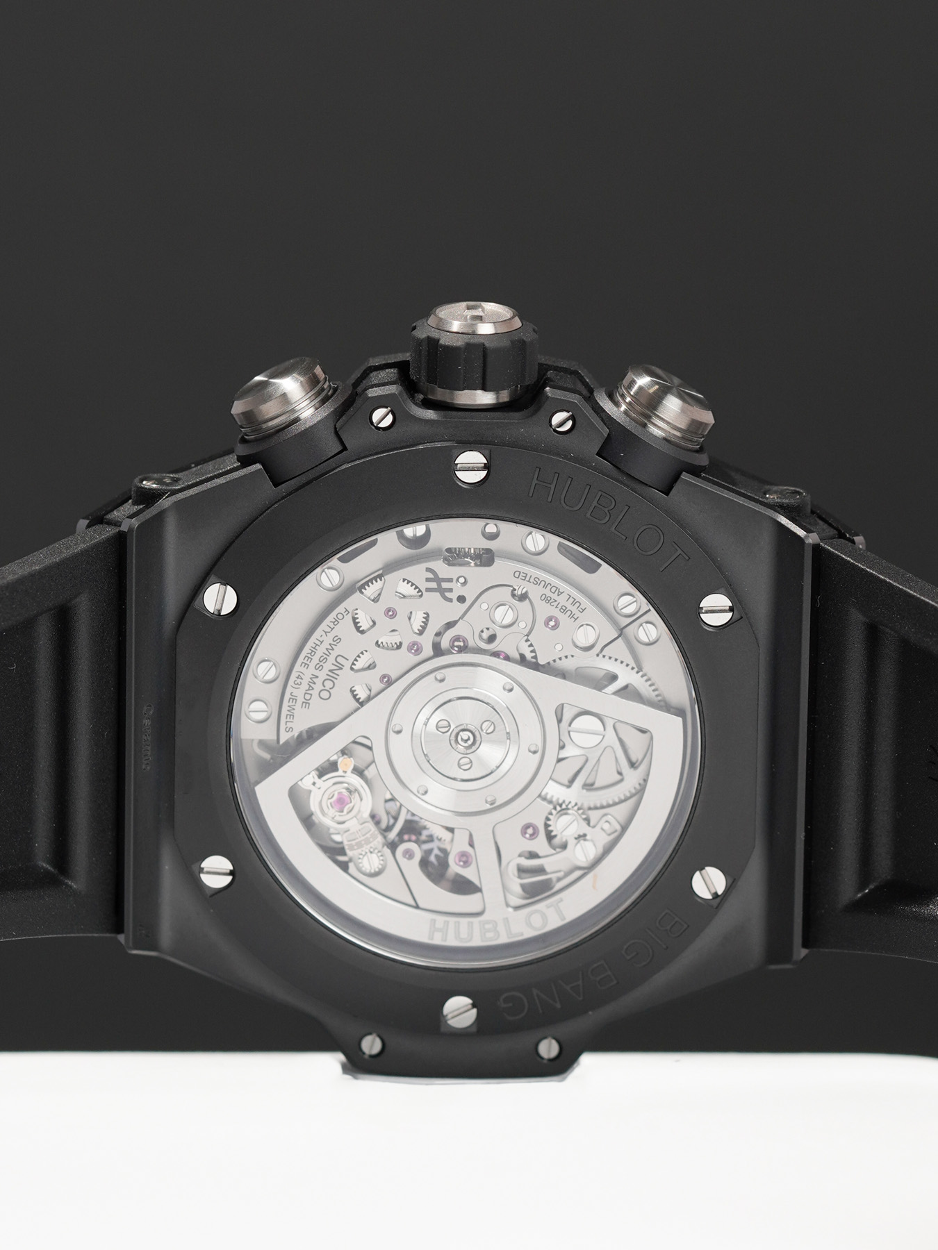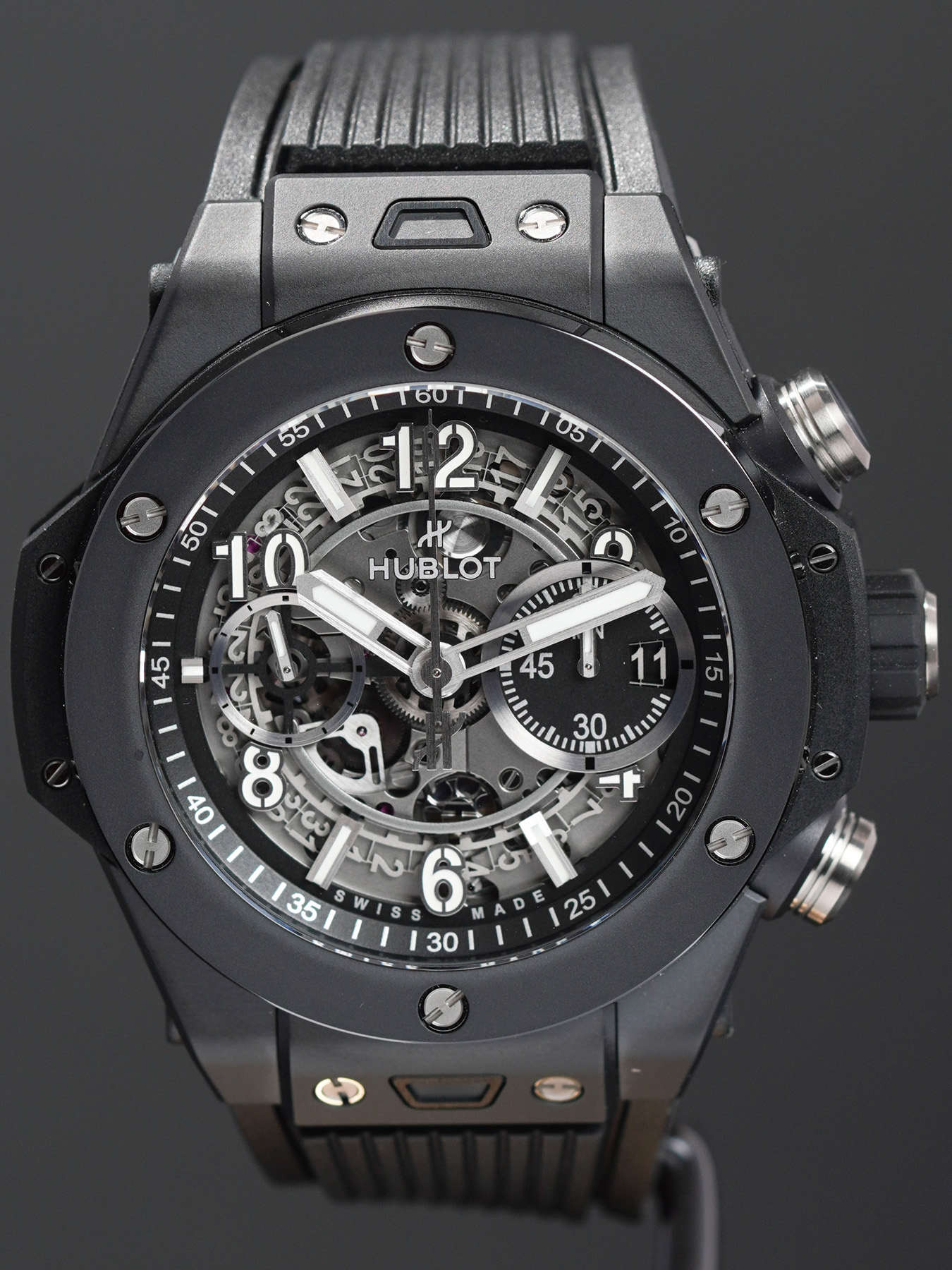This watch features a 44mm ceramic case on rubber strap. This watch also sports a mat black skeleton dial. Powered by a self-winding movement. Water resistance up to 100 meters.