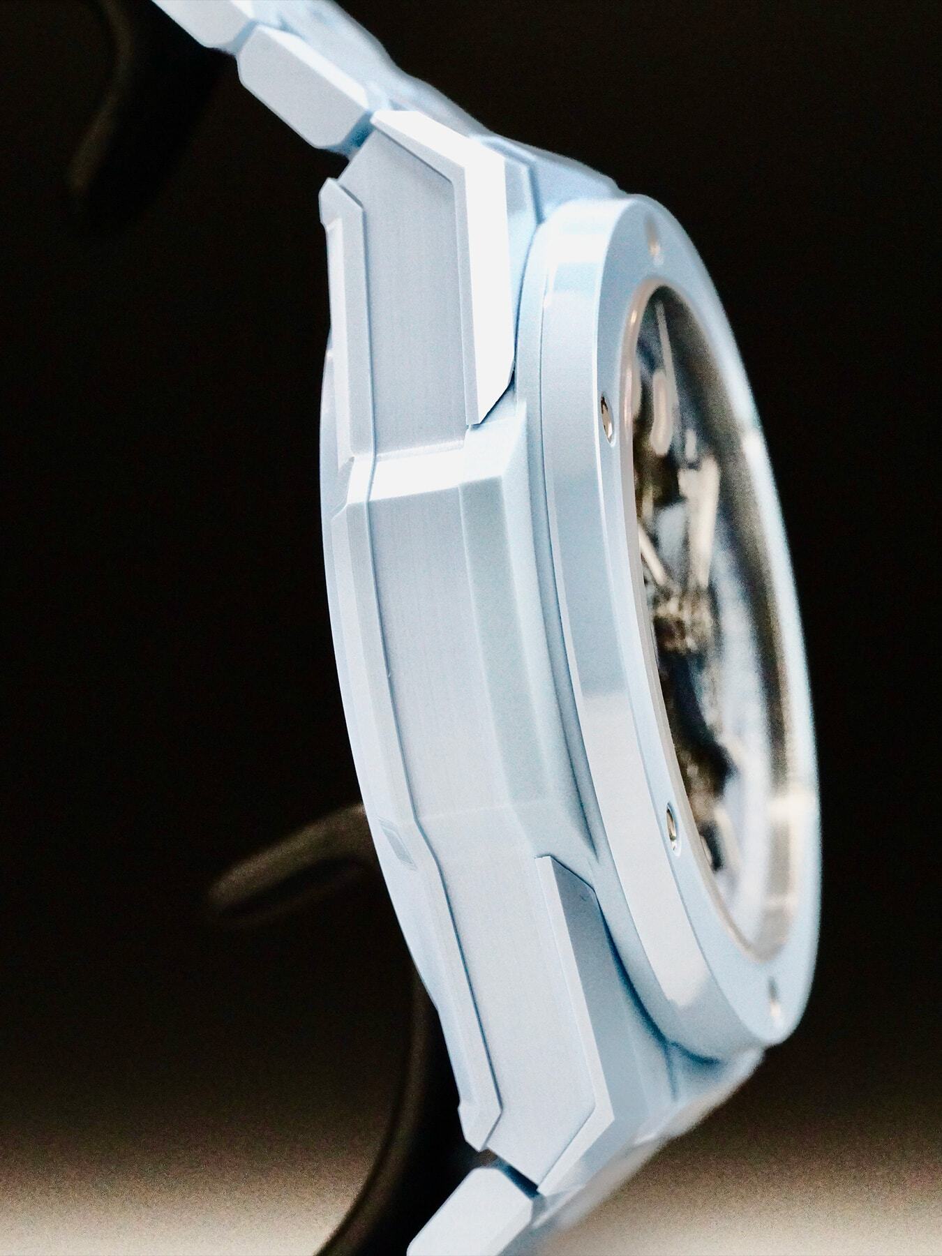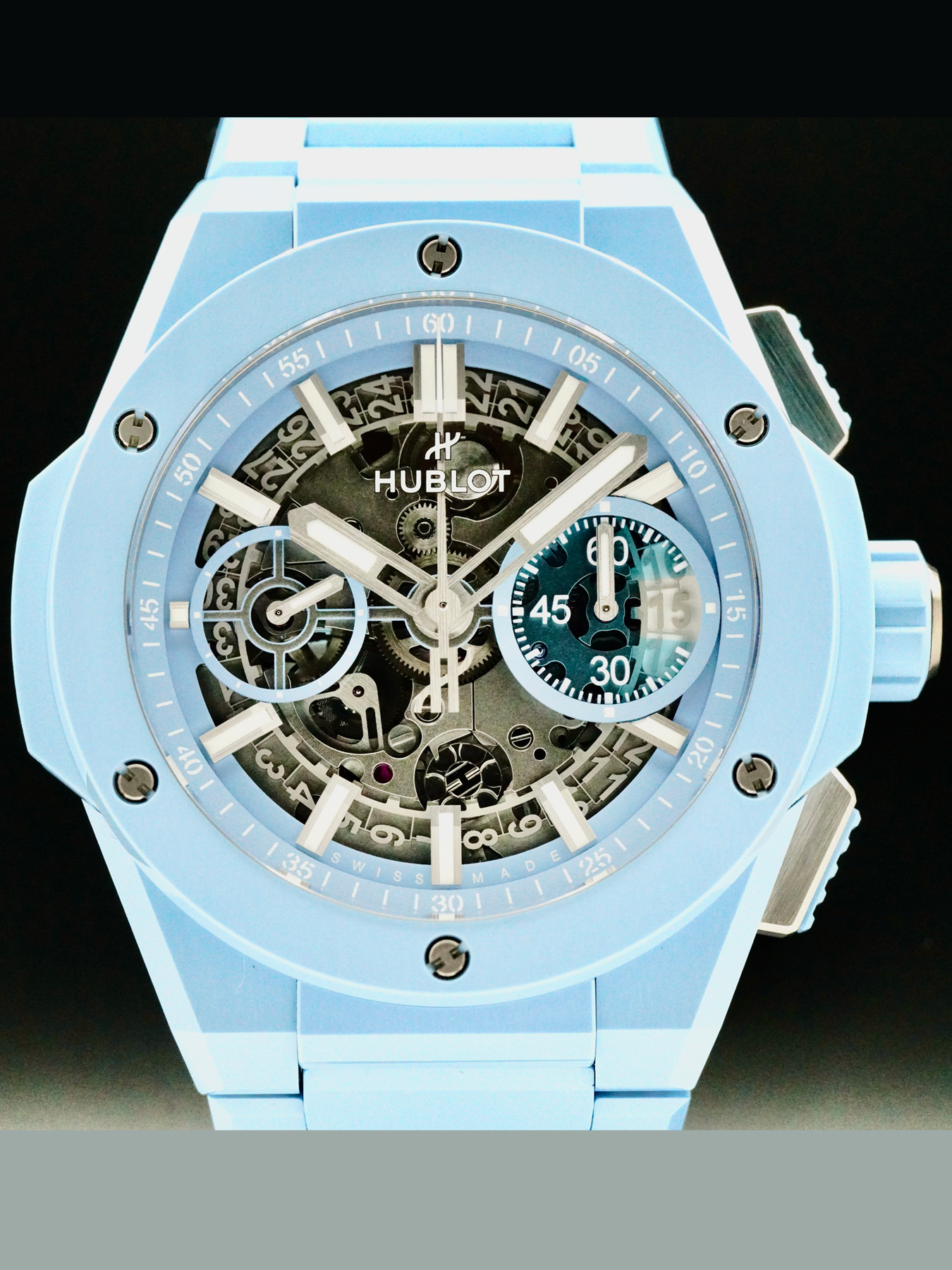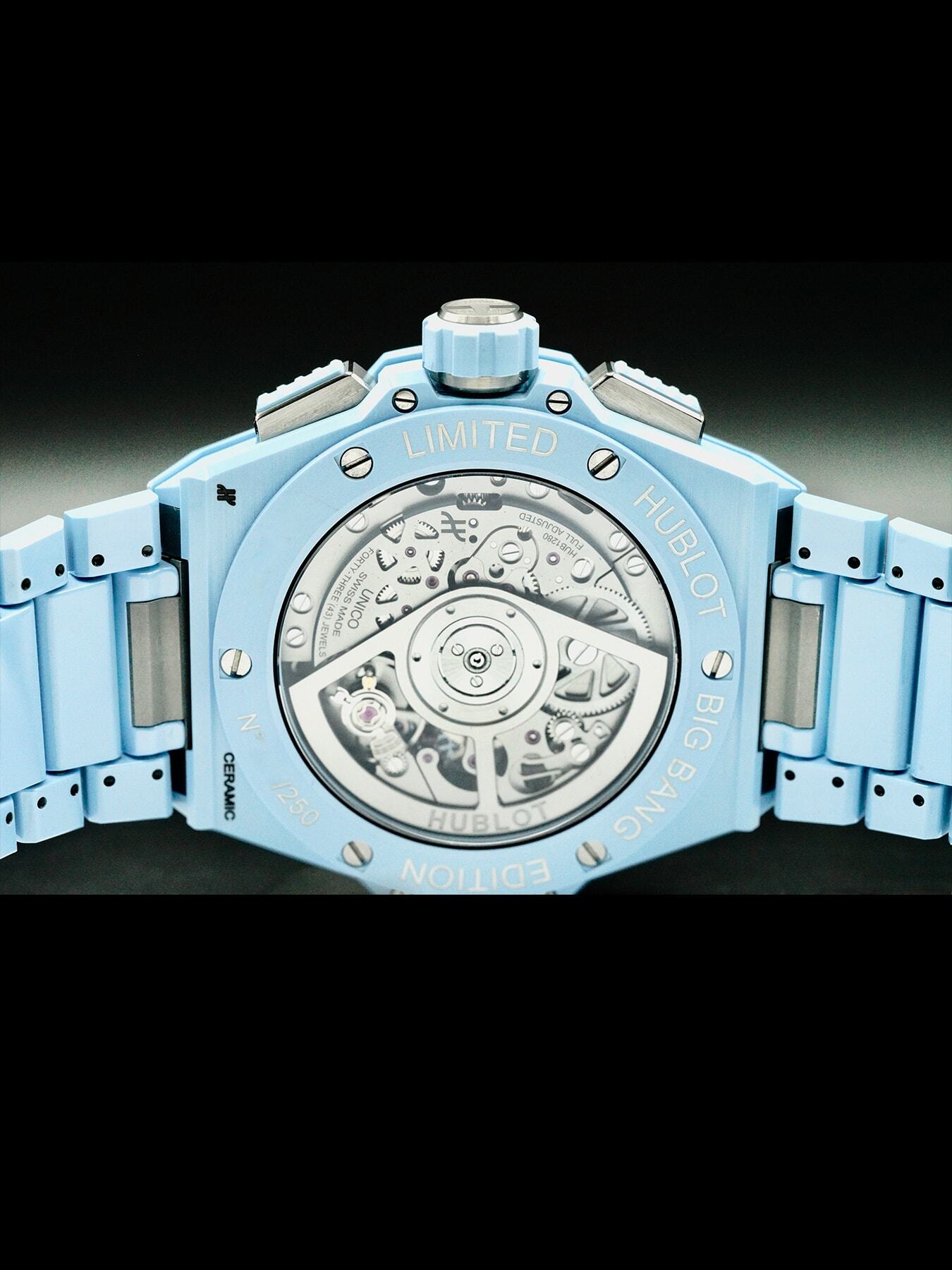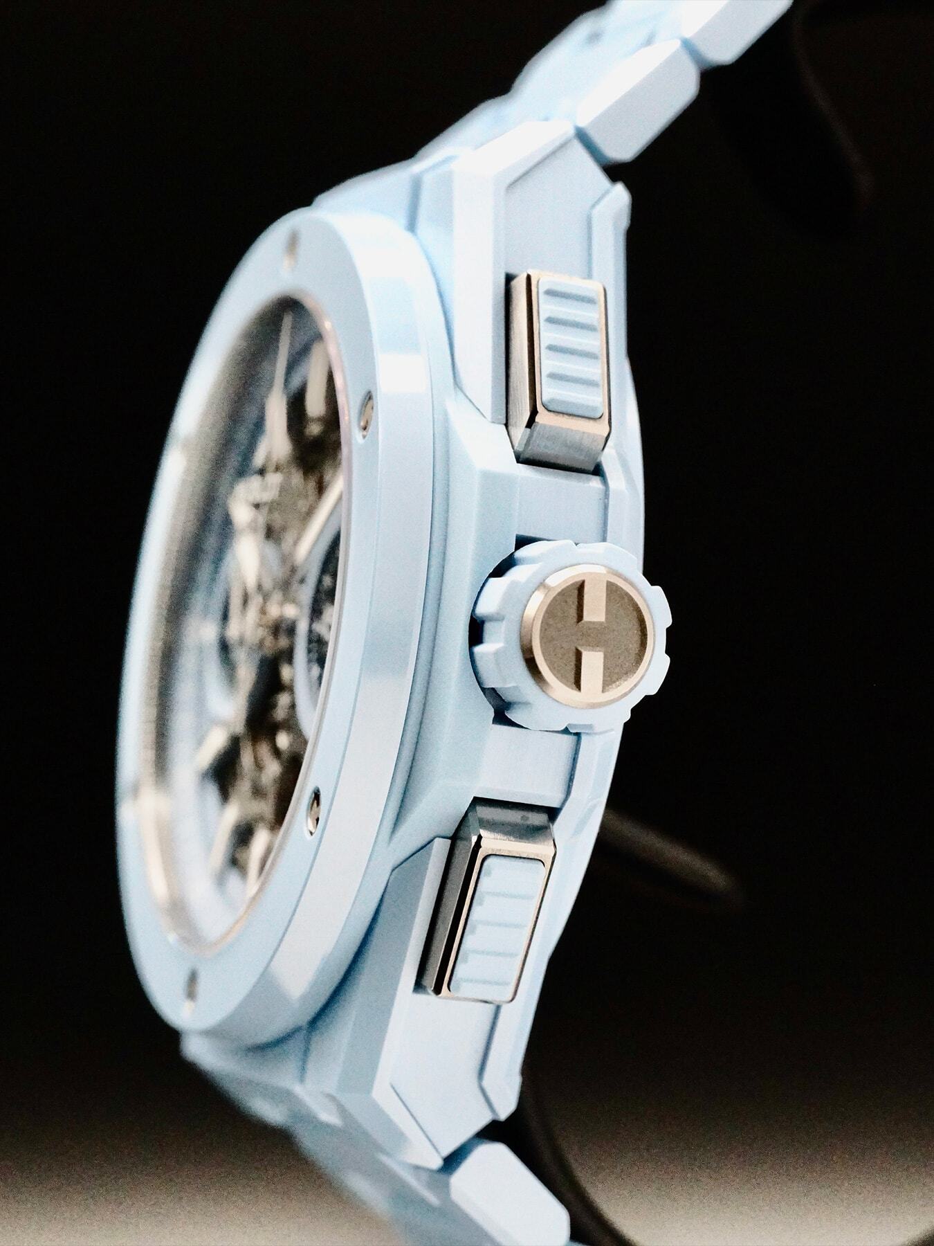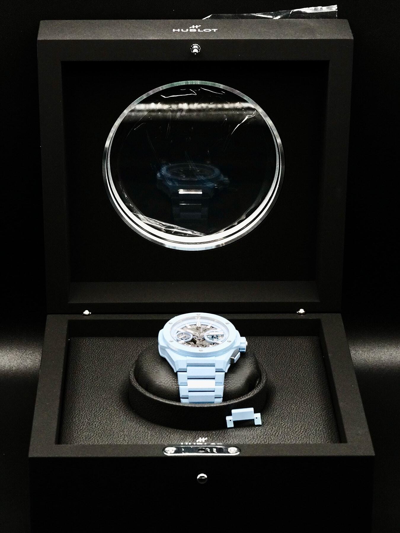This Hublot Big Bang Integral Sky Blue features a 42mm satin-finished & polished blue ceramic case with an exhibition case back on a satin-finished & polished blue ceramic bracelet. This watch also showcases a mat blue skeleton dial with luminous hands and index dial markers covered by scratch resistant sapphire crystal.