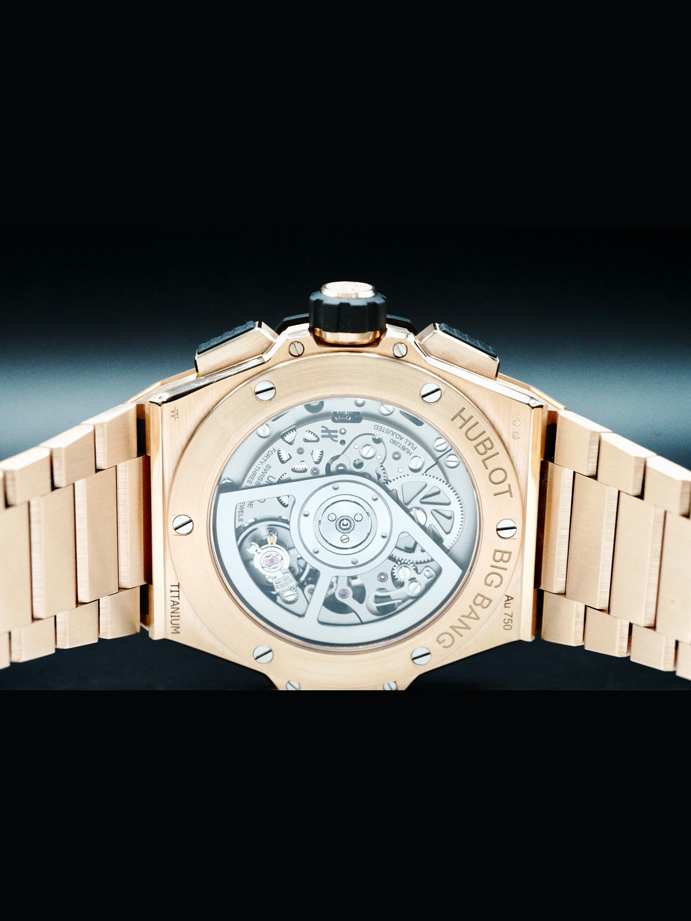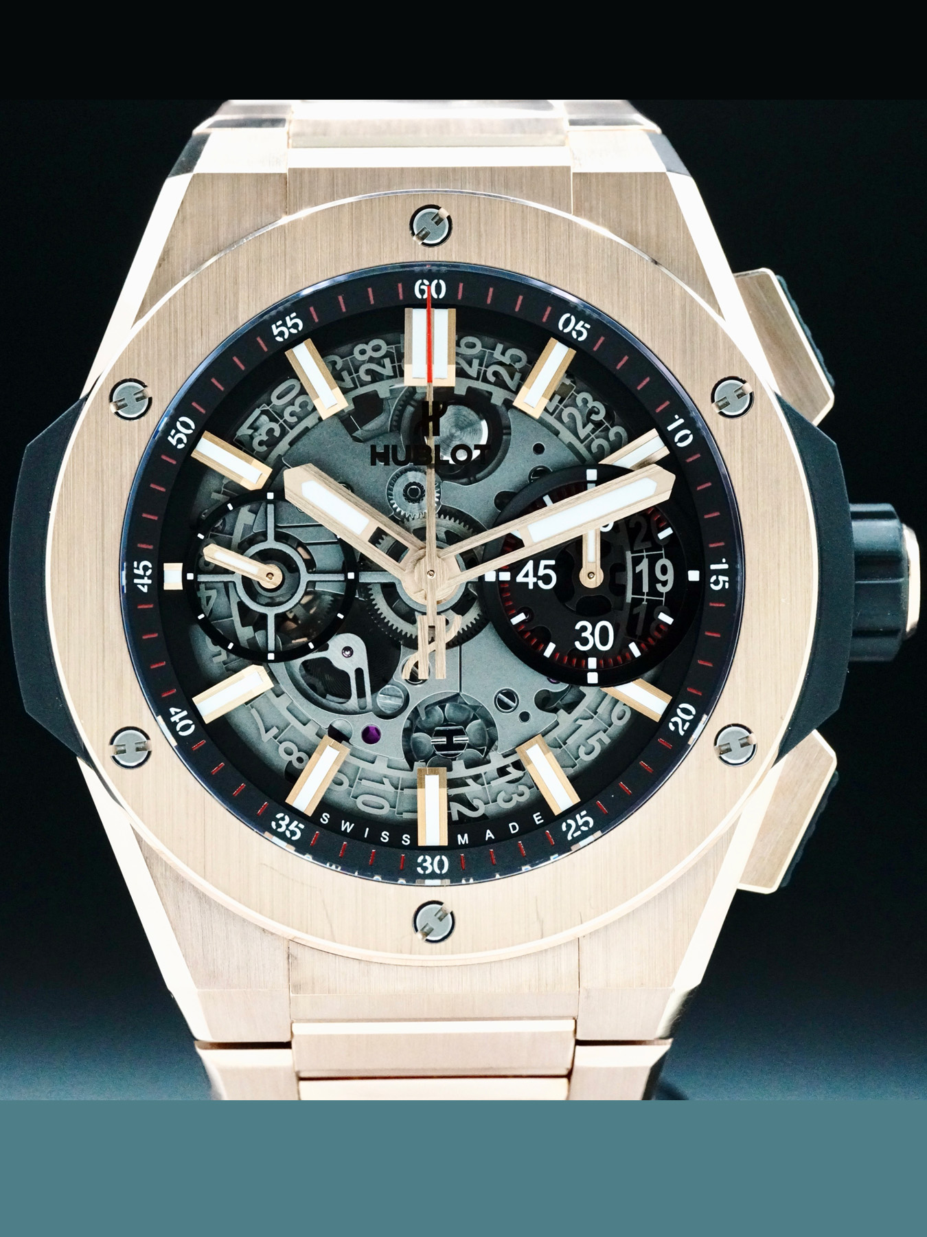 This Hublot 451.OX.1180.OX Big Bang Integral King Gold is in GREAT condition. This watch includes its Original Box and Extra Bracelet Link. This watch has been fully authenticated and certified by Exquisite Timepieces.