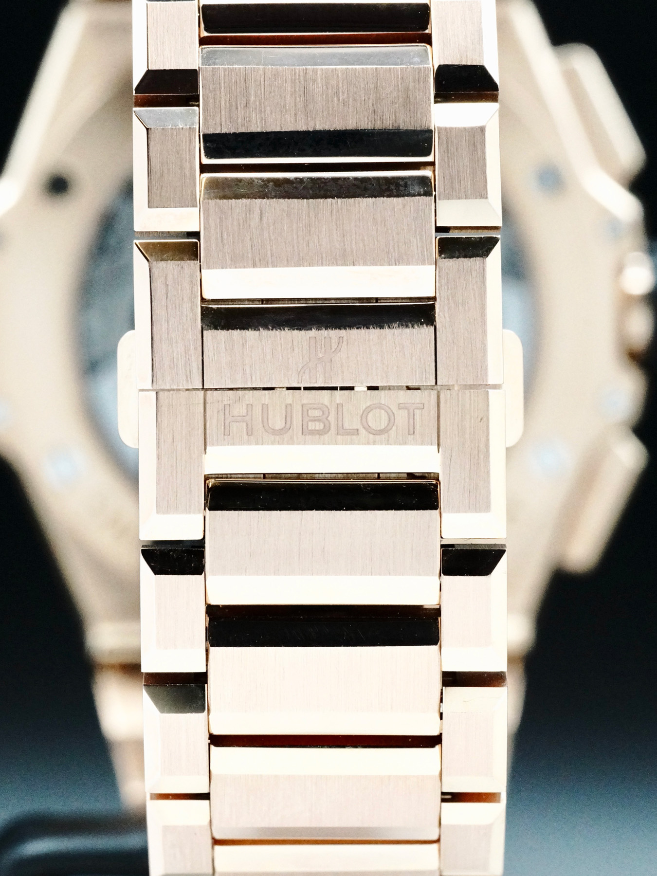 This watch features a 42mm 18kt Rose Gold case on 18kt Rose Gold bracelet. This watch also sports a skeleton dial. Powered by a Hublot UNICO caliber HUM1280 automatic movement. Water resistance up to 100 meters.