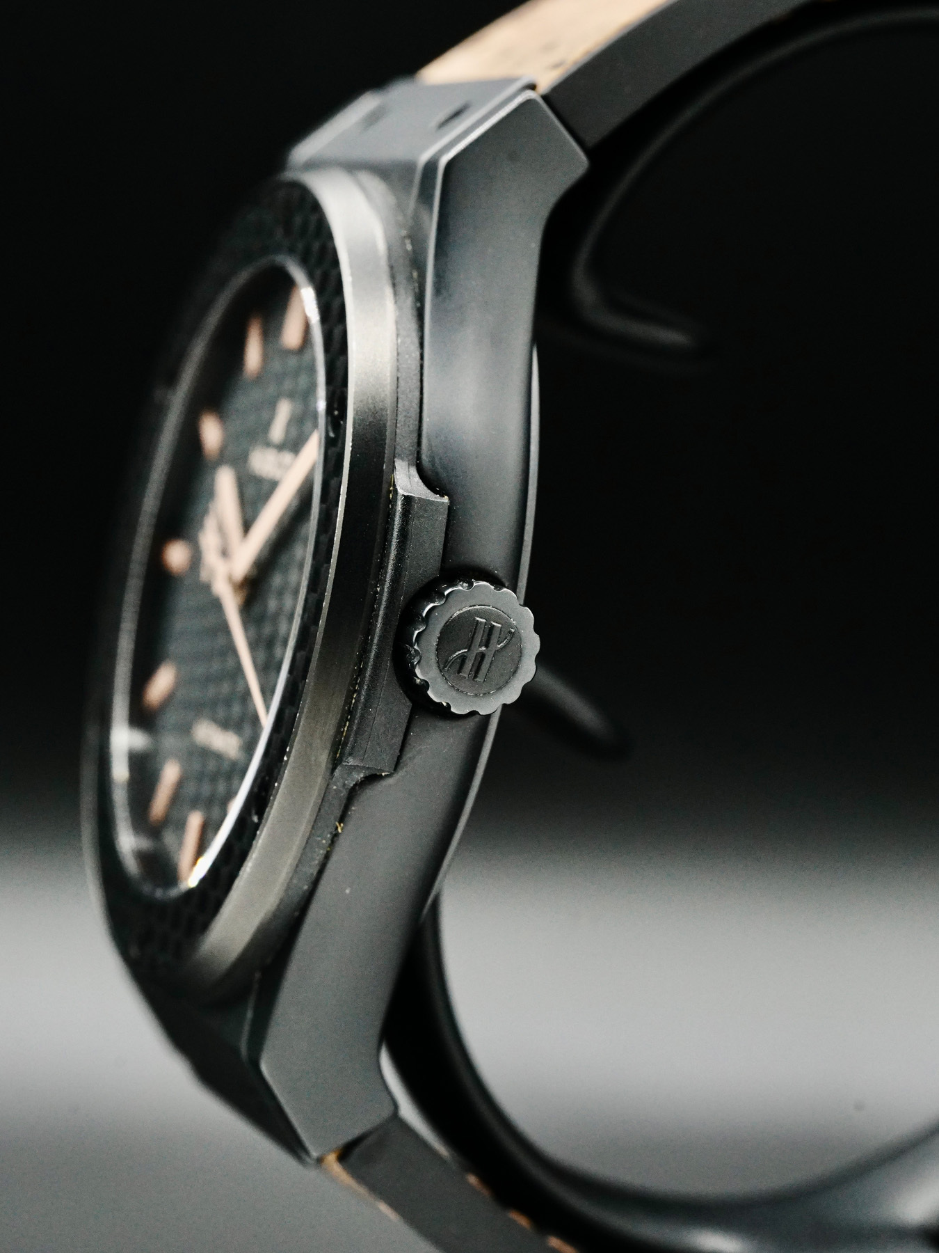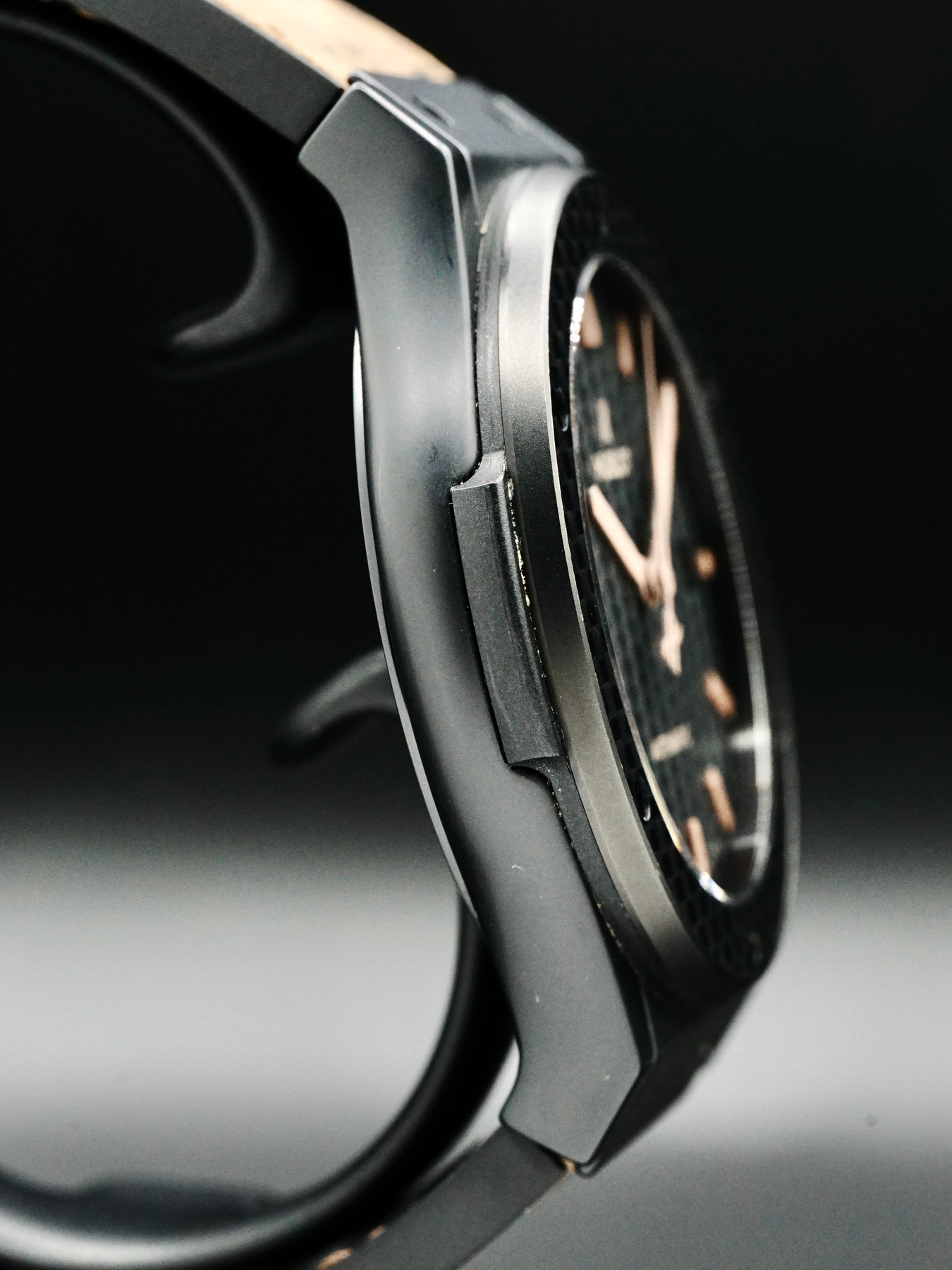 This Hublot Classic Fusion Special Edition features a 42mm ceramic case with a carbon fibre bezel on a brown leather strap. This watch also showcases a carbon fibre dial with brown hands and index dial markers covered by scratch resistant sapphire crystal.