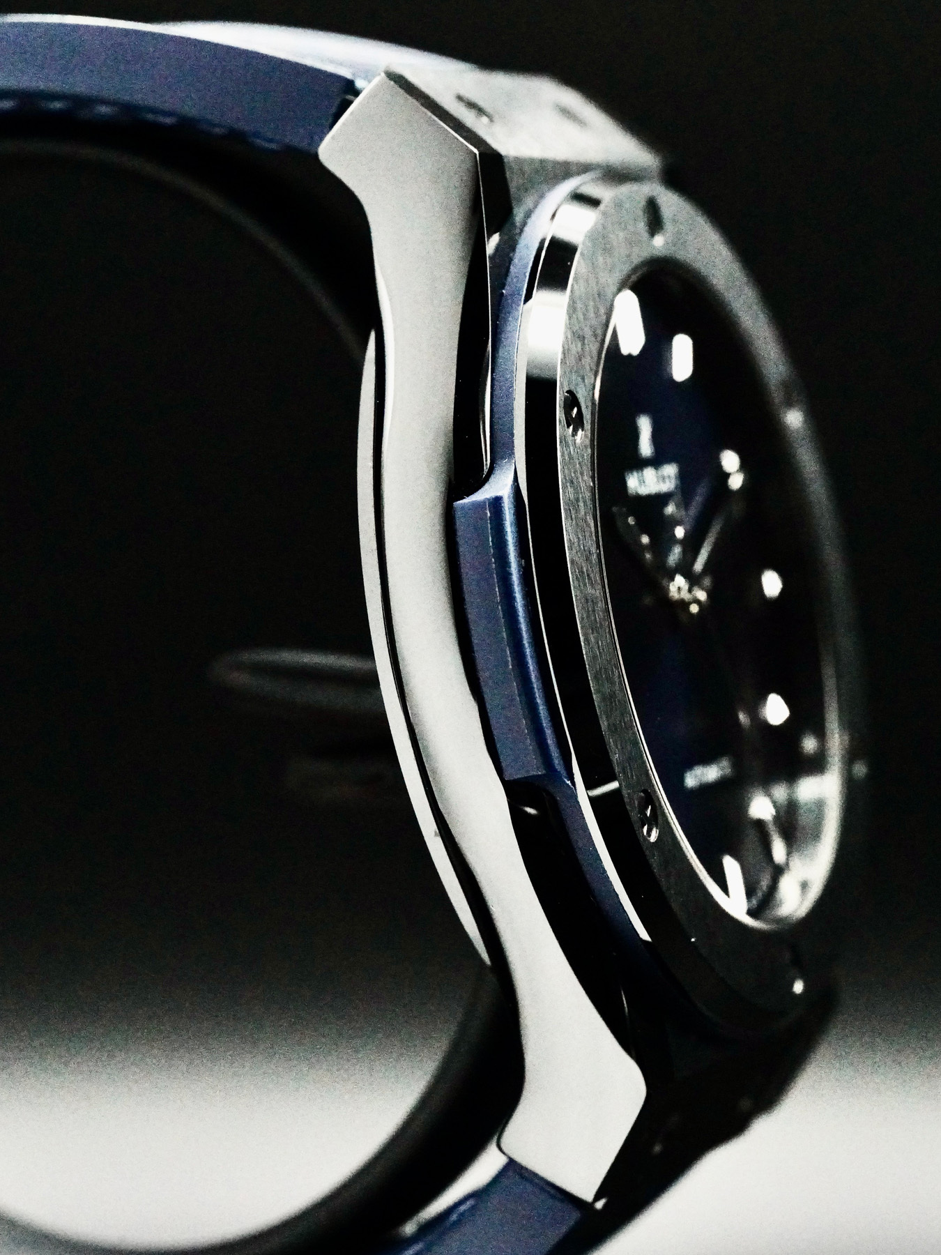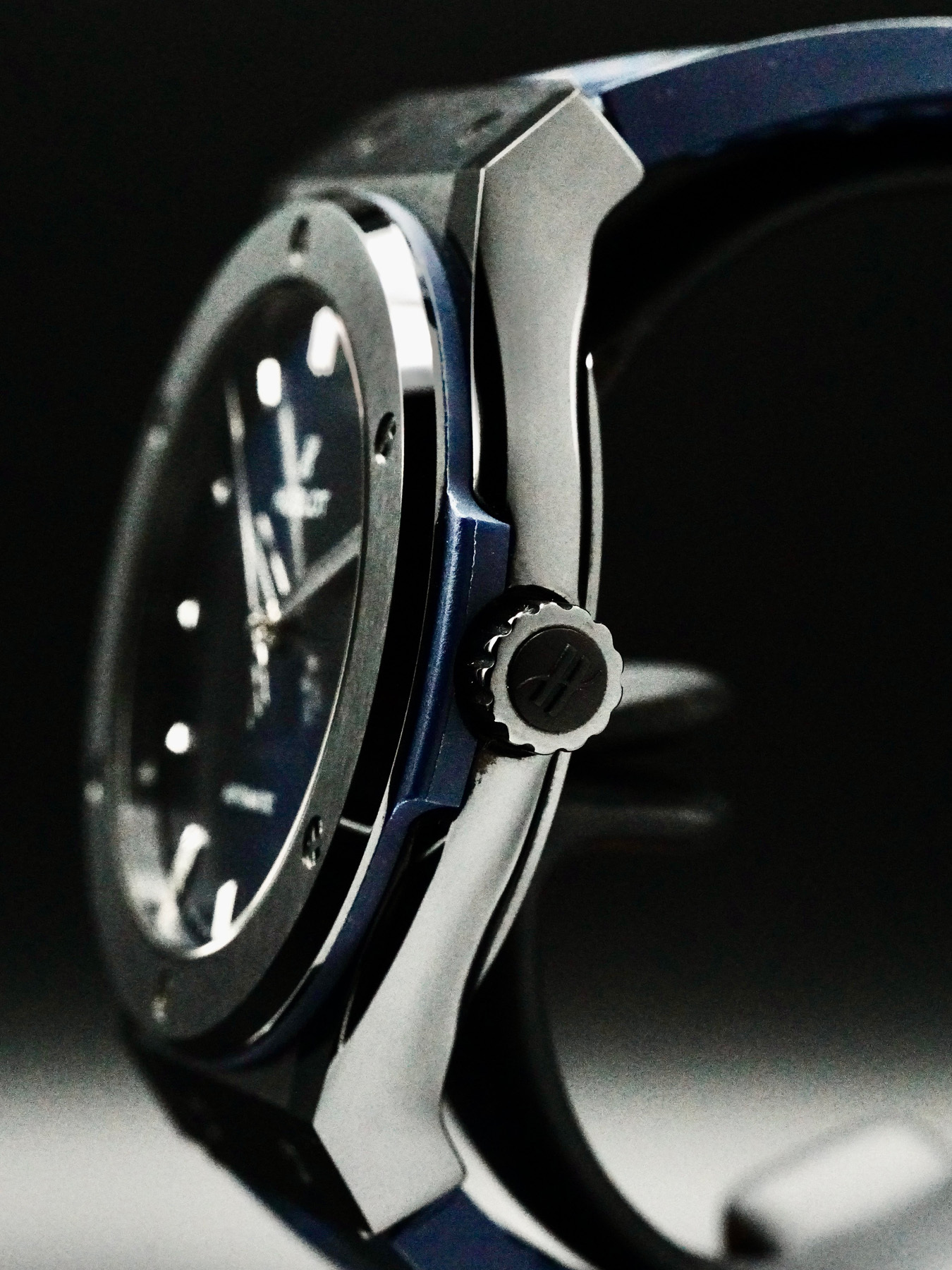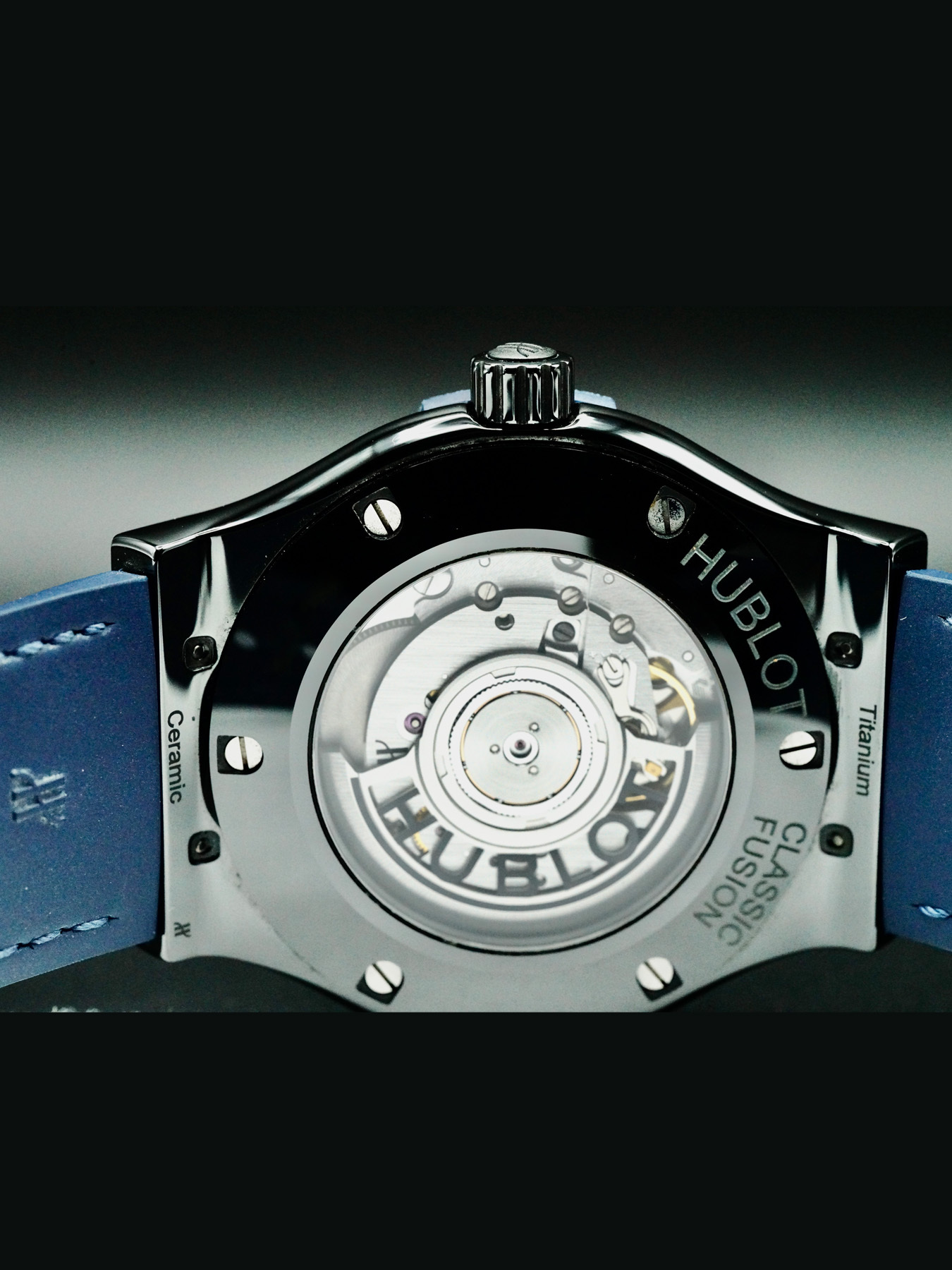 This Hublot Classic Fusion features a 42mm ceramic case with a display case back on a blue rubber with leather top strap. This watch also sports a blue dial with silver-tone hands and index dial markers covered by scratch resistant sapphire crystal.