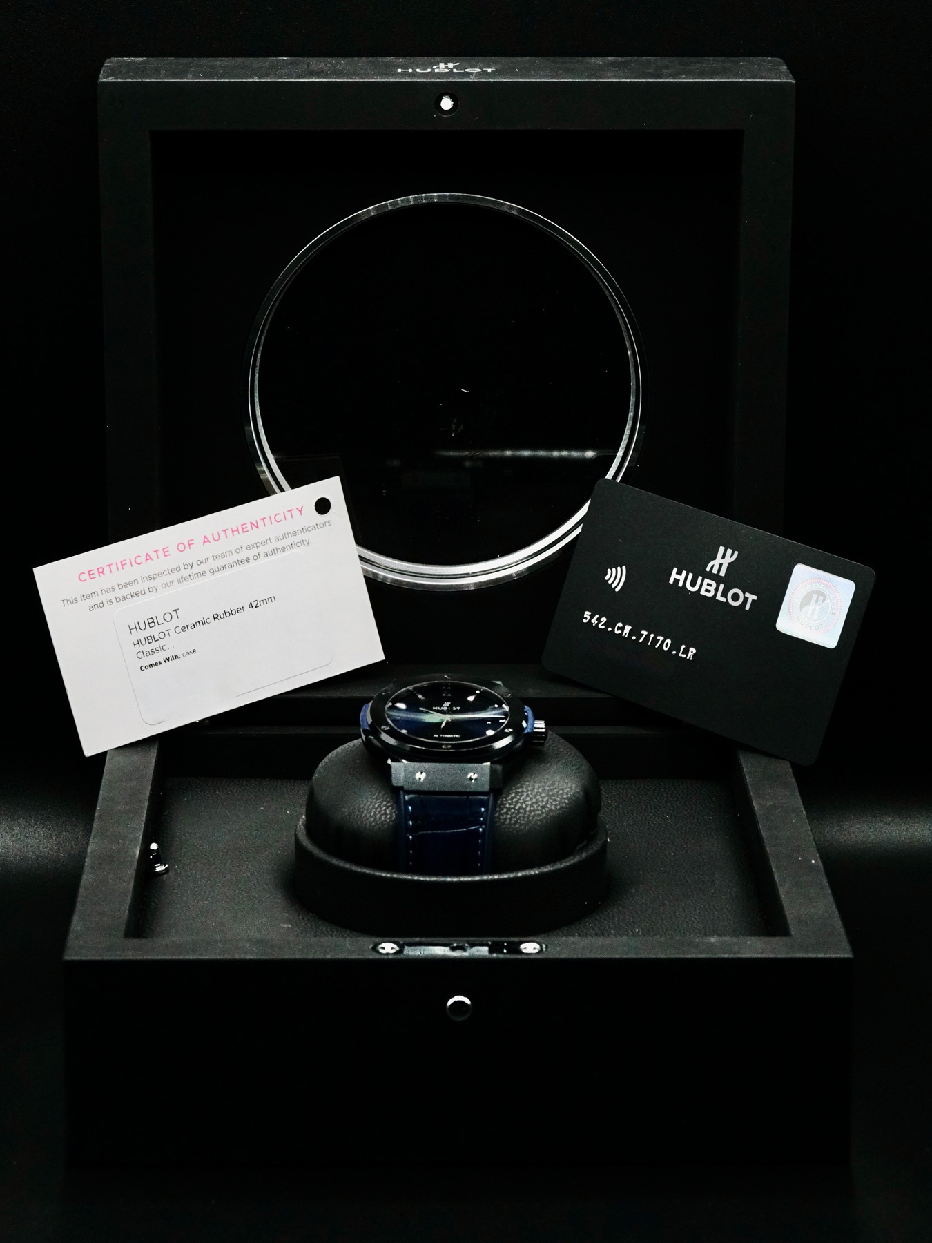 This Hublot Classic Fusion Ceramic 542.CM.7170.LR is in EXCELLENT condition. This watch includes its original box, certificate of authenticity, and international warranty card. No date on warranty card.