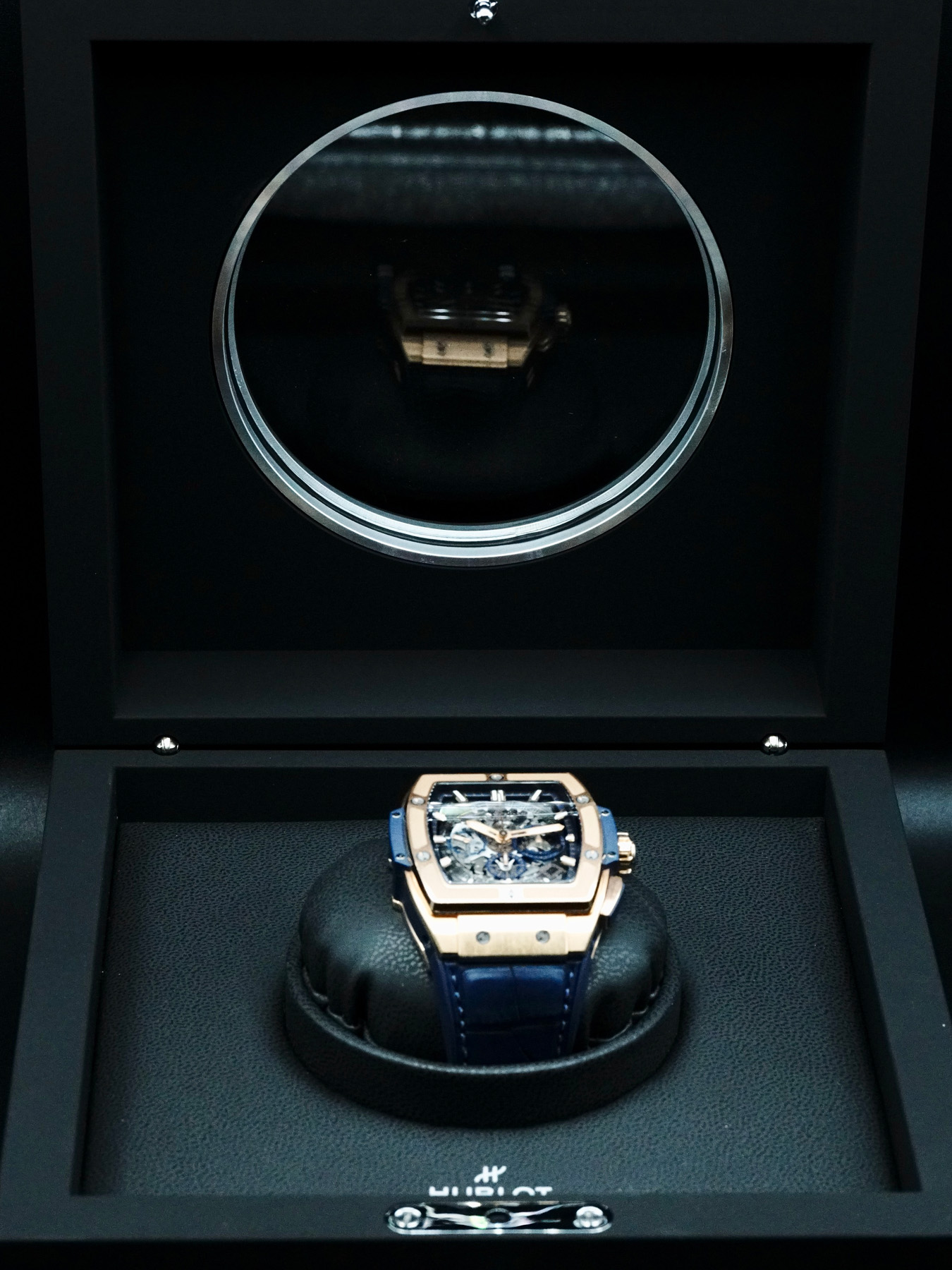 This Hublot Spirit of Big Bang King Gold Blue features a 42mm 18k rose gold case with an exhibition case back on a blue leather strap. This watch also sports a skeleton dial with luminous hands and index dial markers covered by scratch resistant sapphire crystal.