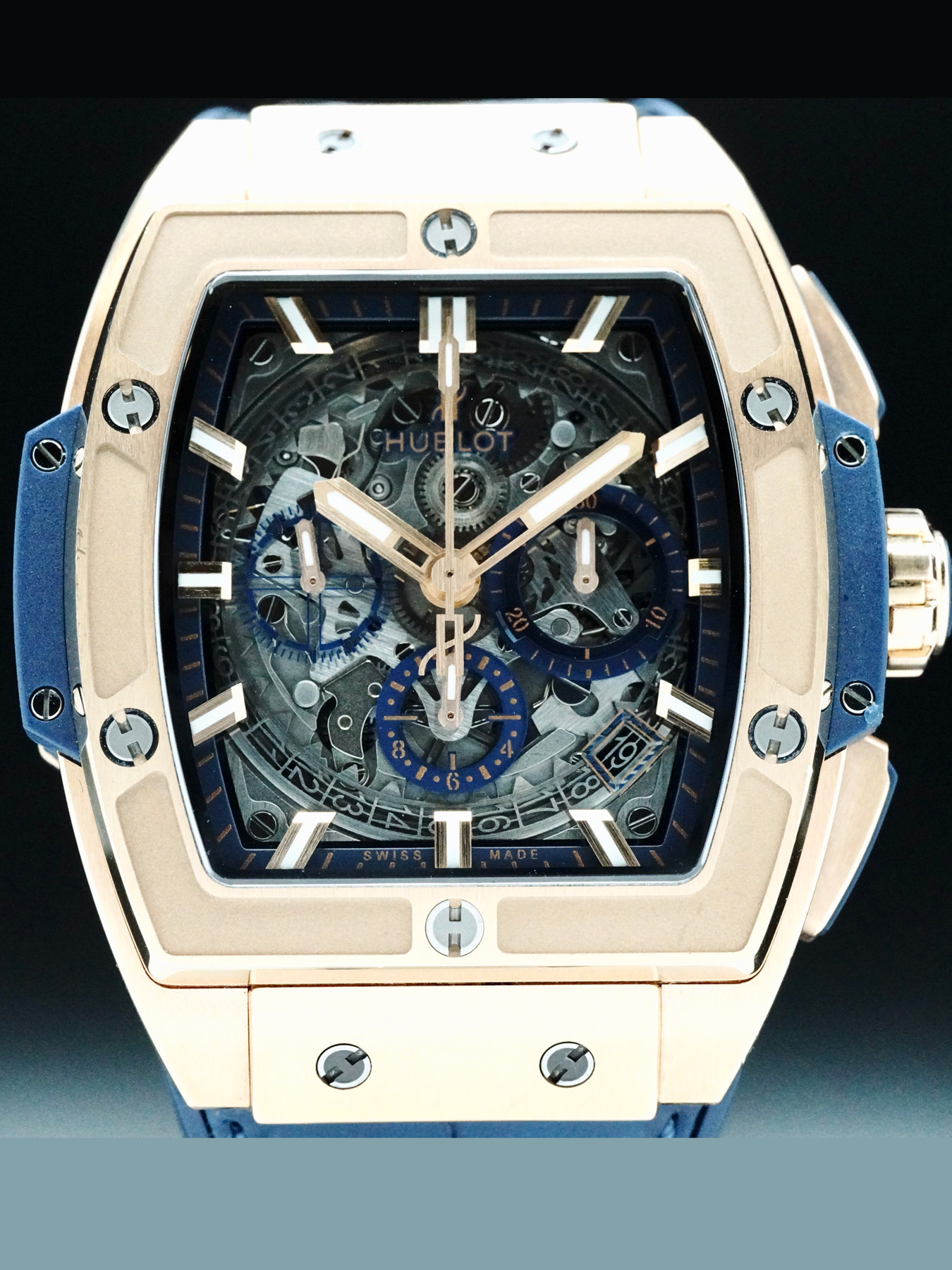 This Hublot Spirit of Big Bang King Gold Blue 641.OX.7180.LR is in GOOD condition. This watch includes its original box only. No papers or warranty. This watch has been fully authenticated and certified by Exquisite Timepieces.