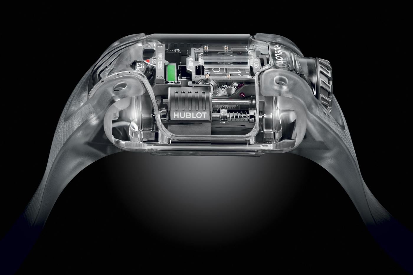 The piece has no dial: Hublot has fused the calibre with the dial. The movement is the face and soul of the watch. The gaze is drawn directly to the mechanism to read the time. The MP-10 features a highly architectural design and a particularly expressive movement built around volume and depth. Yet, this in no way interferes with reading. Instead, it makes it simpler. The time is read from top to bottom, fluidly and naturally. The power reserve is particularly expressive, with a two-tone disc (red and green) set coaxially to the hours and minutes.