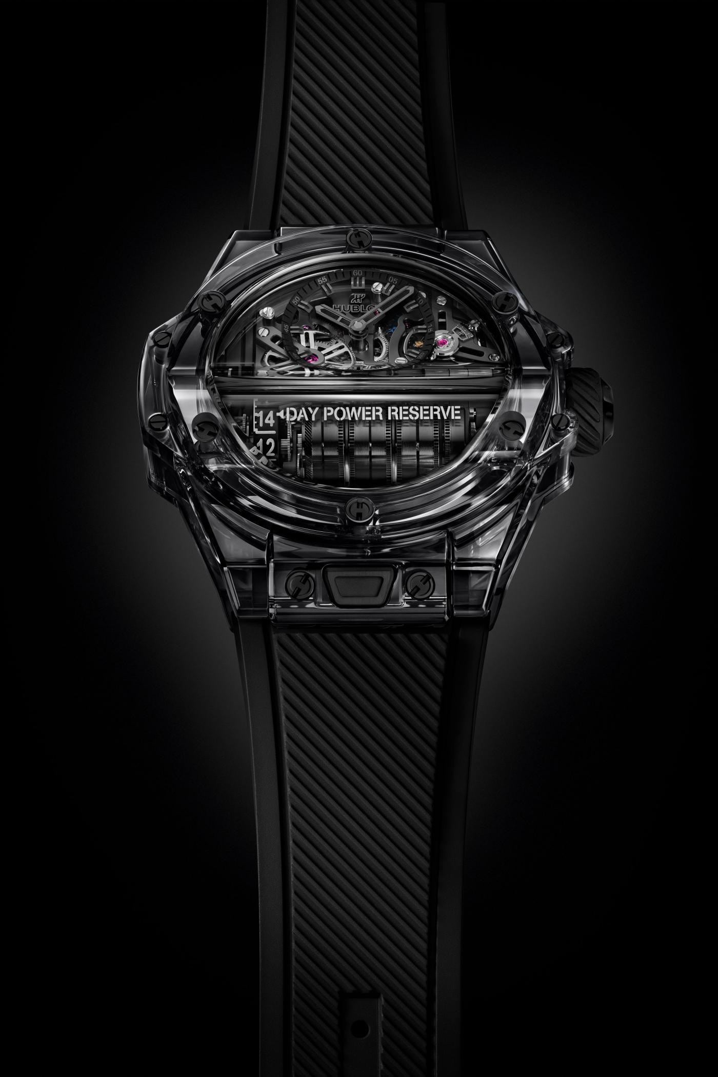 To obtain a two-week power reserve, Hublot has developed an original and spectacular design movement integrating seven barrels paired in series. To enable the transmission of energy between the horizontal axis of the barrels and the vertical wheel driving the hour/minute displays, the Manufacture has used a very rare system in watchmaking: a 90-degree return by means of the helical gear wheel, of the “endless screw” type.