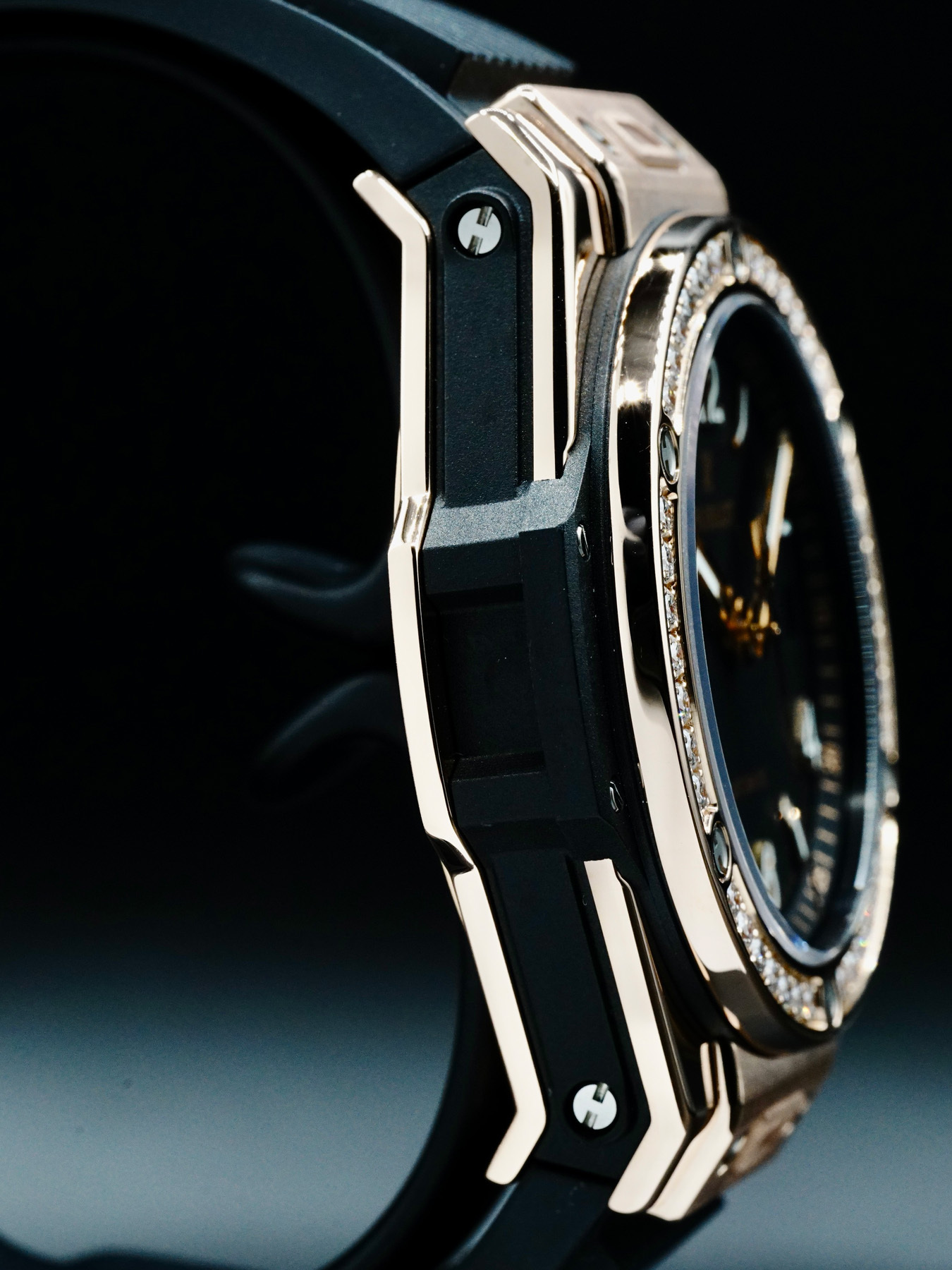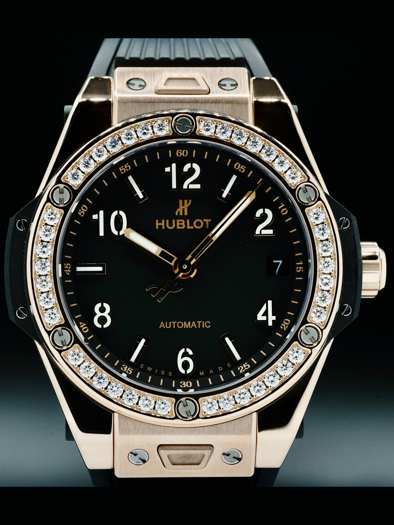 This Hublot Big Bang One Click King Gold Diamonds features a 39mm 18k king gold case and an 18k king gold bezel set with 42 diamonds totaling 1.00ct. This watch also sports a matte black dial with luminous rose gold-tone hands and Arabic numeral dial markers covered by scratch resistant sapphire crystal.