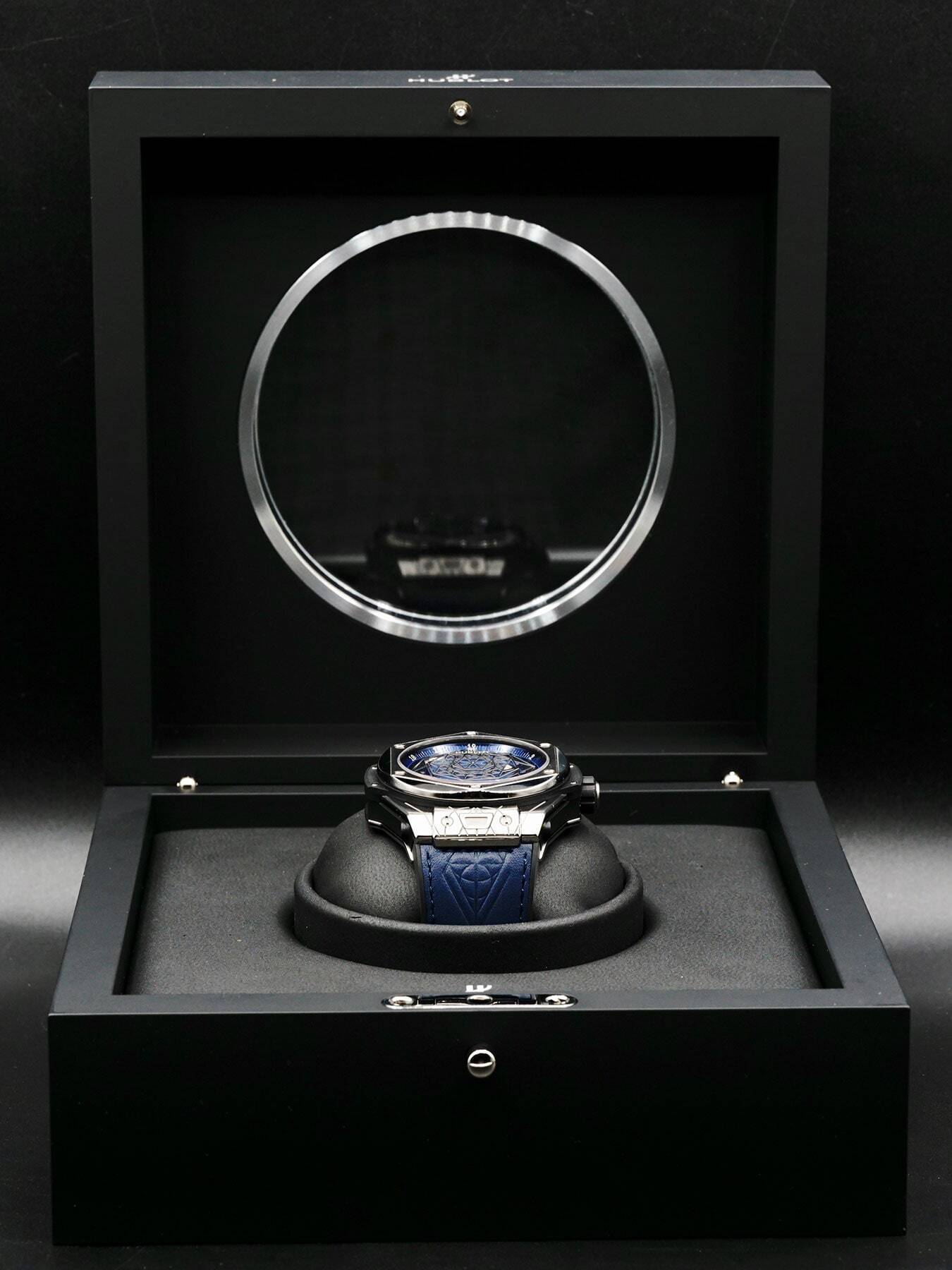 This Hublot Big Bang Sang Bleu 415.NX.7179.VR.MXM18 is in EXCELLENT condition. This watch includes its original box. Limited Edition of 200 pieces.