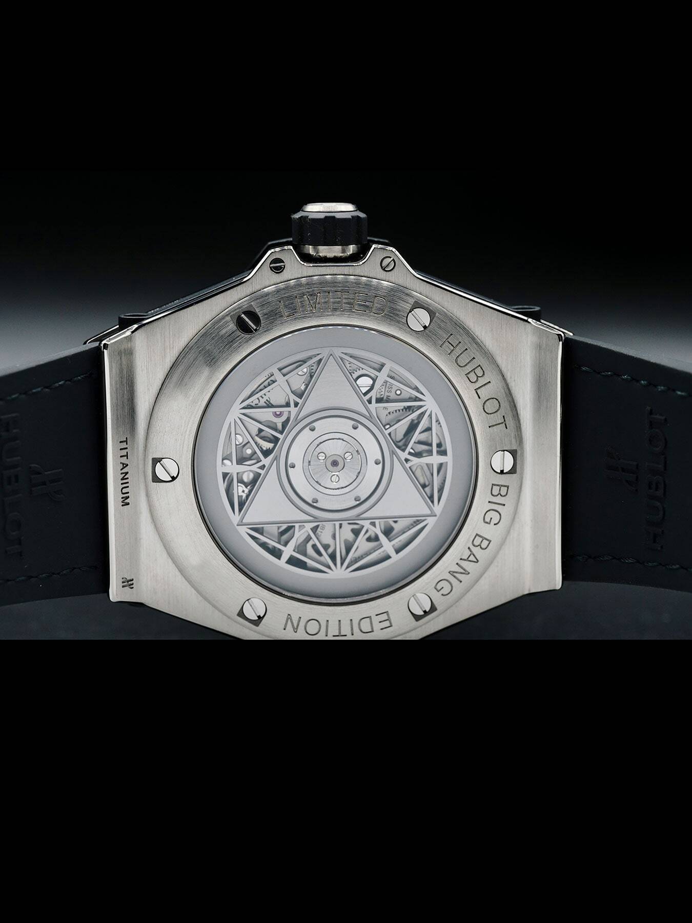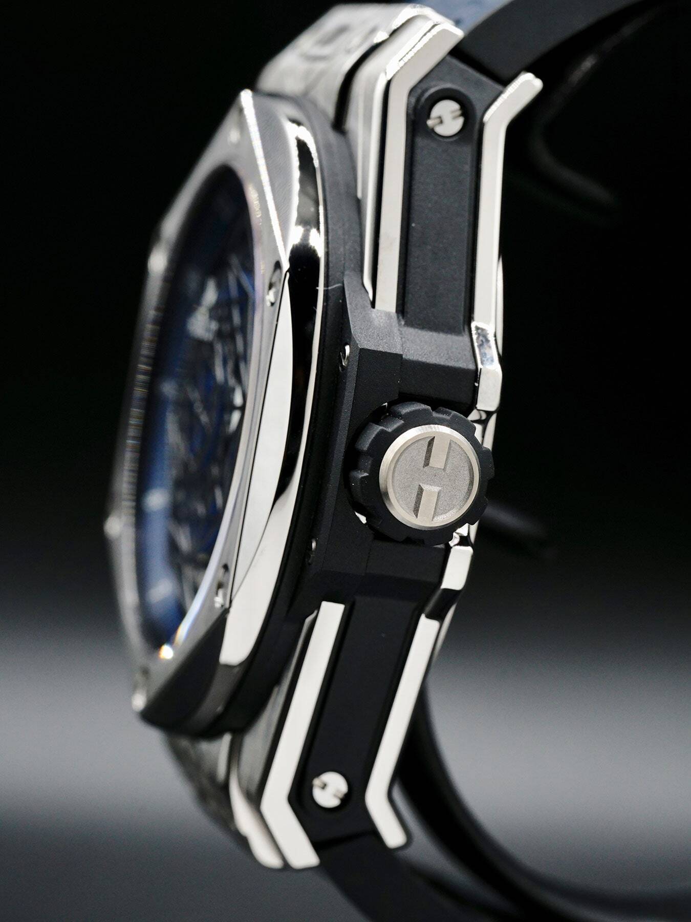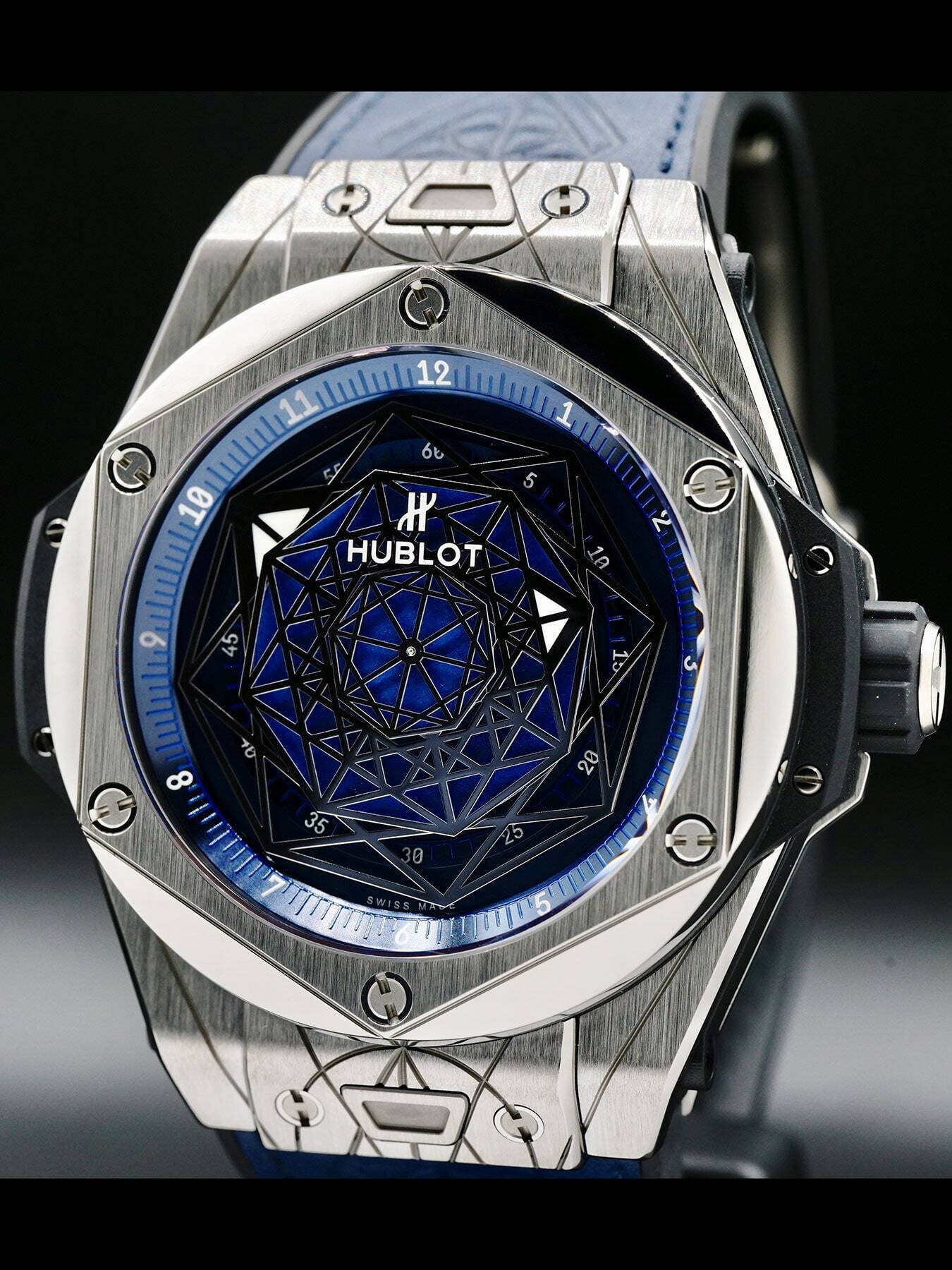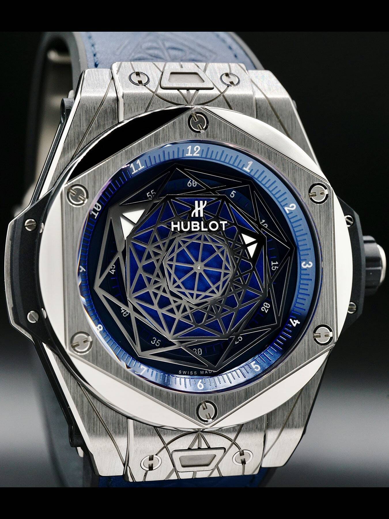 This Hublot Big Bang Sang Bleu features a 45mm polished titanium case & bezel with a transparent case back on a blue leather-rubber strap. This watch also showcases a blue dial with octagonal skeleton hands covered by scratch resistant sapphire crystal.