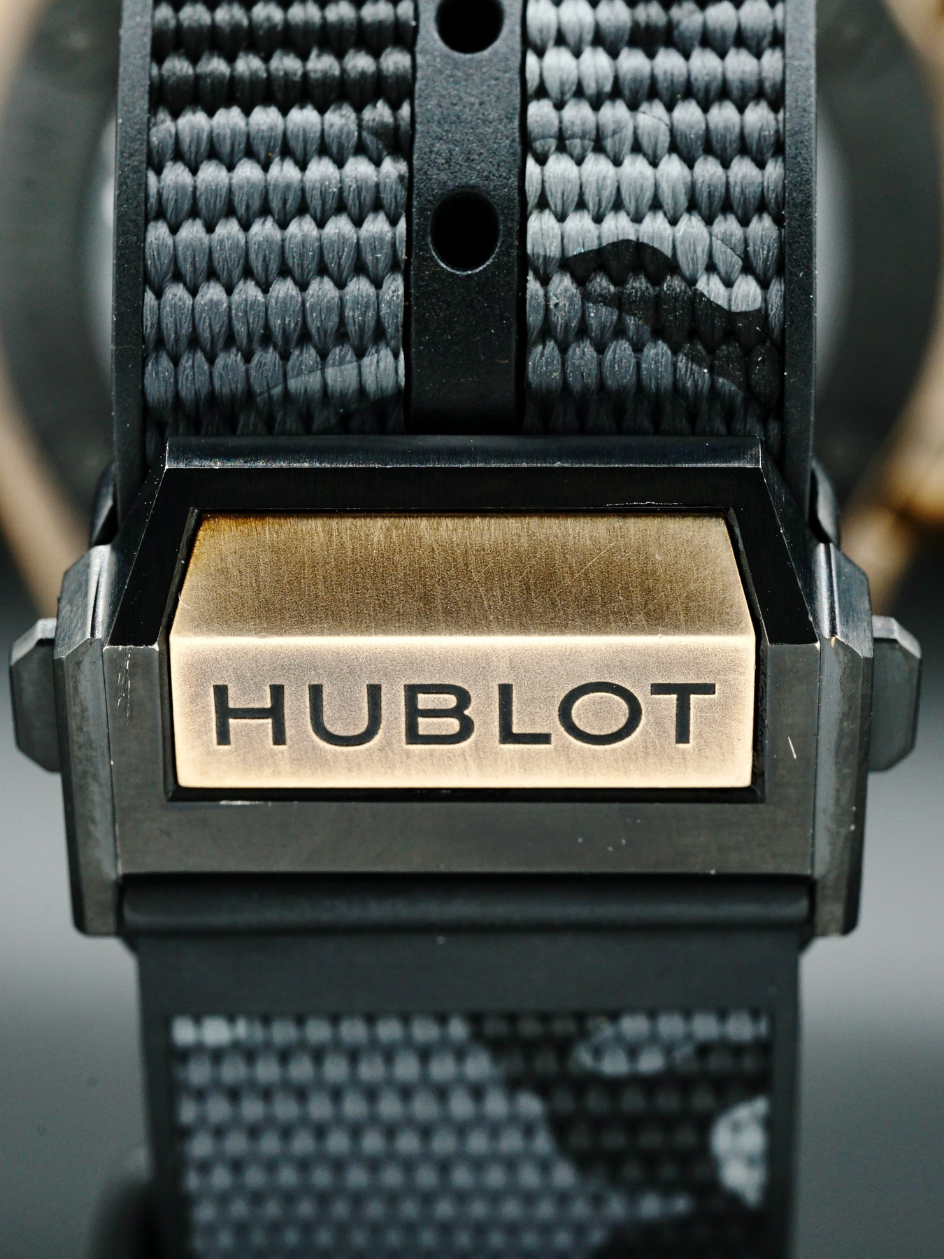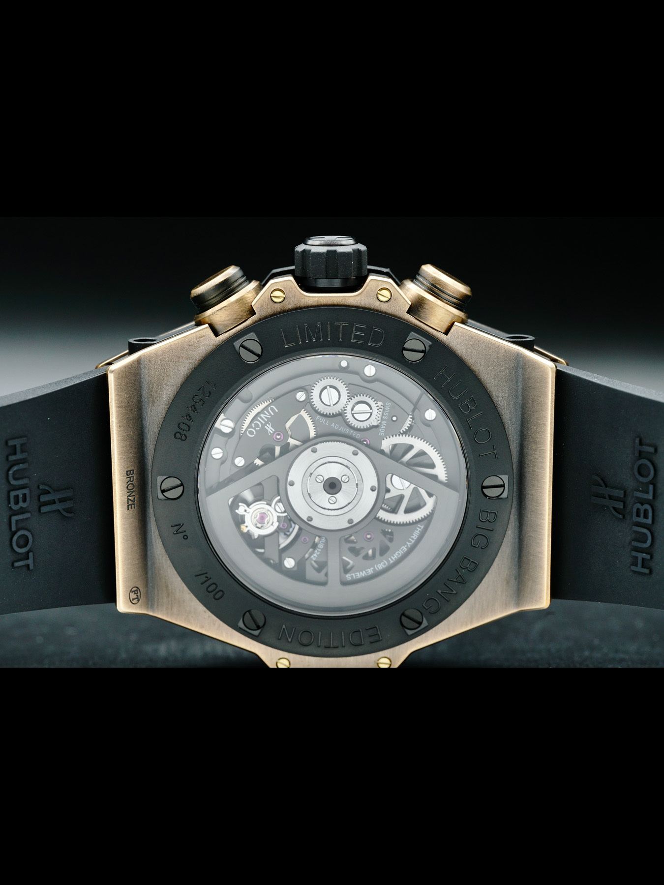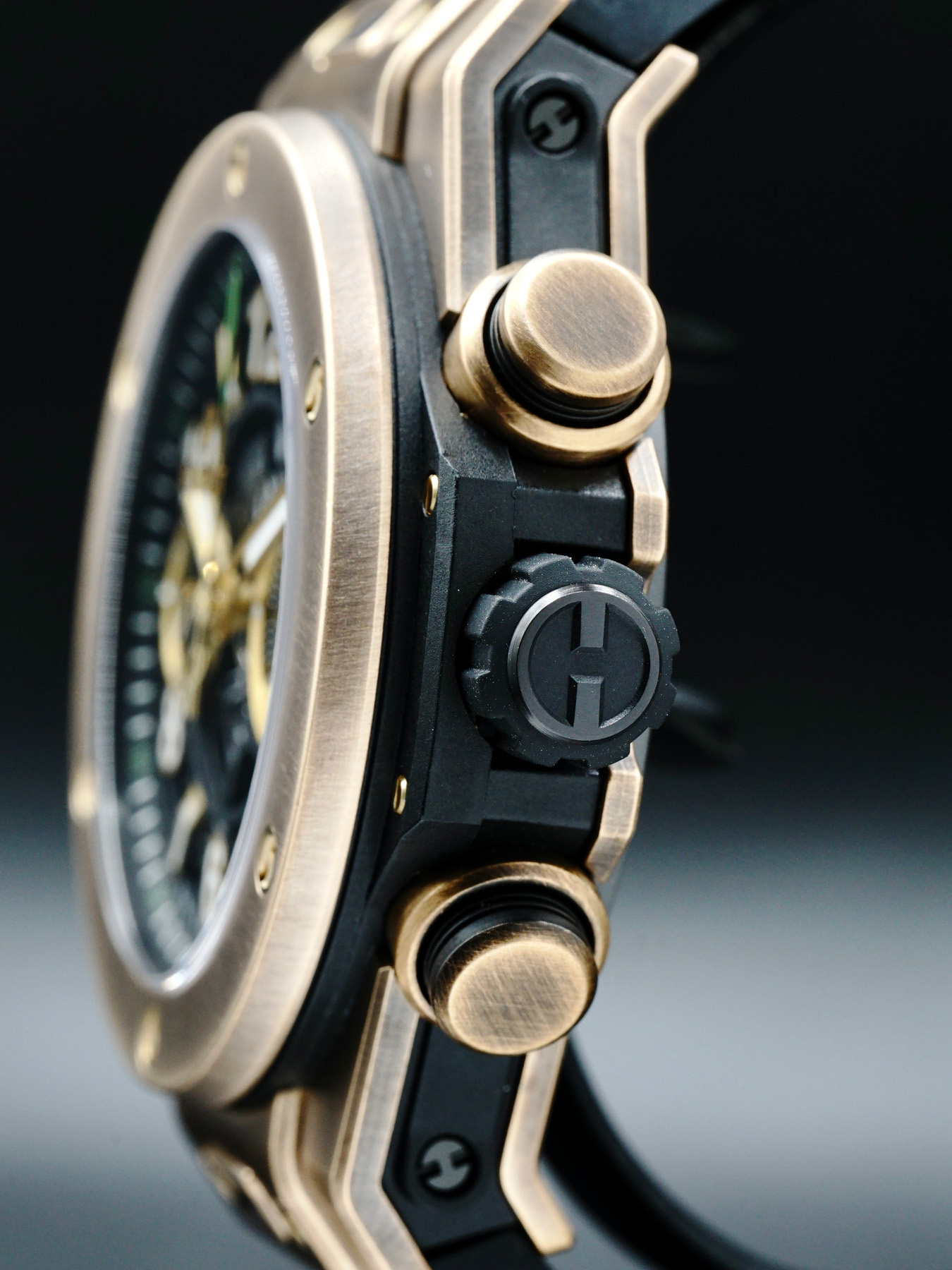 For the first time, Hublot has cut its Big Bang case out of bronze, a material created in 3000 BC that has the advantages of non-magnetism, resistance to corrosion and a unique appearance. While it is not stainless, bronze is covered with a natural patina that protects it and gives it an unparalleled finish. The case back is in black ceramic whereas the screws are in 3N gold. Tanned and burnished by hand, each strap and case are different and unique. Time will add distinction and character to the Big Bang Bavaria Just like leather, the Hublot bronze, with its yellow pink tones, becomes enhanced over time.