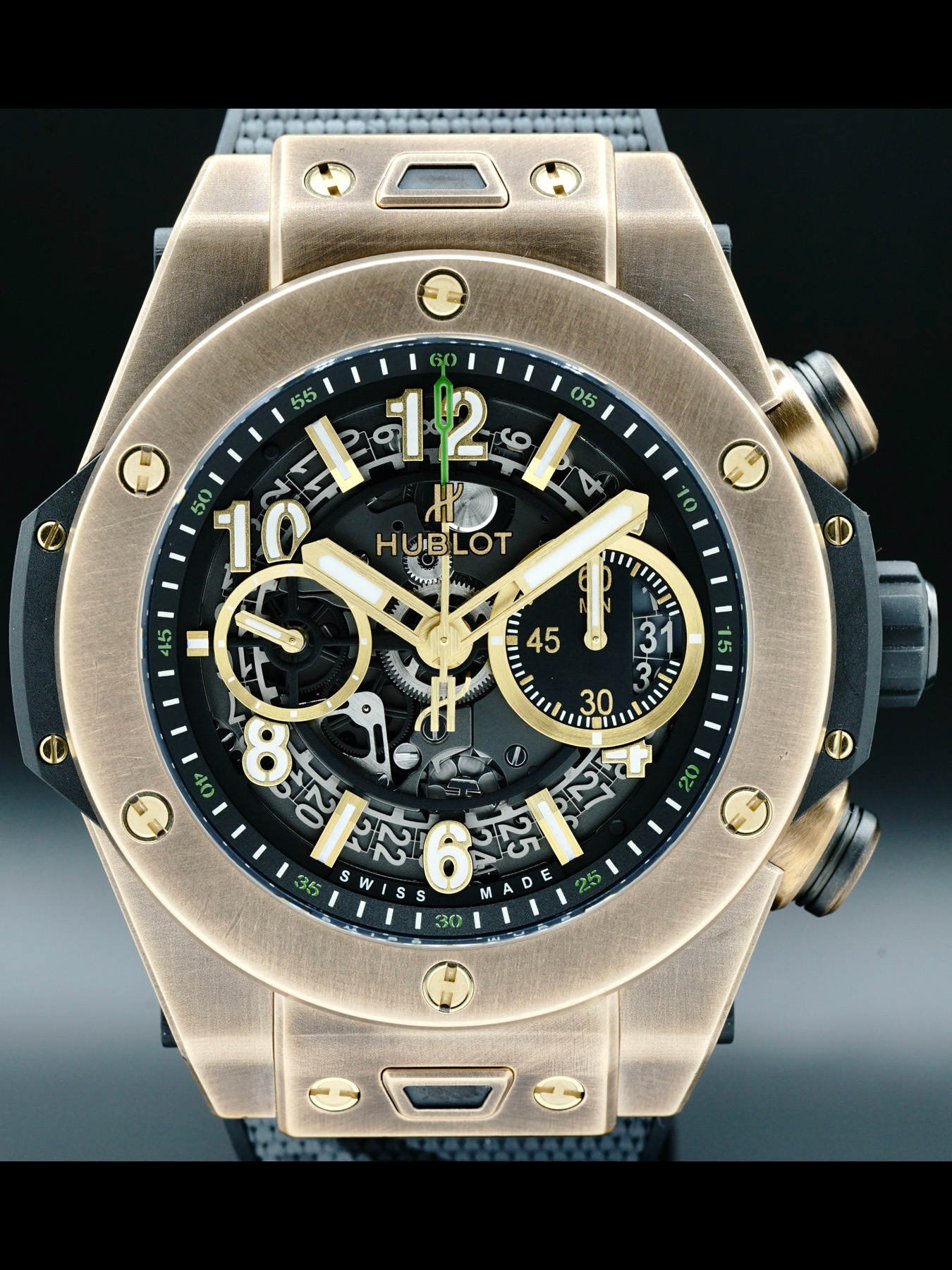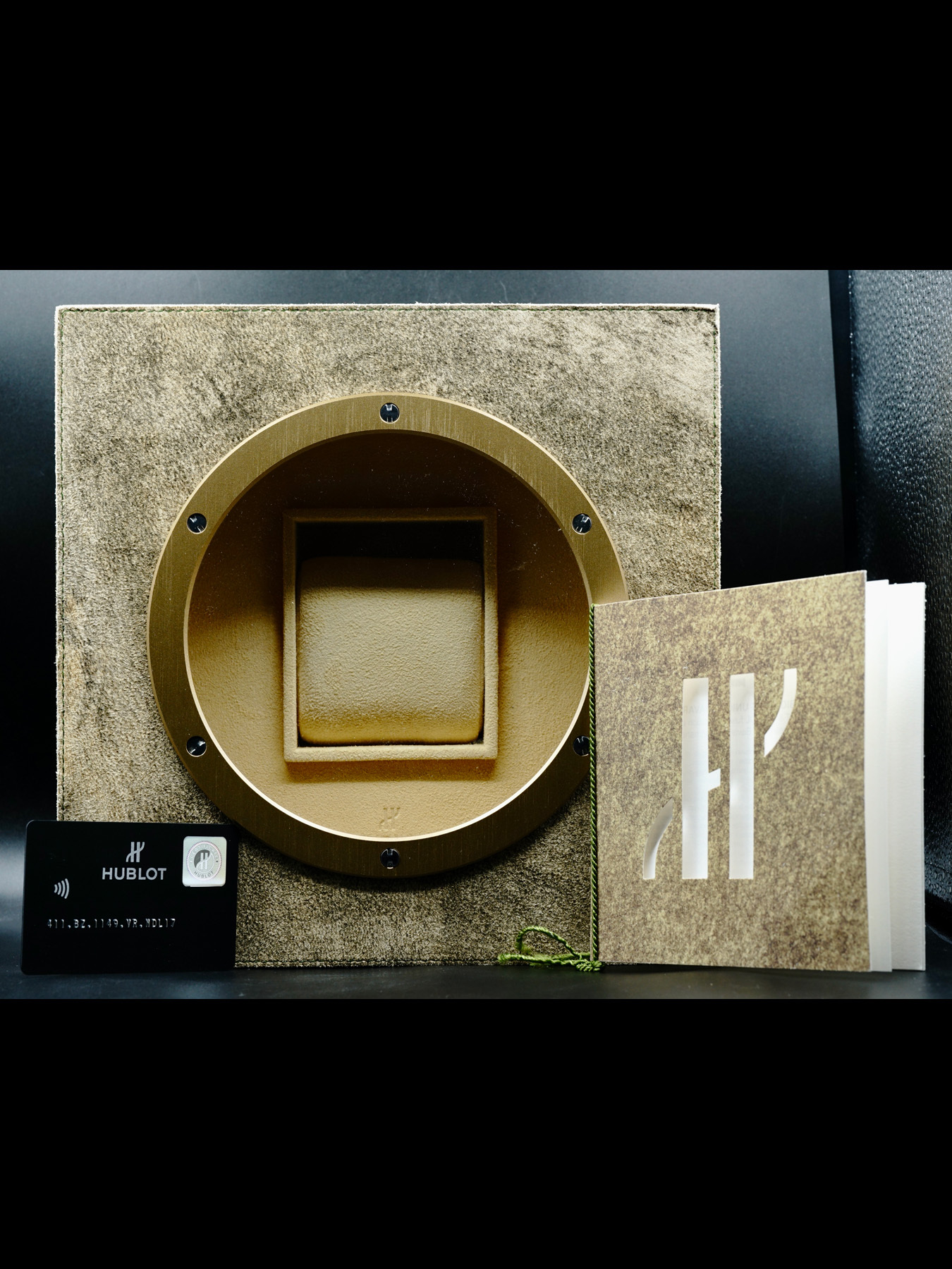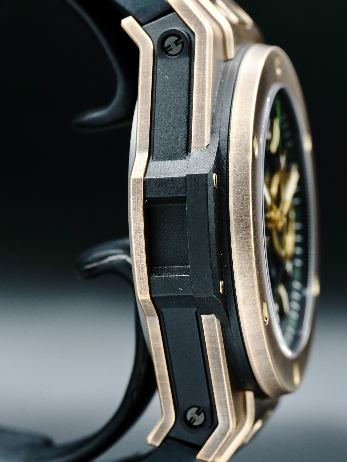 For the first time, Hublot has cut its Big Bang case out of bronze, a material created in 3000 BC that has the advantages of non-magnetism, resistance to corrosion and a unique appearance. While it is not stainless, bronze is covered with a natural patina that protects it and gives it an unparalleled finish. The case back is in black ceramic whereas the screws are in 3N gold. Tanned and burnished by hand, each strap and case are different and unique. Time will add distinction and character to the Big Bang Bavaria Just like leather, the Hublot bronze, with its yellow pink tones, becomes enhanced over time.