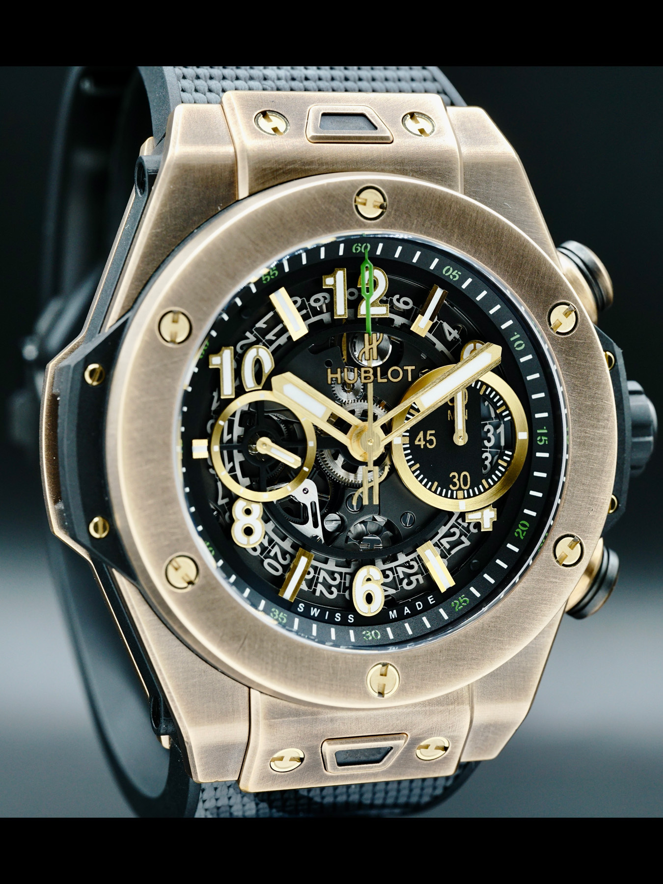 The Big Bang Bavaria beats to the rhythm of Unico, the Hublot manufacture movement, with 330 components for a 72-hour power reserve—a self-winding bidirectional movement with a flyback chronograph and a column wheel on the side of the dial.