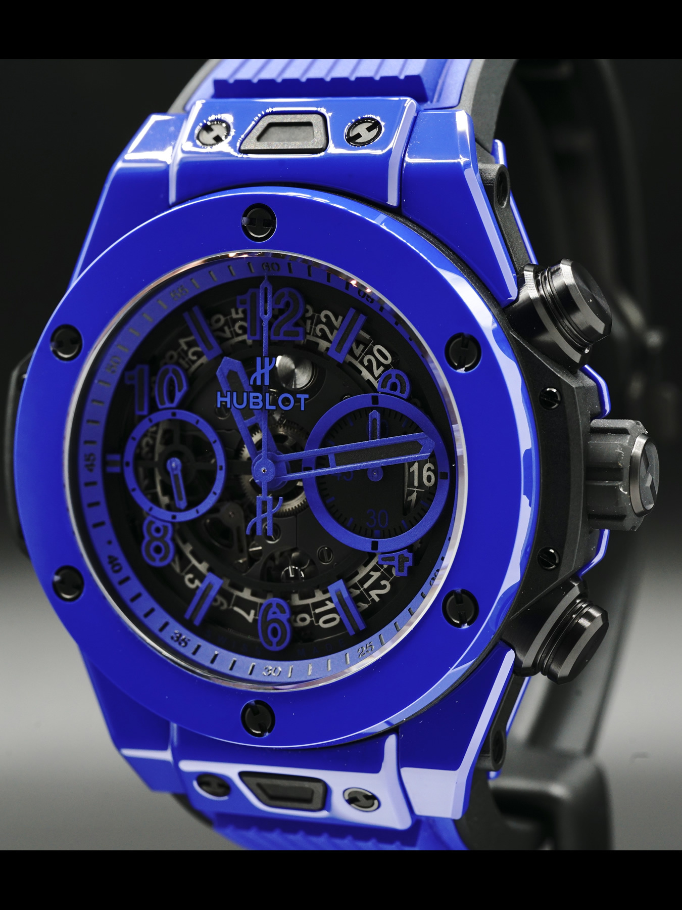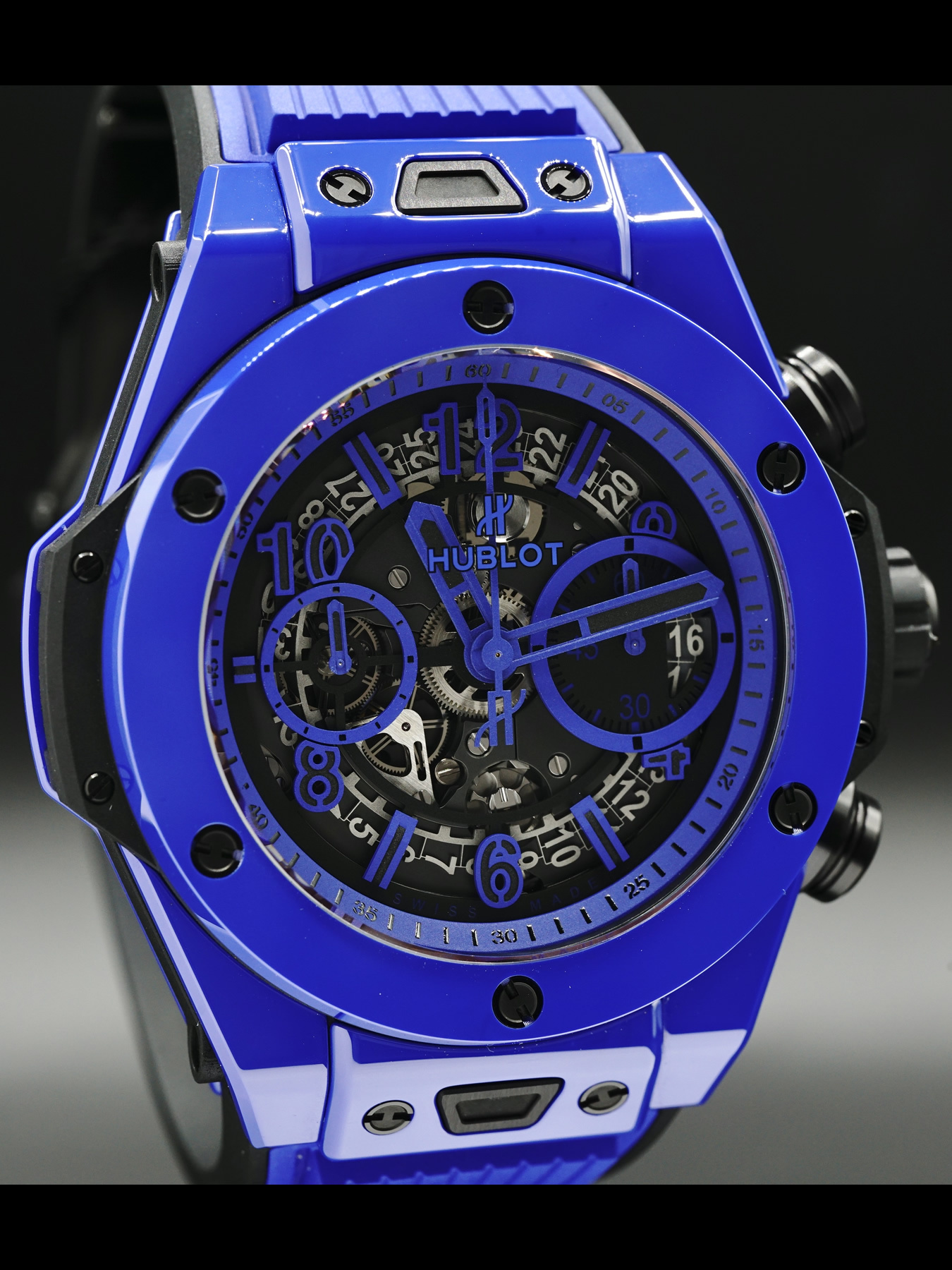 This Hublot Big Bang Unico Blue Magic features a 45mm ceramic case with a transparent caseback on a blue rubber strap. This watch also showcases a blue dial with luminous hands covered by scratch-resistant sapphire crystal.