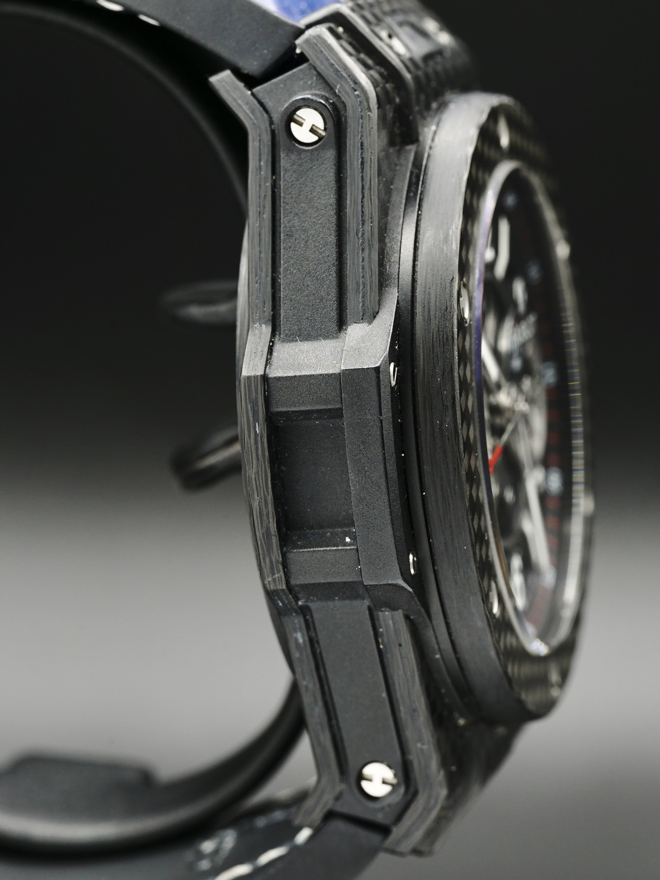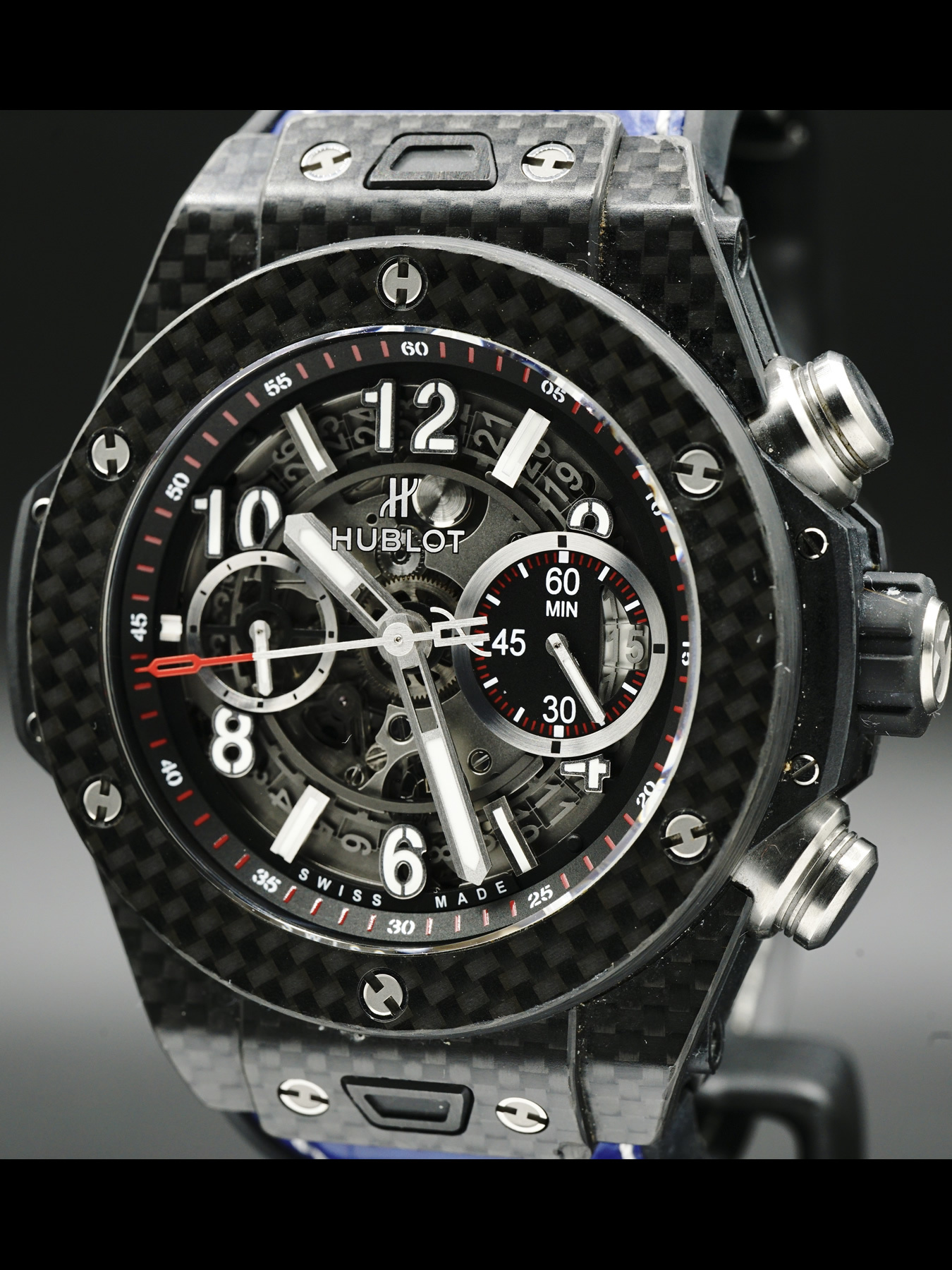 This Hublot Big Bang Unico Carbon features a 45mm carbon fiber case and aluminum, carbon fiber bezel. This watch sports a skeleton colored dial covered by anti-reflective sapphire crystal.