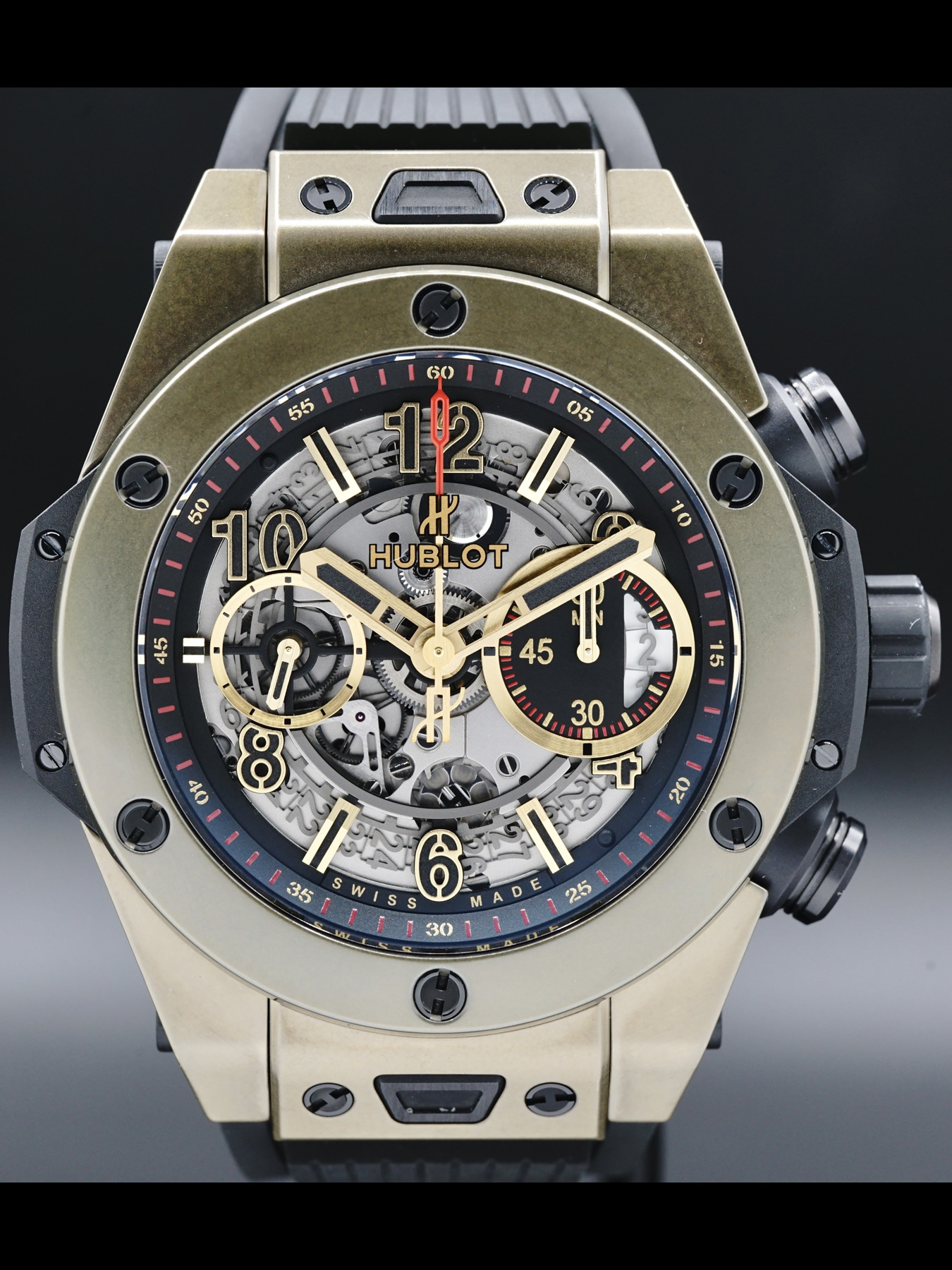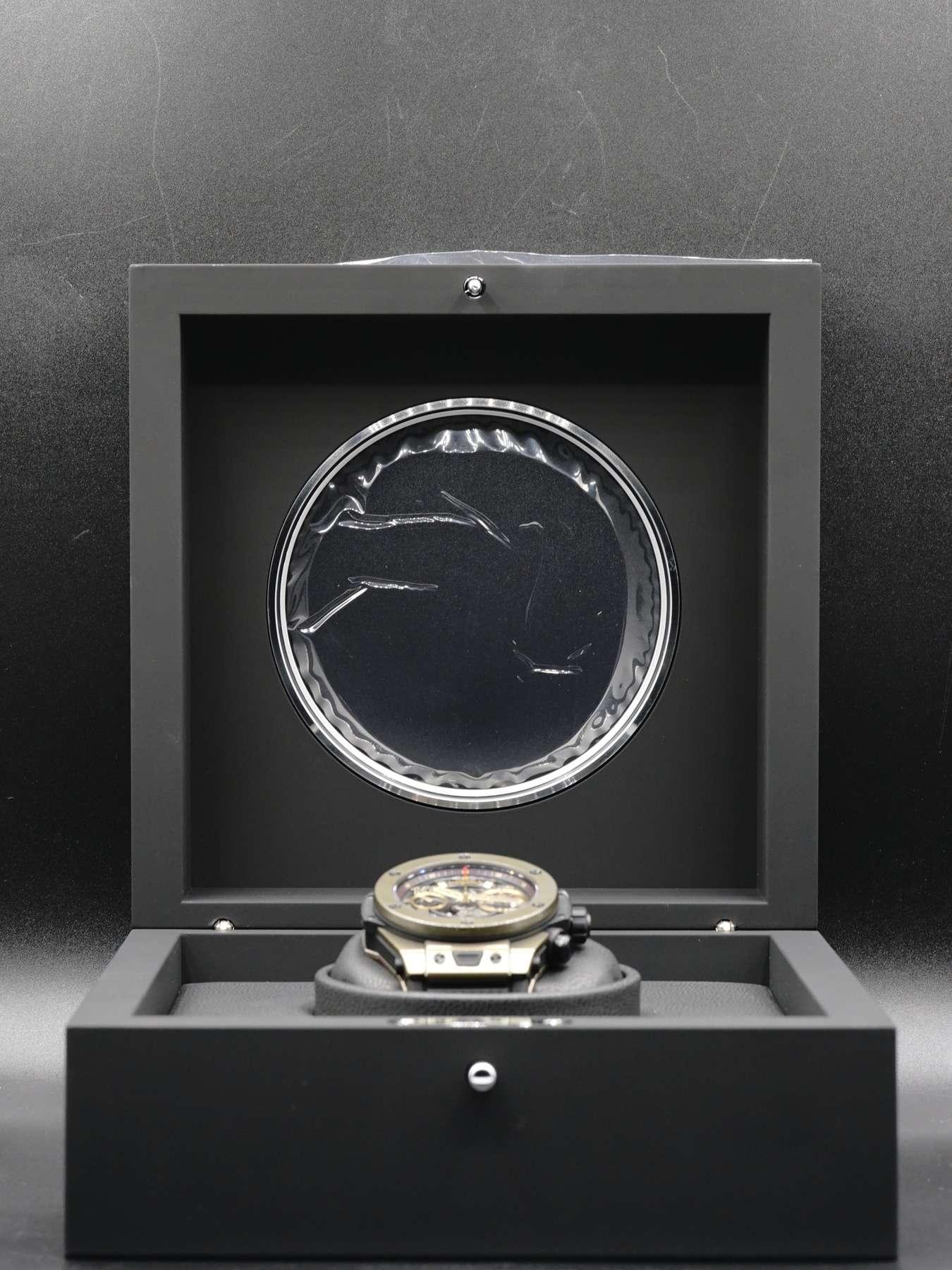 This Hublot Big Bang Unico Full Magic Gold 411.MX.1138.RX is in AS NEW condition. This watch includes its original box. Limited Edition of 250 pieces.