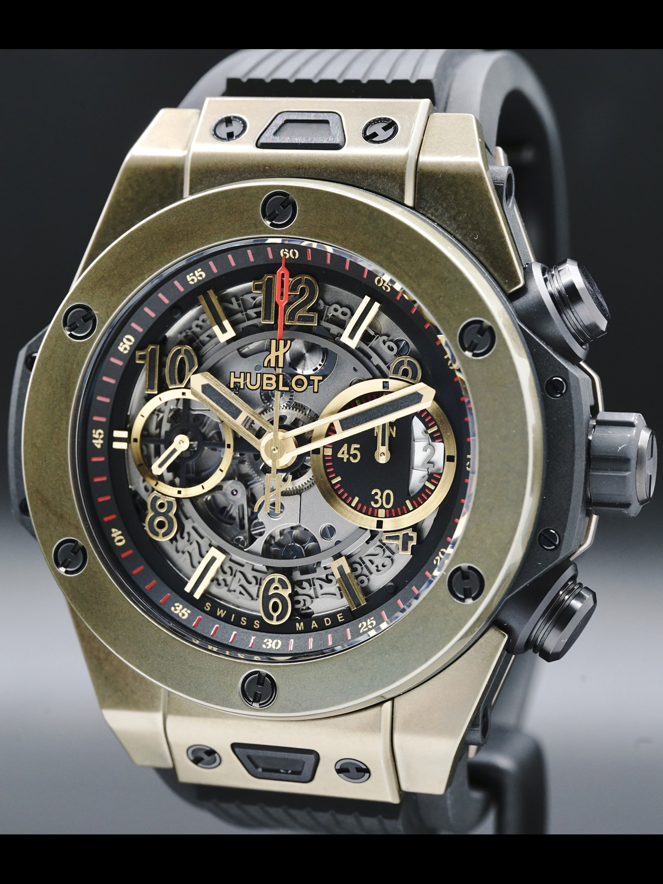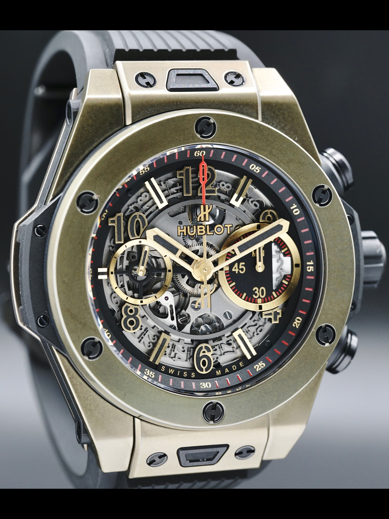 This Hublot Big Bang Unico Full Magic Gold features a 45mm polished 18k Magic Gold case with an exhibition case back on a black rubber strap. This watch also features a skeleton dial with gold hands covered by scratch-resistant sapphire crystal.
