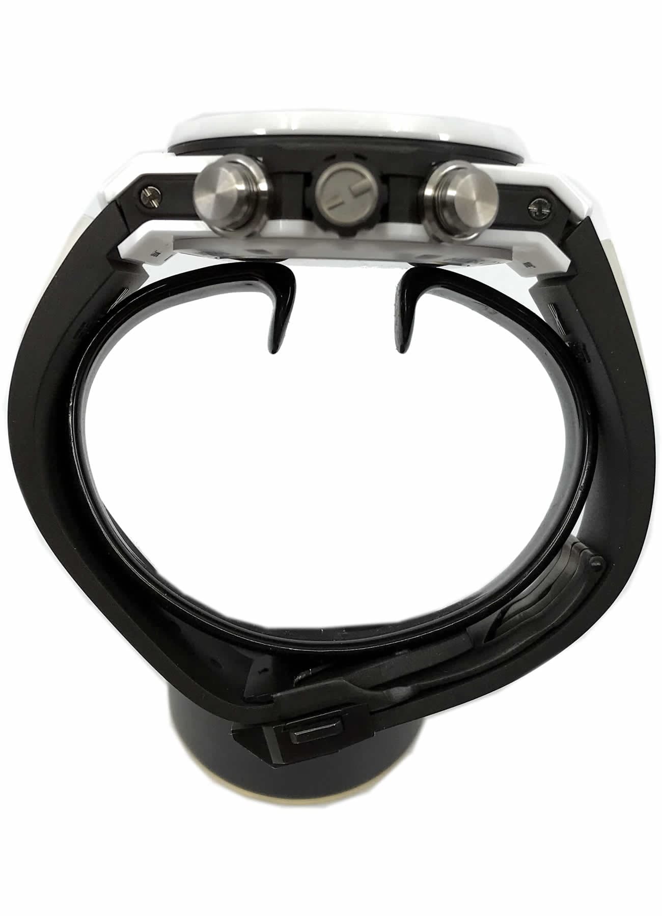 - This timepiece features a 45mm ceramic case paired with a high quality rubber strap. It showcases a distinctive skeleton dial and is powered by a precise automatic winding movement. The watch is designed with a water resistance of up to 100m.