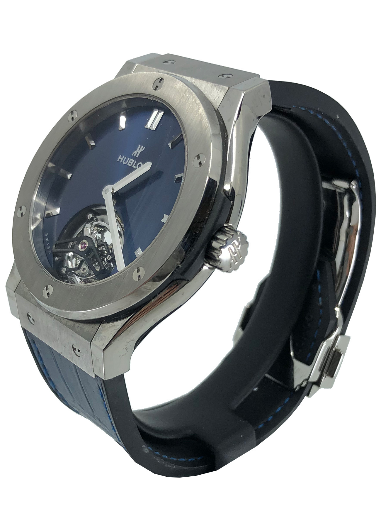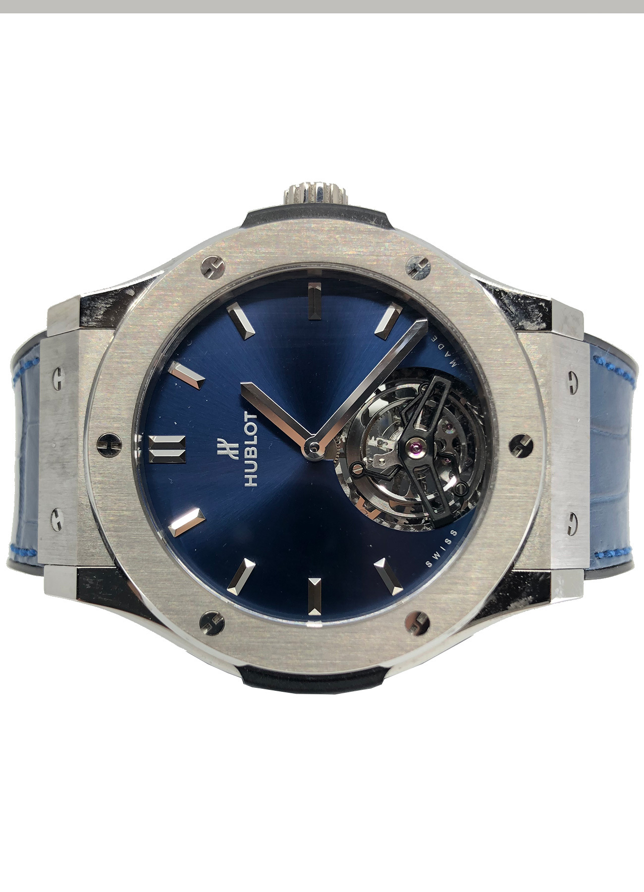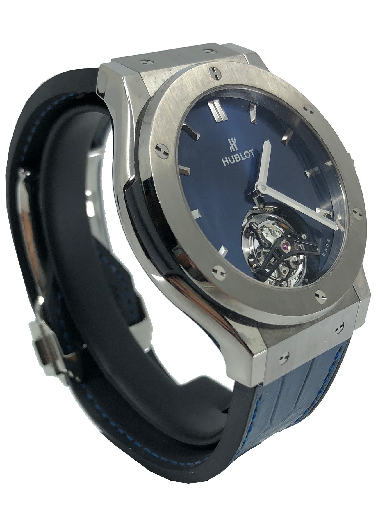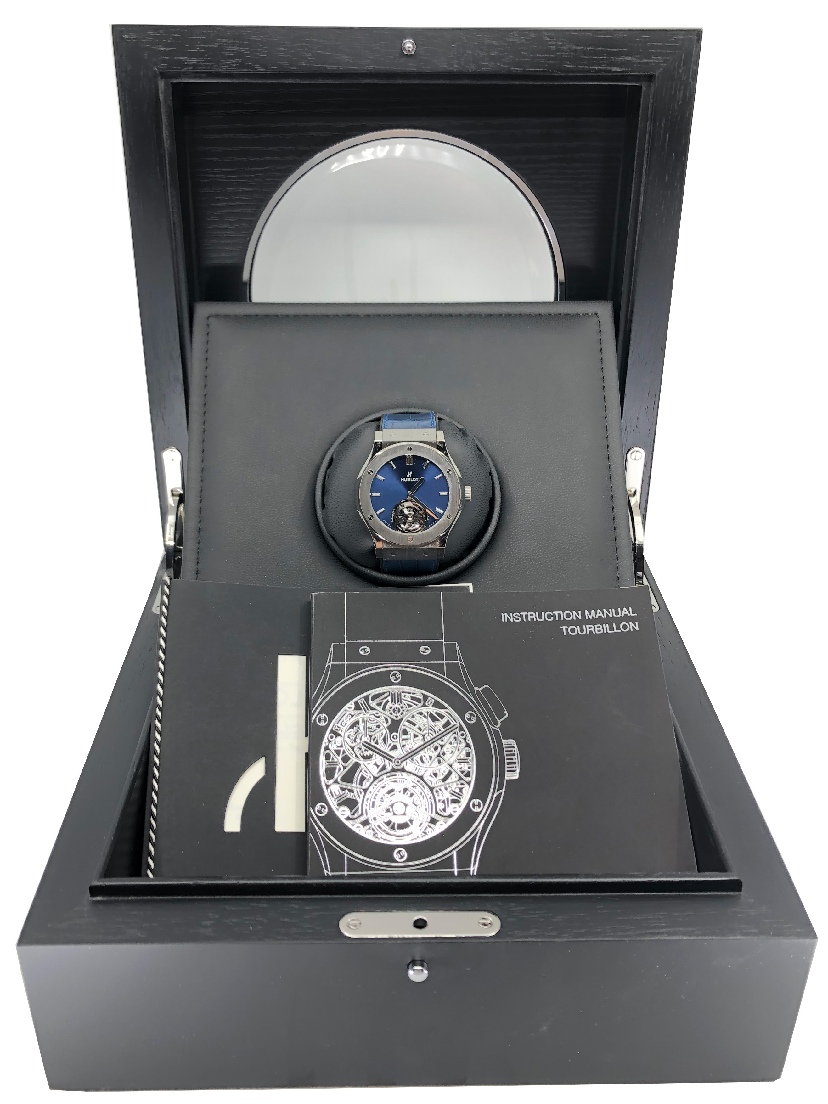 This Hublot Classic Fusion Tourbillon Porto Cervo Titanium 505.NX.7170.LR.PCM14 is in UNWORN condition. It has boxes, instruction booklet and warranty card. This watch has been fully authenticated and certified by Exquisite Timepieces.