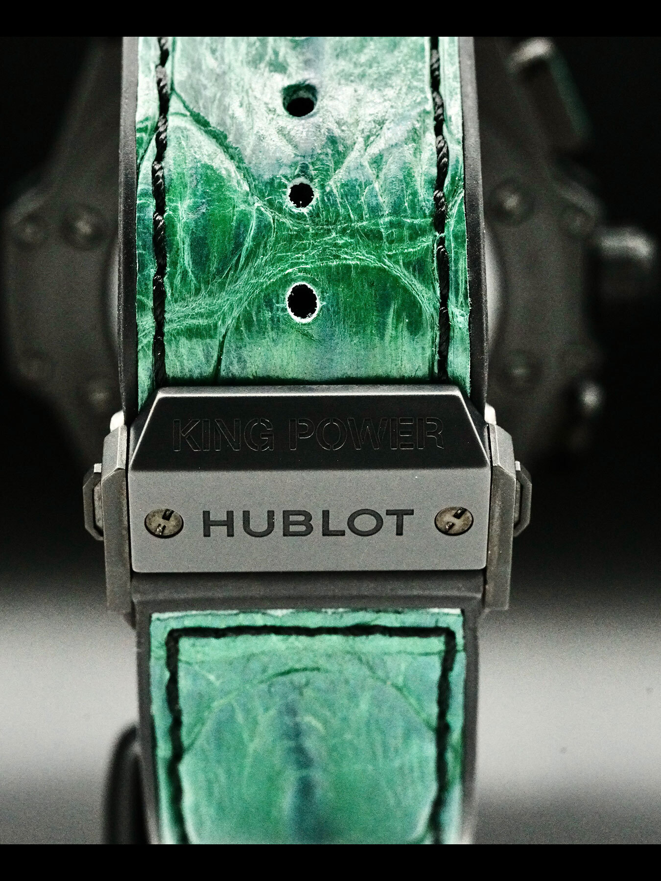 This Hublot King Power Floyd Money Mayweather WBC World Champion Edition features a 44mm black ceramic case with a display case back on a green leather strap. This watch also showcases a gold dial with green/gold hands and index dial markers covered by scratch resistant sapphire crystal. Mechanical Automatic Movement.