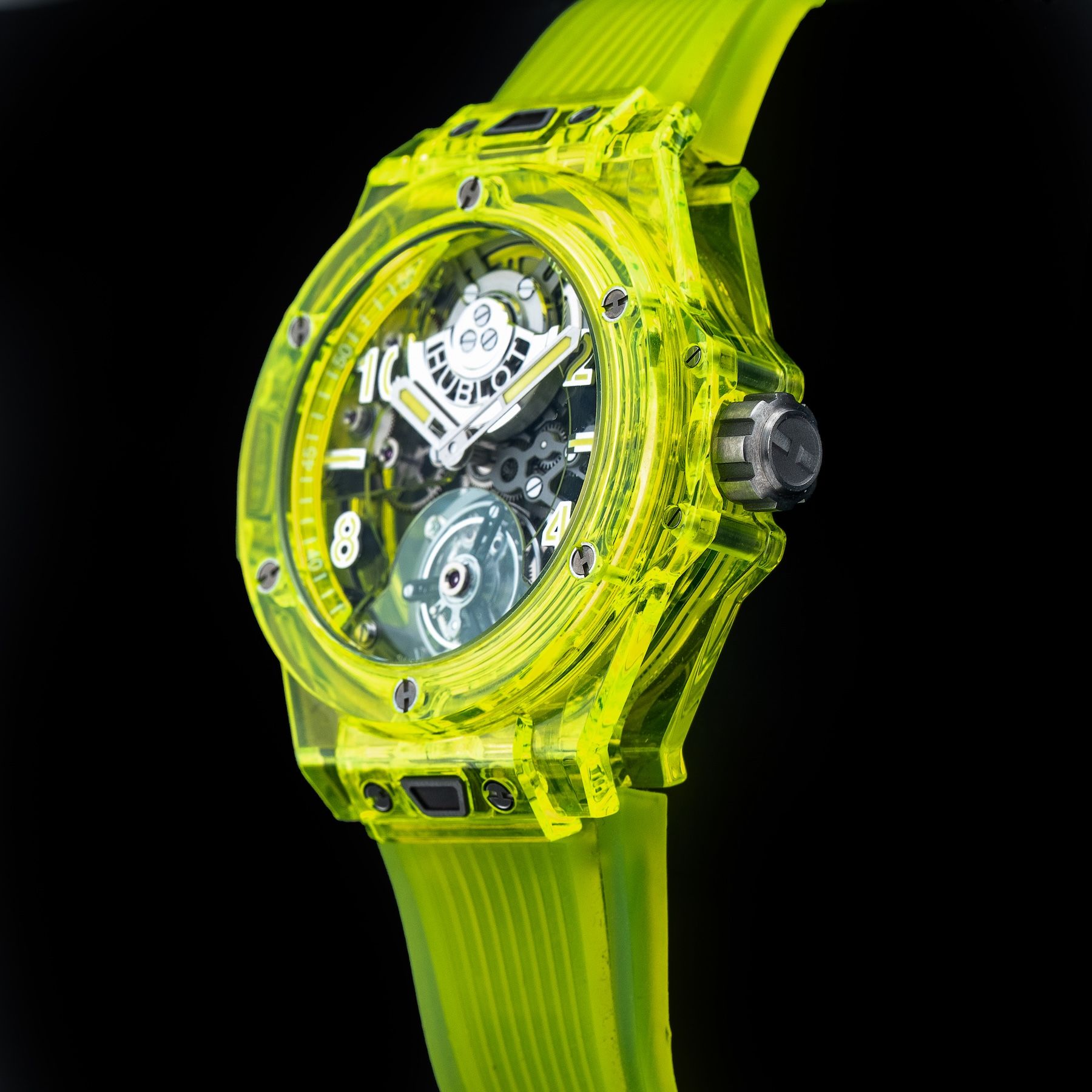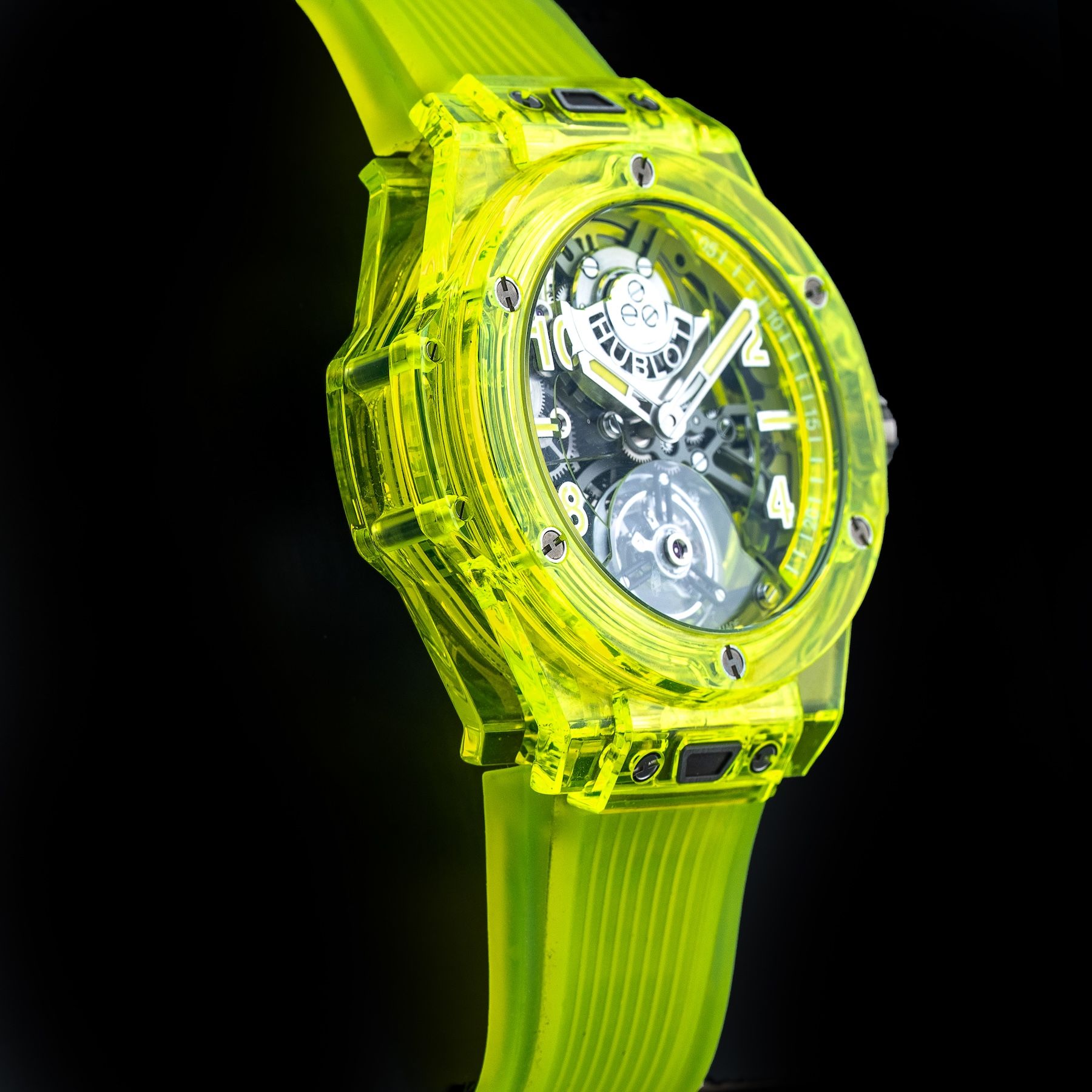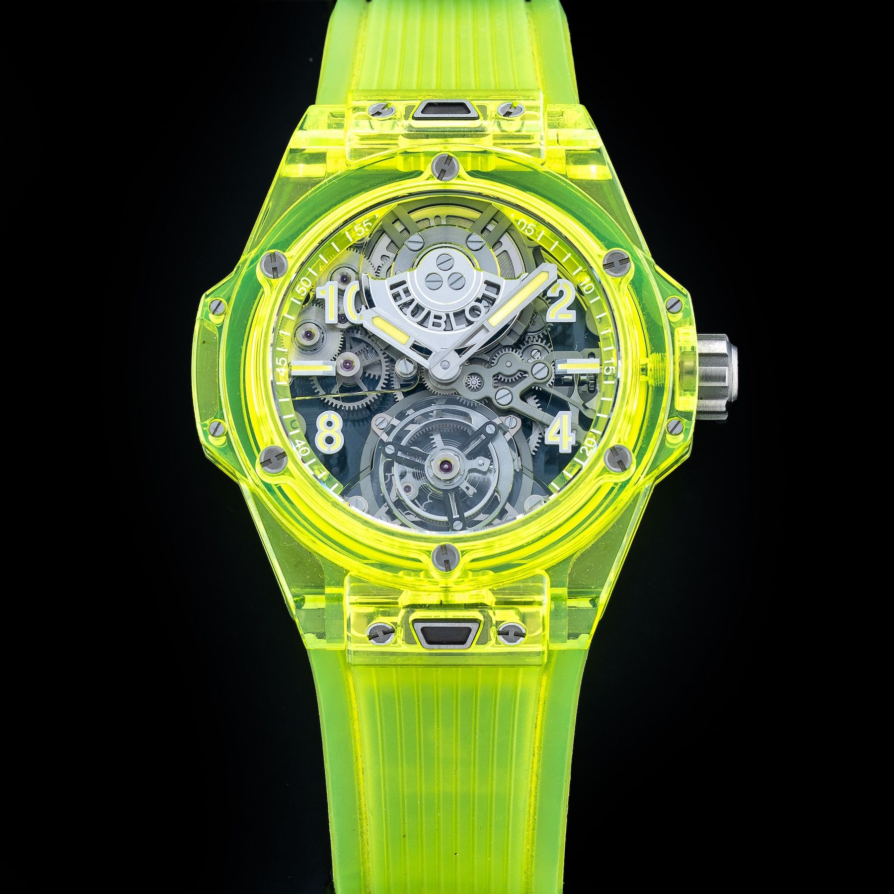 This watch features a 44mm polished and microblasted yellow neon saxem case on rubber strap. This watch also sports a sapphire crystal dial. Powered by an automatic tourbillon movement. Water resistance up to 30 meters.