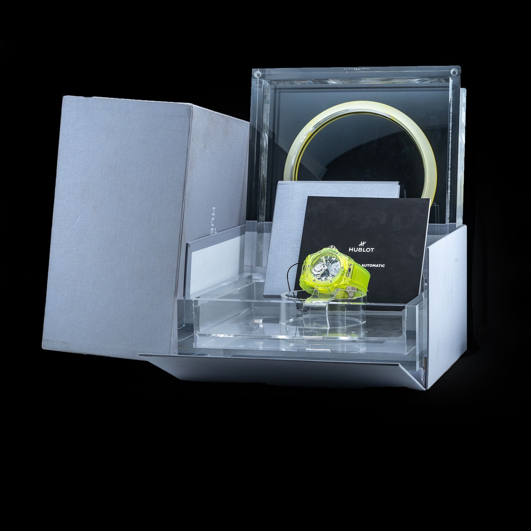 This Hublot Tourbillon Automatic Yellow Neon Saxem 429.JY.0120.RT is in GREAT condition. This watch includes its Original Box, Original Papers. This watch has been fully authenticated and certified by Exquisite Timepieces. Please note, the photos shown are of the actual watch you will receive.