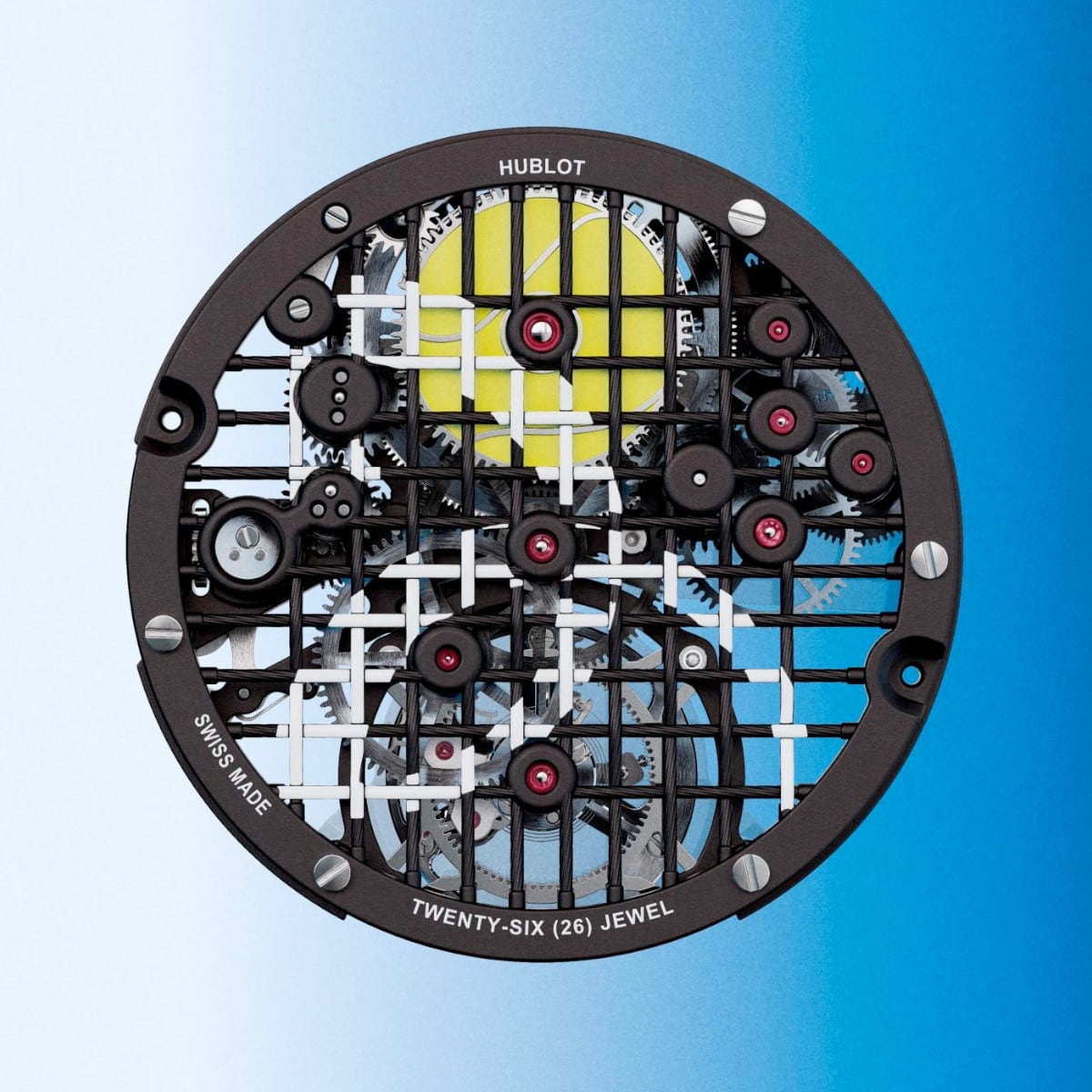 Novak’s incredible story continues in the Hublot Big Bang Tourbillon Novak Djokovic GOAT Edition’s movement, the highly conceptual MHUB6035 Automatic Tourbillon. In place of a traditional, solid mainplate to hold the movement components in place, Hublot’s engineers conceived an eye-catching three-dimensional lattice that takes the shape of tennis racquet strings. Each “string” is just 0.55mm thick and appears to be secured into the mainplate edge by attachment points that echo those found around the inner rim of a tennis racquet. The gaps between the strings are intentionally irregular, as they would be on a tennis racquet mid-match.