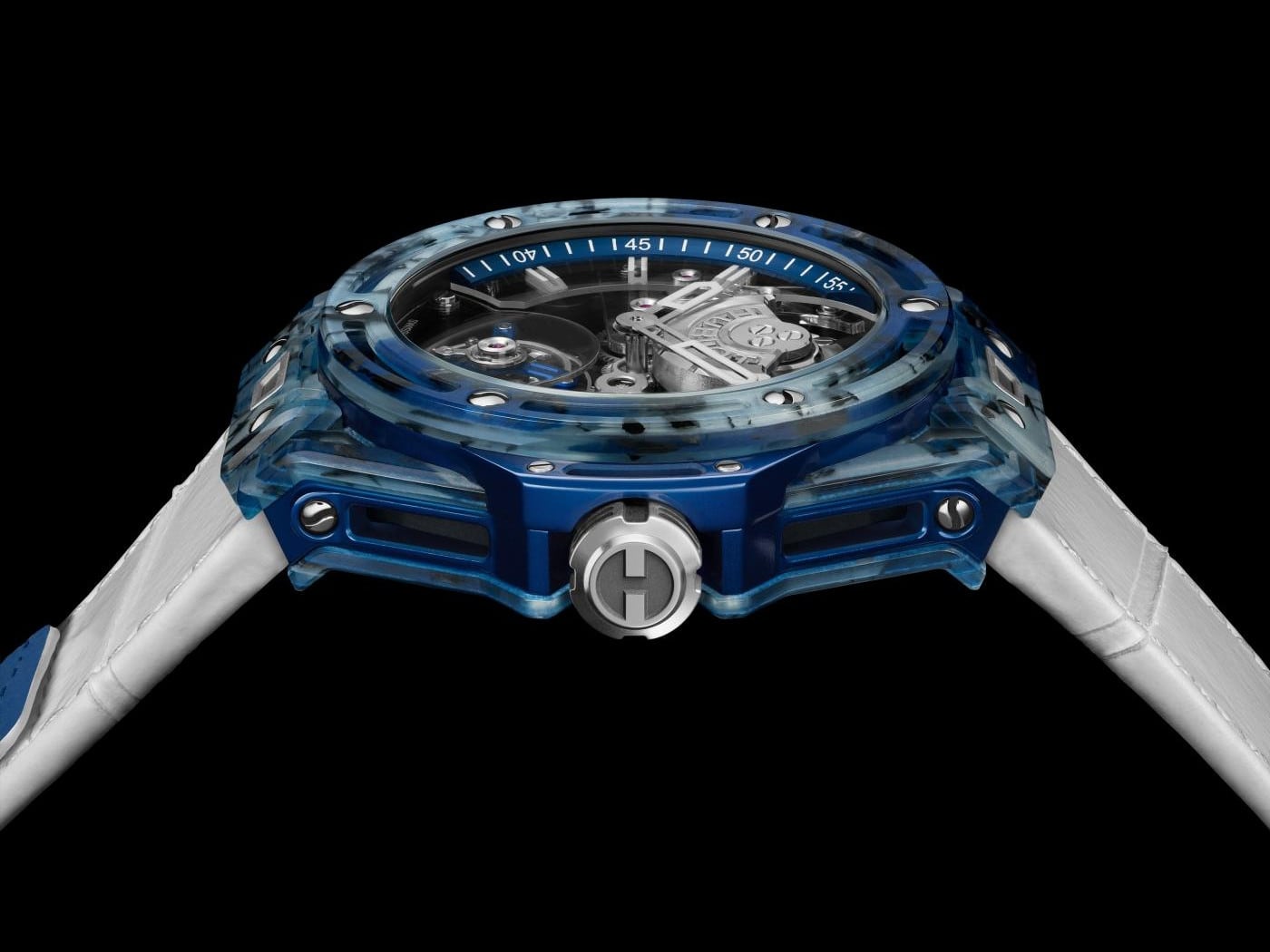 The six titanium screws that hold the composite bezel in place are shaped like tennis balls. This might sound like a simple aesthetic twist, but as well as creating a bespoke programme for machining these unique screws, Hublot’s engineers had to design a special S-shaped screwdriver head that could tighten the screws, a process reminiscent of one developed previously for the Big Bang’s famous H-shaped screw heads.