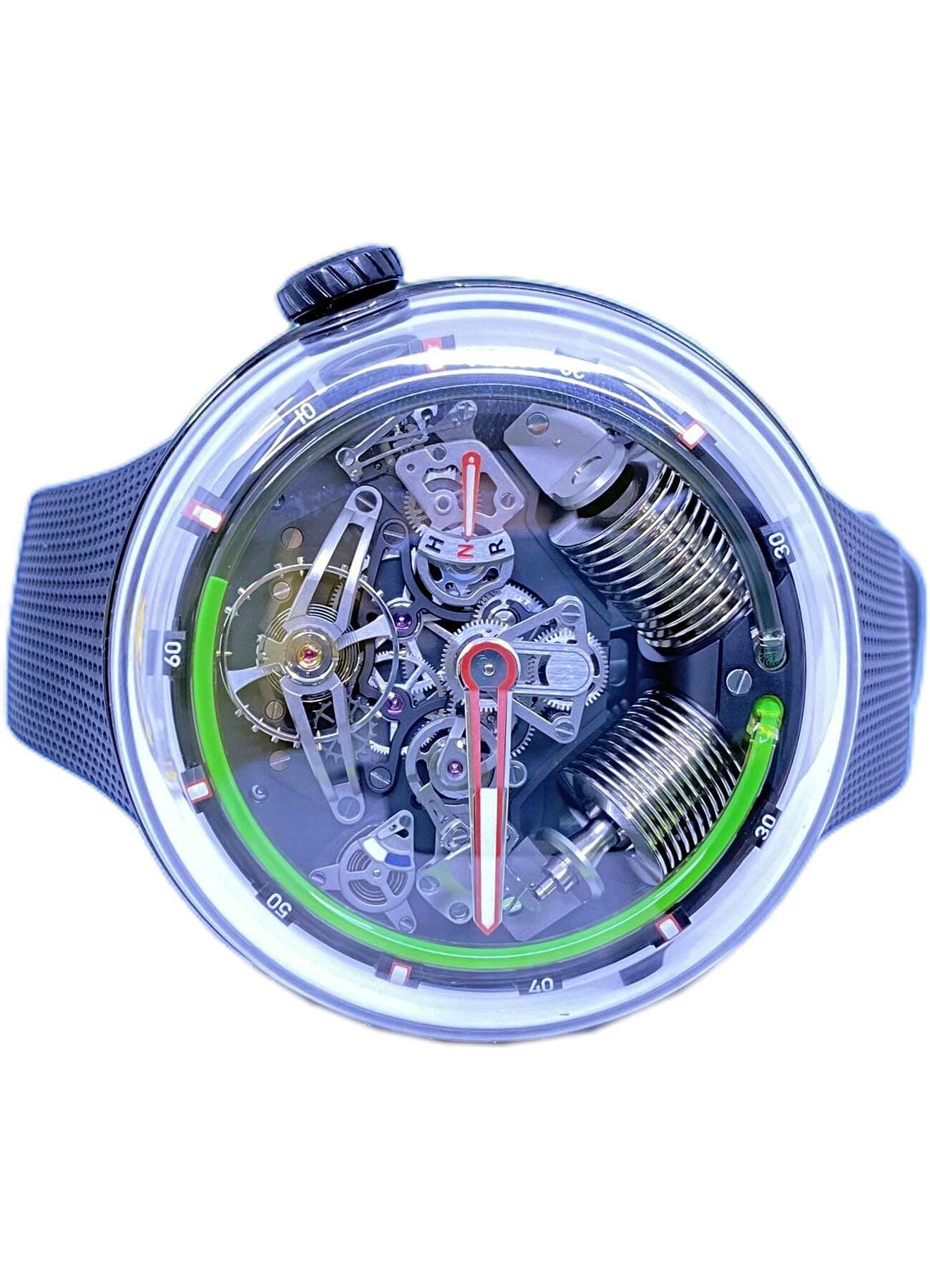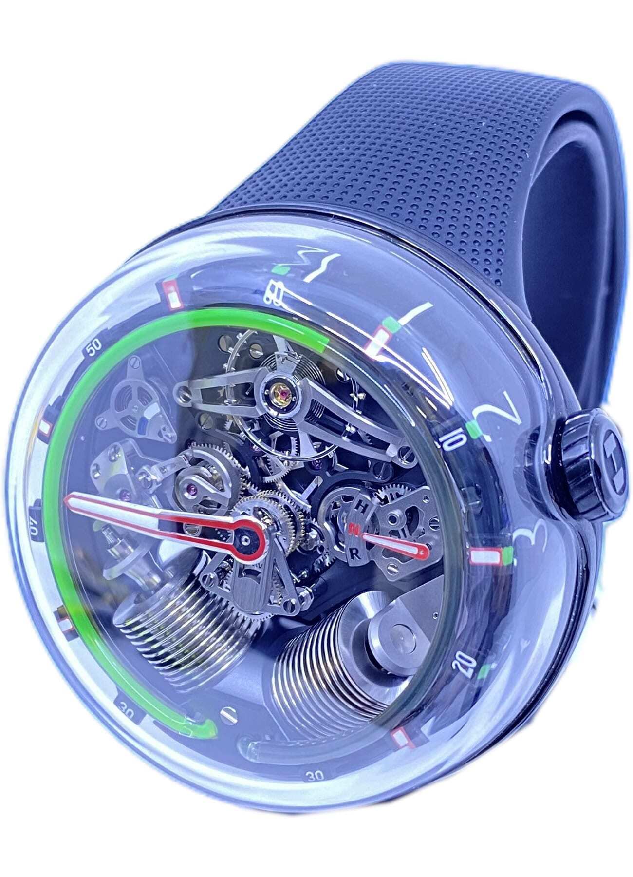 Green fluidic hours, Phase shift minutes, Crown position indicator (Hours-Neutral-Rewind), Thermal indicator, Power reserve