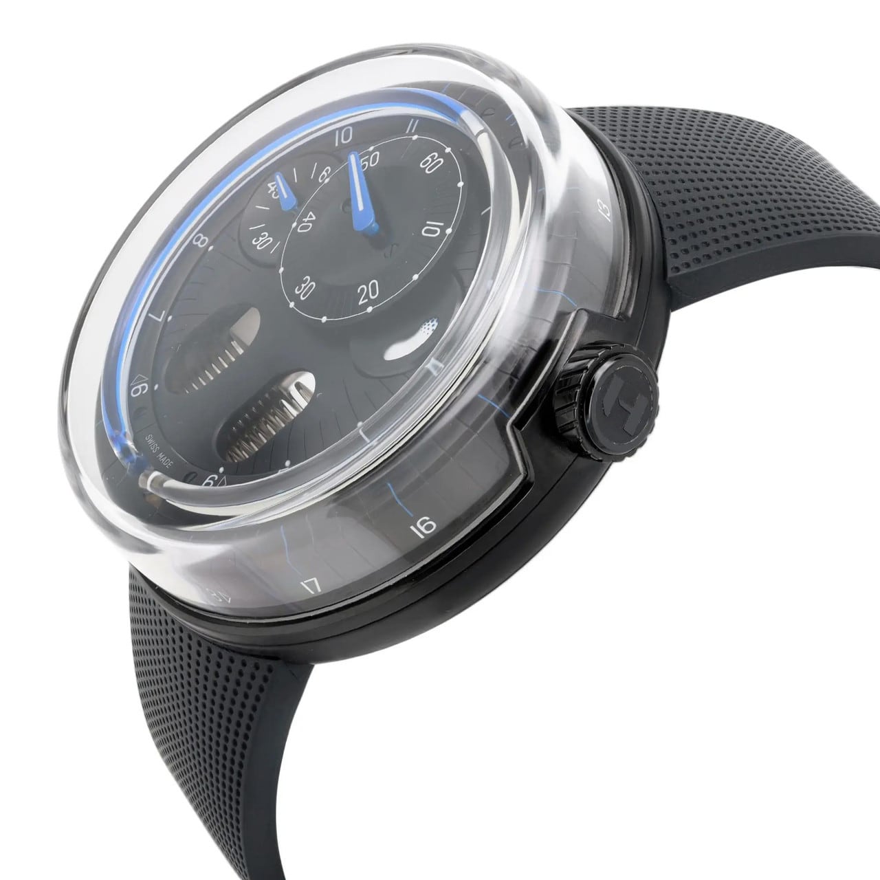 - This timepiece features a 48mm steel case paired with a high quality rubber strap. It showcases a distinctive black dial and is powered by a precise manual winding movement. The watch is designed with a water resistance of up to 30m.