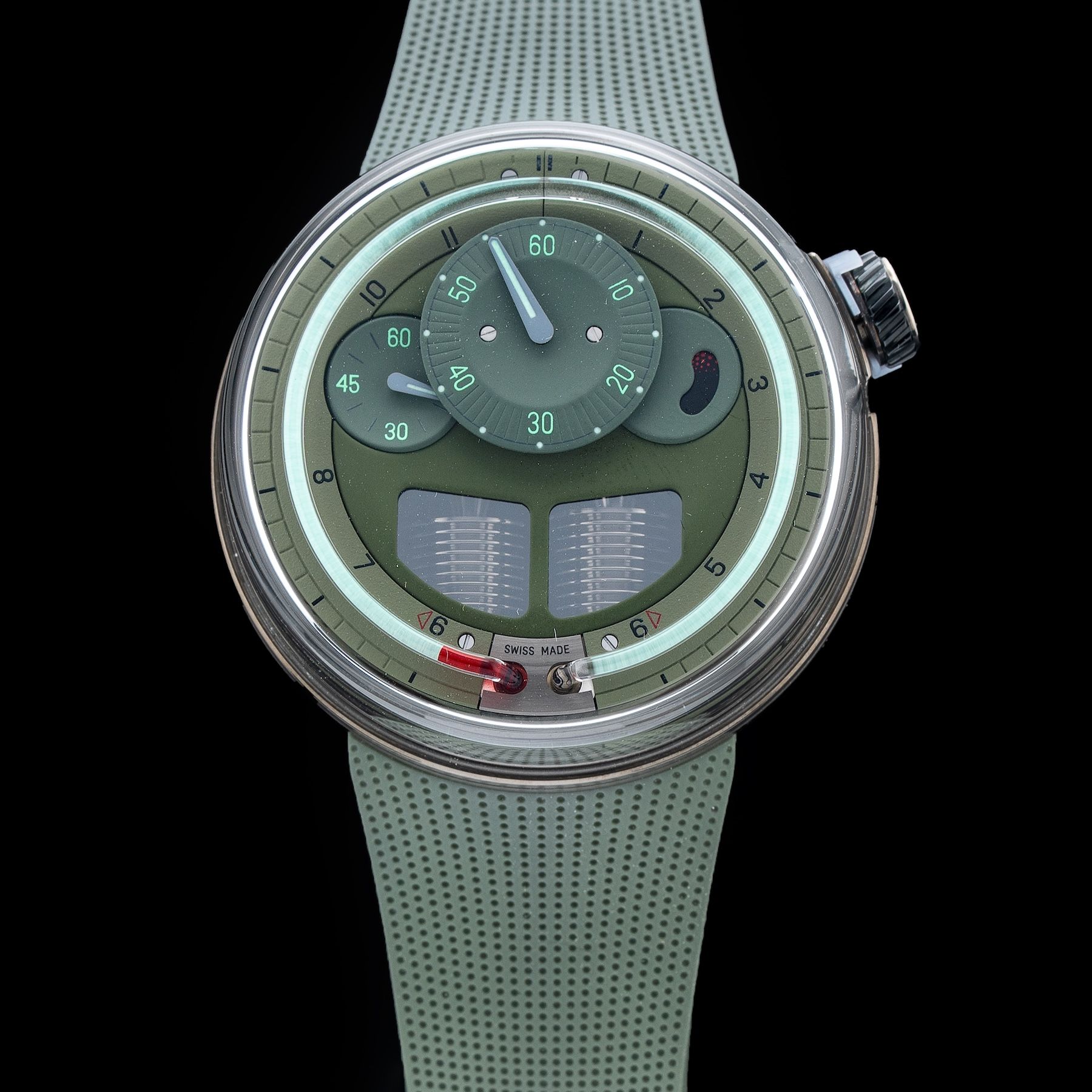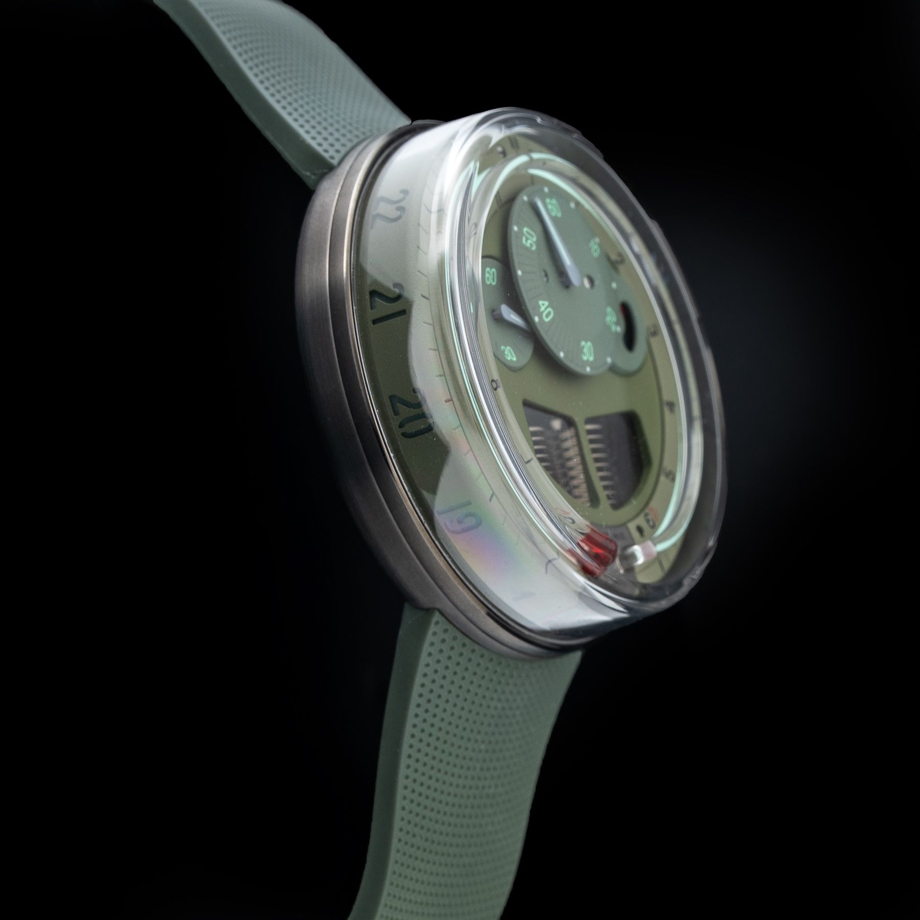 The new H0 model’s take on transience and transparency has two variations. in one of these, a khaki dial and rubber strap stylishly camouflage the dlc anthracite coating of the stainless steel case. red and pale green complete the color palette, with the former taking on the essential task of visualizing recently elapsed hours. a slate grey version, with a slight hint of blue, embraces a serene black case and bright accents on the dial for accessible timekeeping. ebony-colored liquid shows the now morphing into memories before our very eyes.