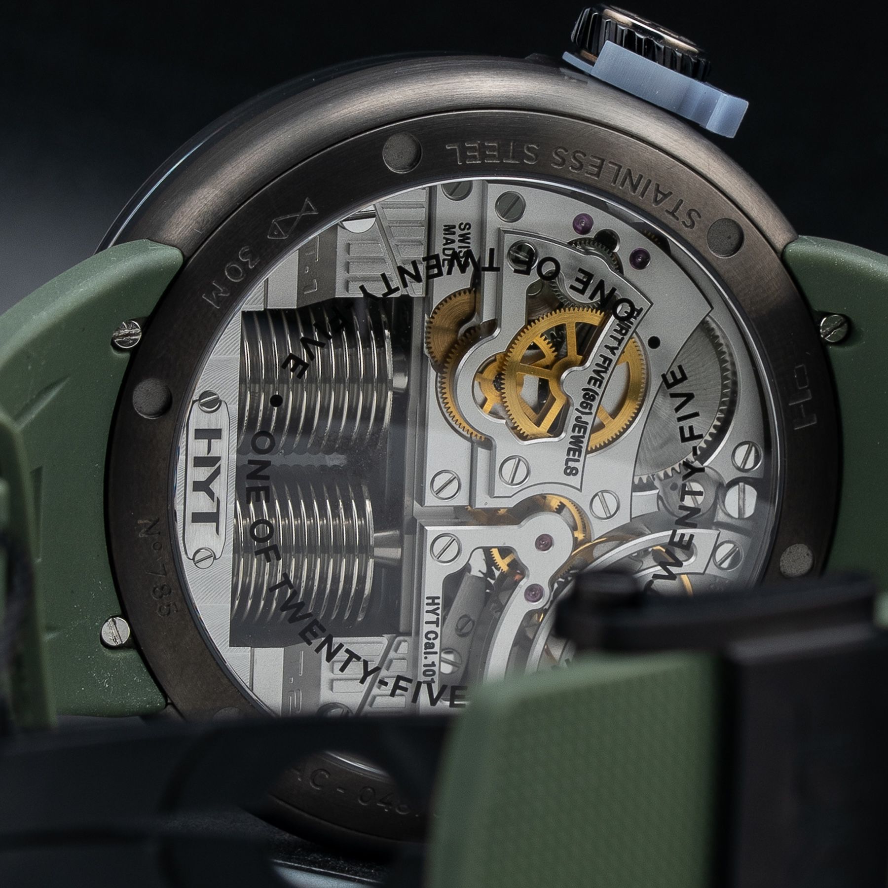 In an era where agendas are prone to overflow, the latest H0 focuses on making time’s flow meaningful. avant-garde esthetics, with a form resembling a smoothed pebble, a curved dial and the HYT patented fluidic module, are the platform for relevant functionality. bold digits, marking the passing hours, circumnavigate the side of the case and glow in the dark. this expresses the H0commitment to three-dimensionality. after all, since when have time and space satisfied themselves with two dimensions or one perspective? an extra visual dimension comes from smoky grey sapphire glass windows in front of the bellows that constitute liquid time’s powerhouse.