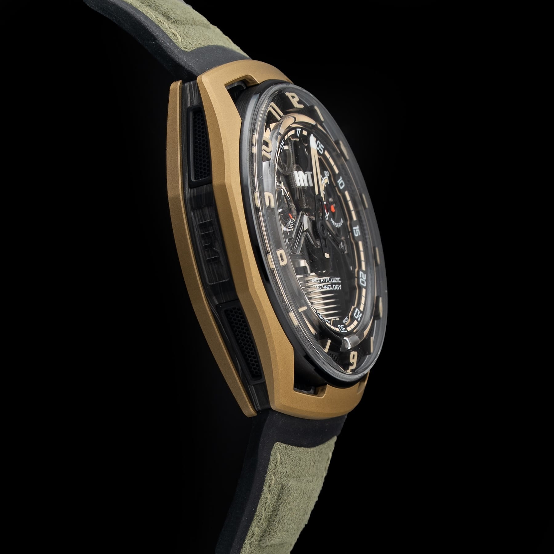 Retrograde fluidic hours, Central minutes hand, Small second hand, Power reserve hand