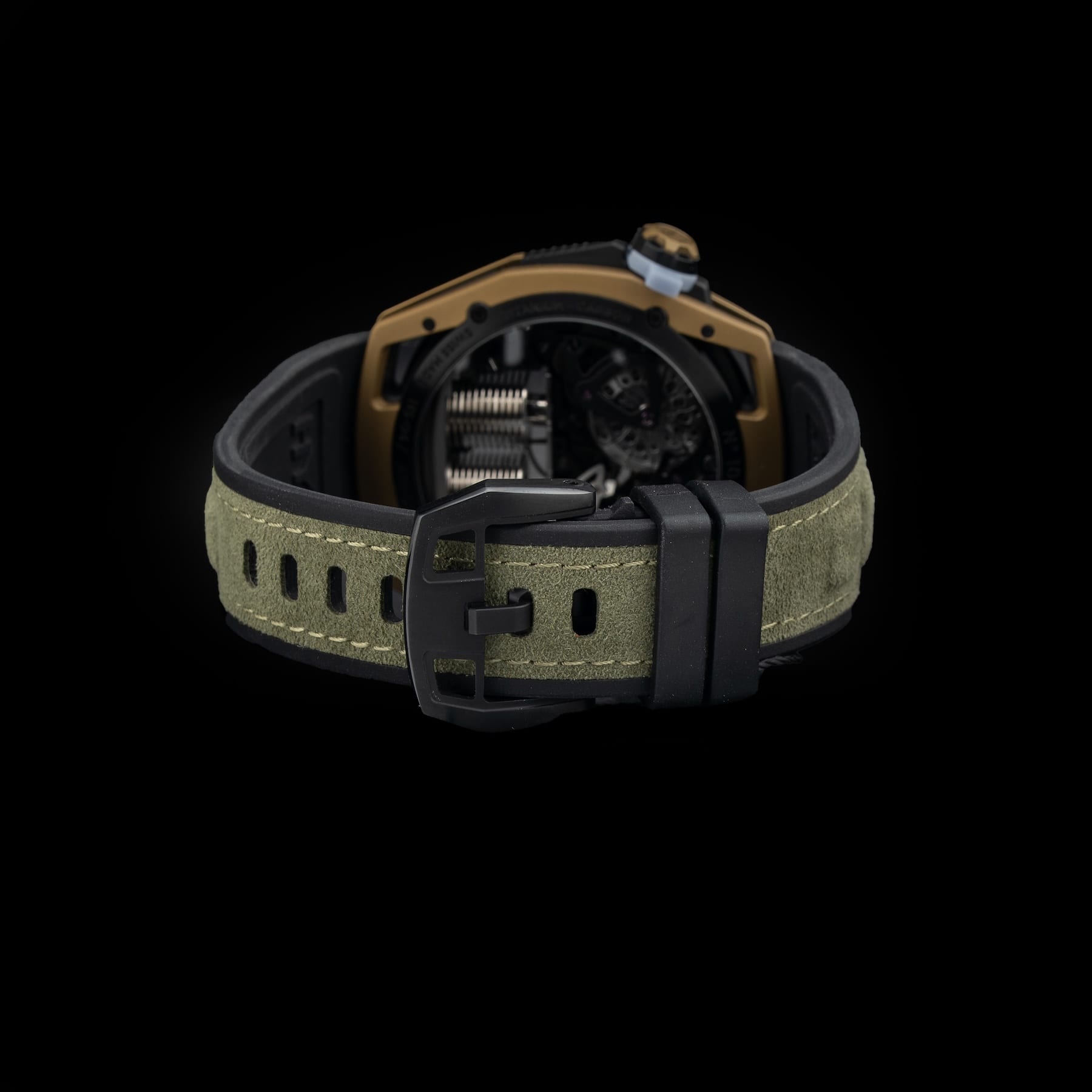 Black rubber strap, Military green embossed strap decor, Green stitching