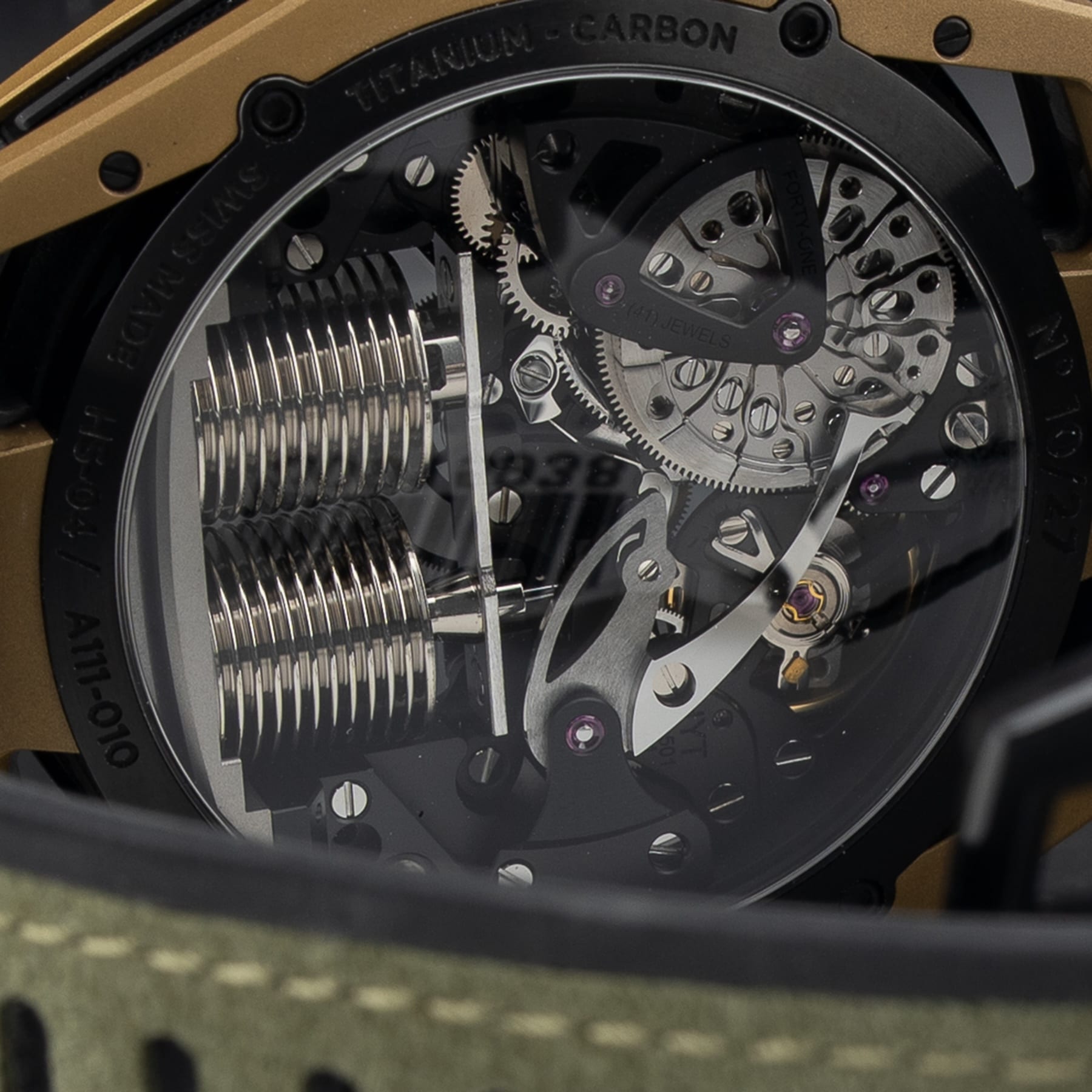Bronze coated satin finished titanium & carbon case (64 parts), Black side grids with black background