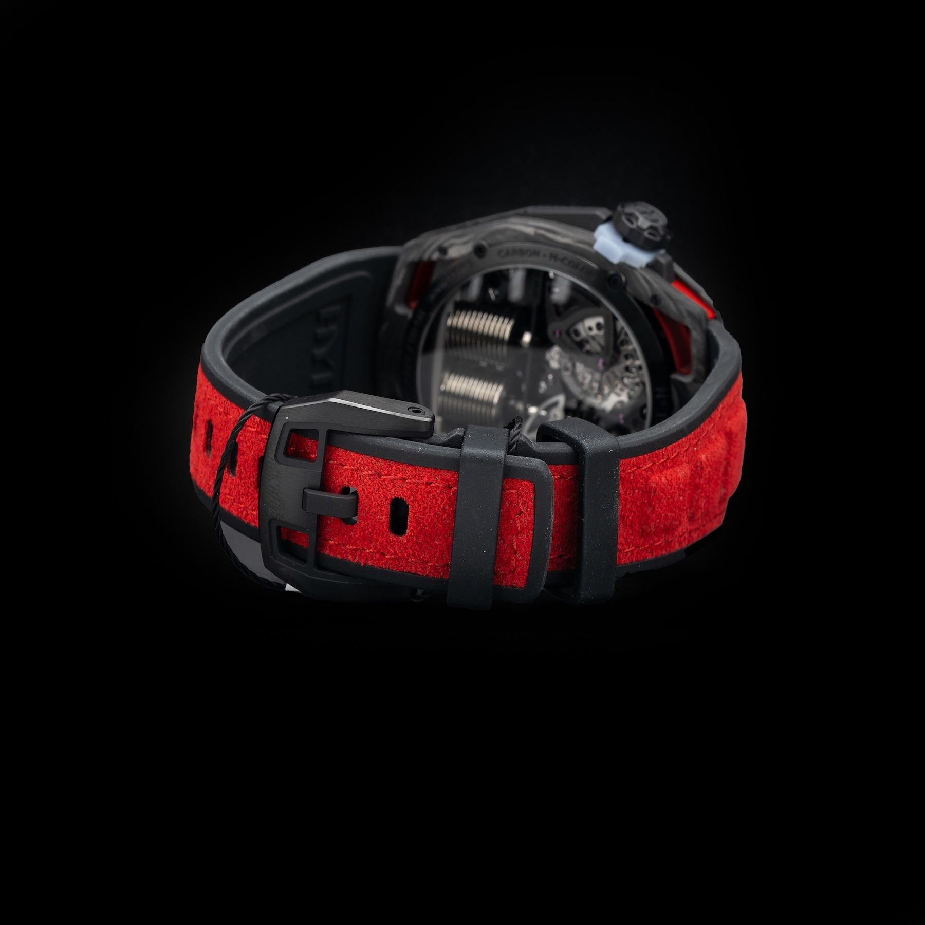 - This timepiece features a 48mm titanium case paired with a high quality rubber strap. It showcases a distinctive red and black dial and is powered by a precise manual winding movement. The watch is designed with a water resistance of up to 50m.