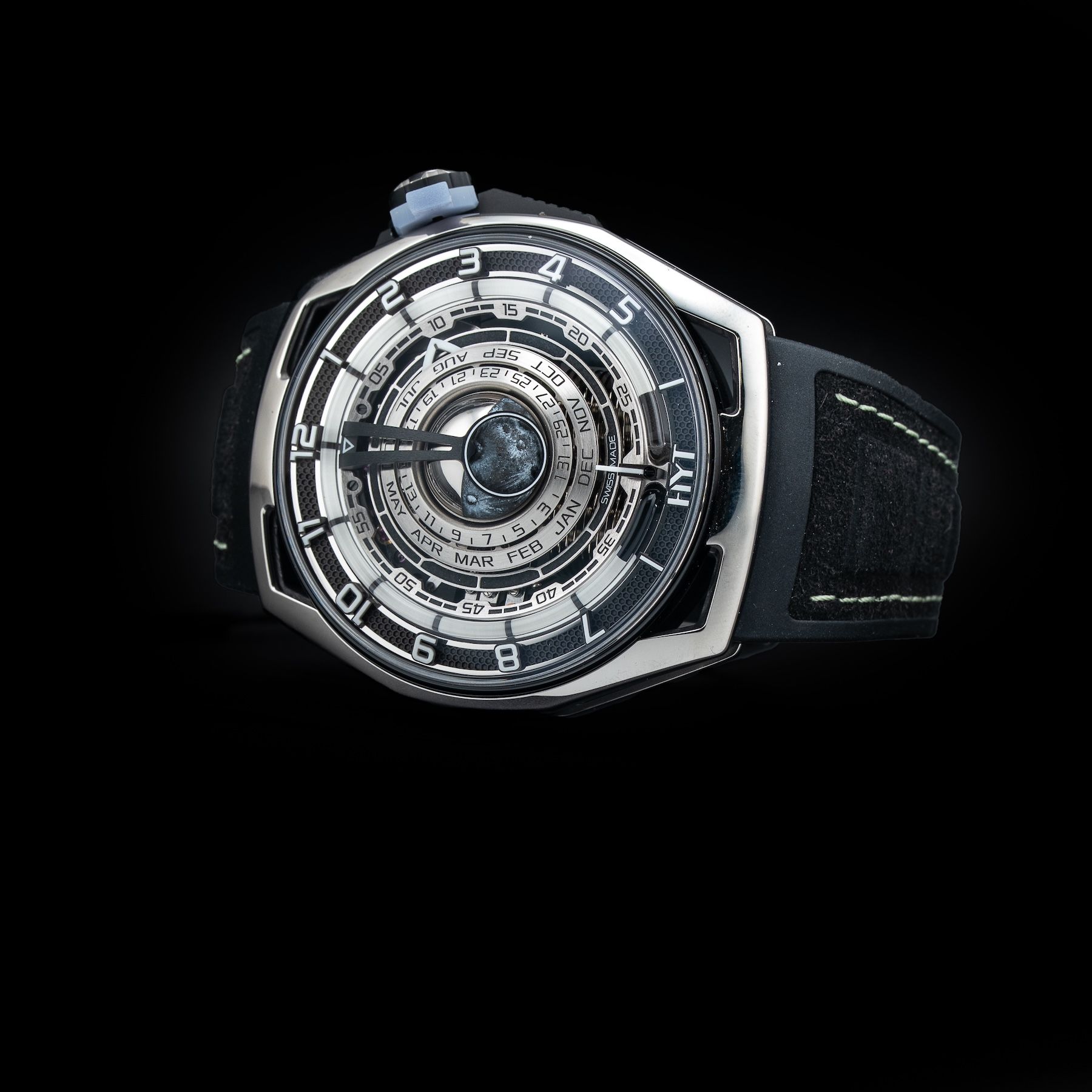 Fluidic retrograde hours, Central minutes hand, Day of the month, Month, 3D Moon Phase