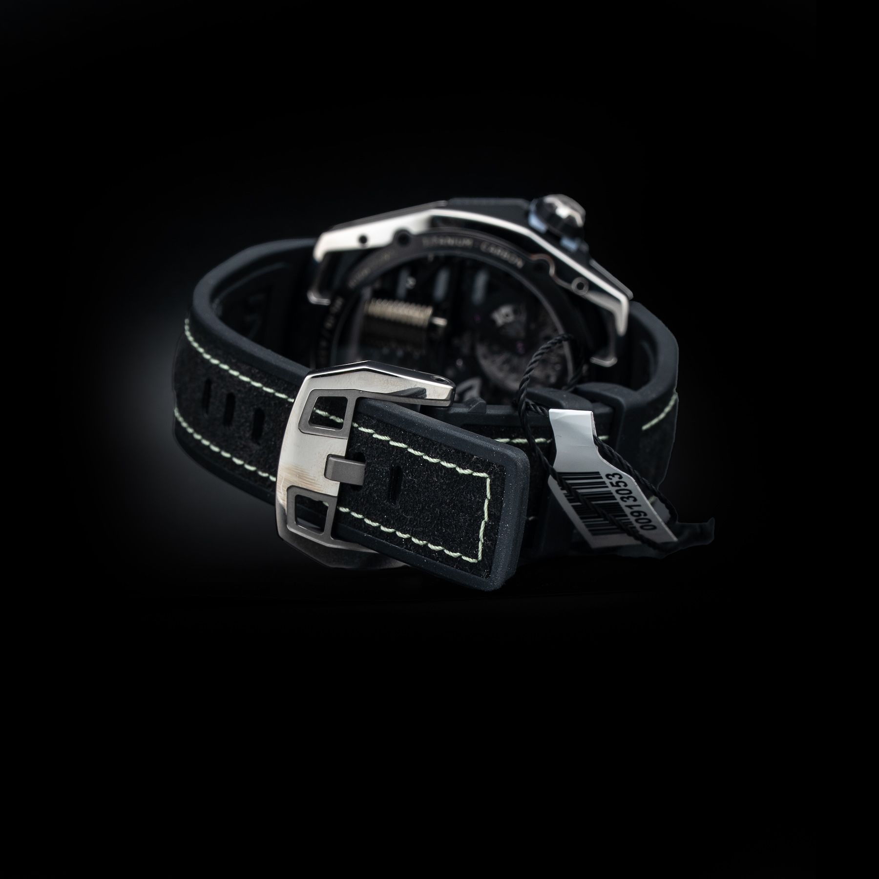 - This timepiece features a 48mm titanium and carbon case paired with a high quality rubber strap. It showcases a distinctive black dial and is powered by a precise manual winding movement. The watch is designed with a water resistance of up to 30m.