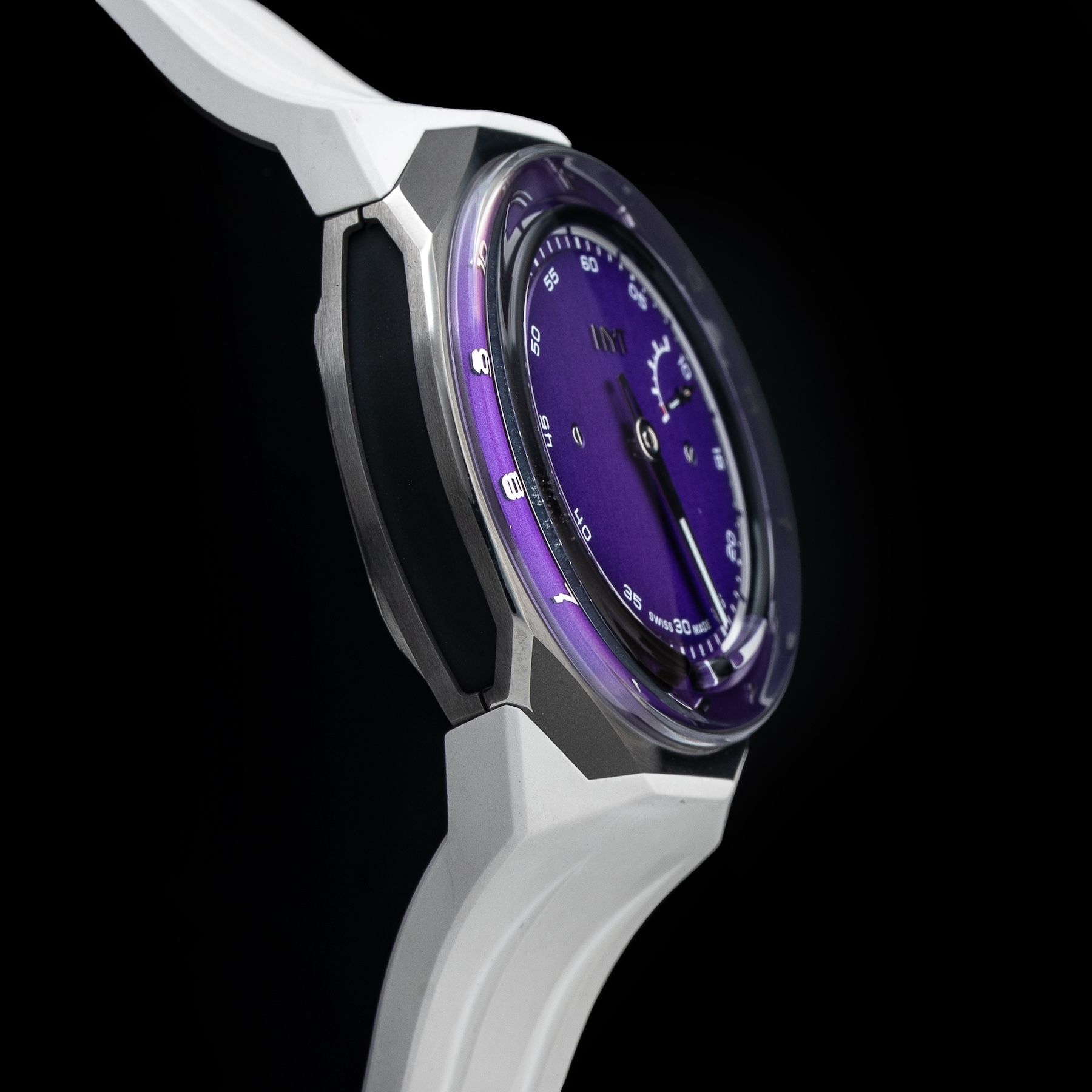 - This timepiece features a 45mm titanium case paired with a high quality rubber strap. It showcases a distinctive purple dial and is powered by a precise manual winding movement. The watch is designed with a water resistance of up to 50m.