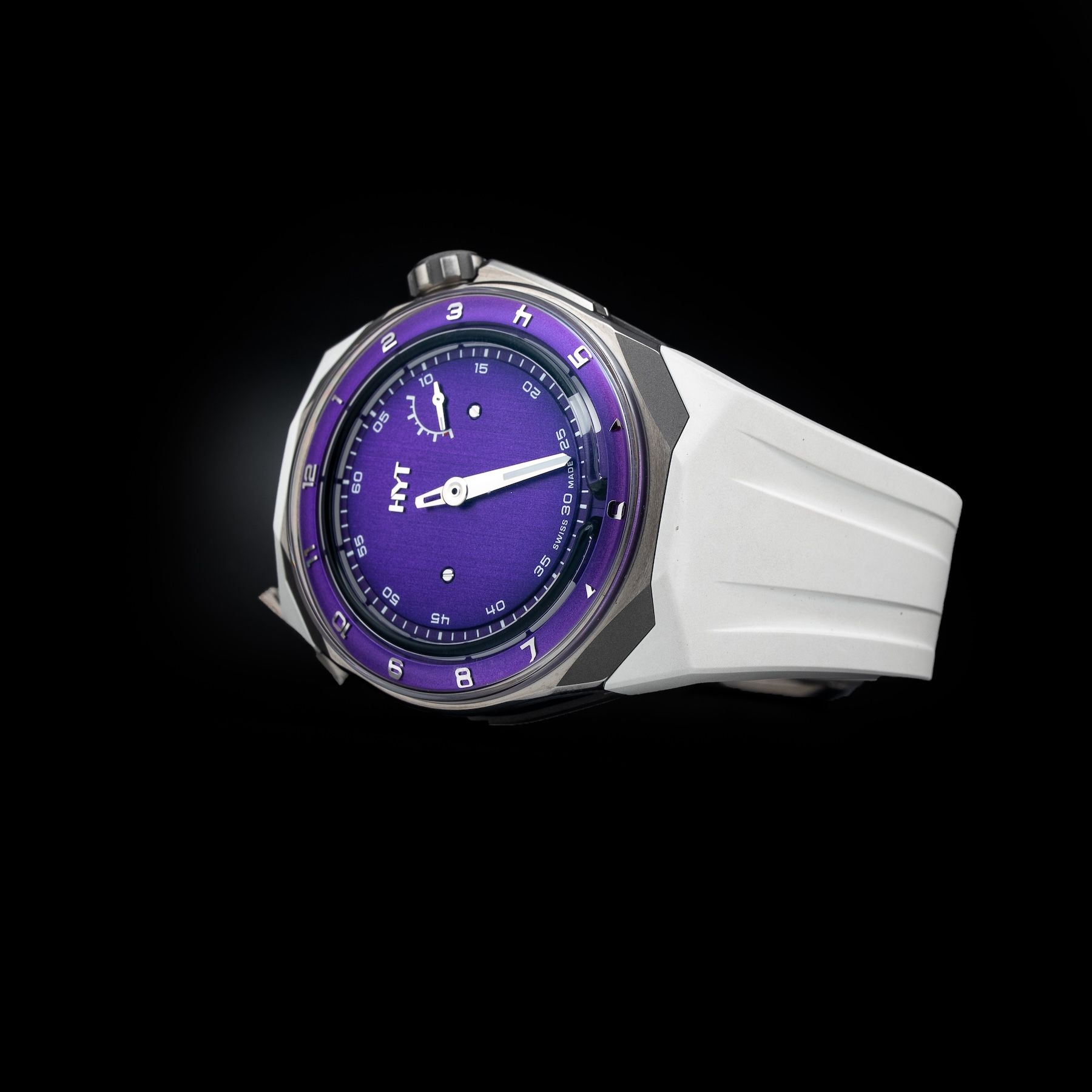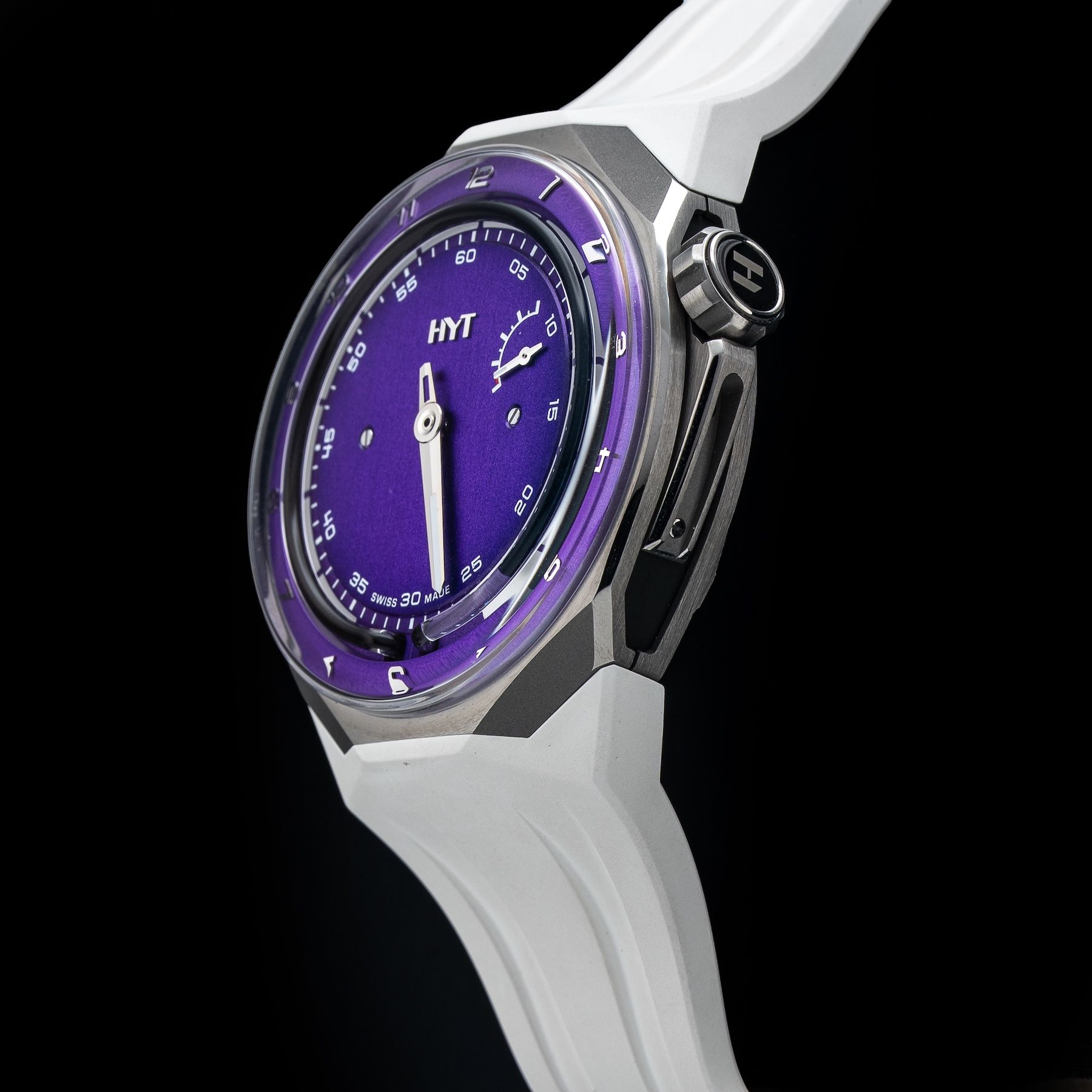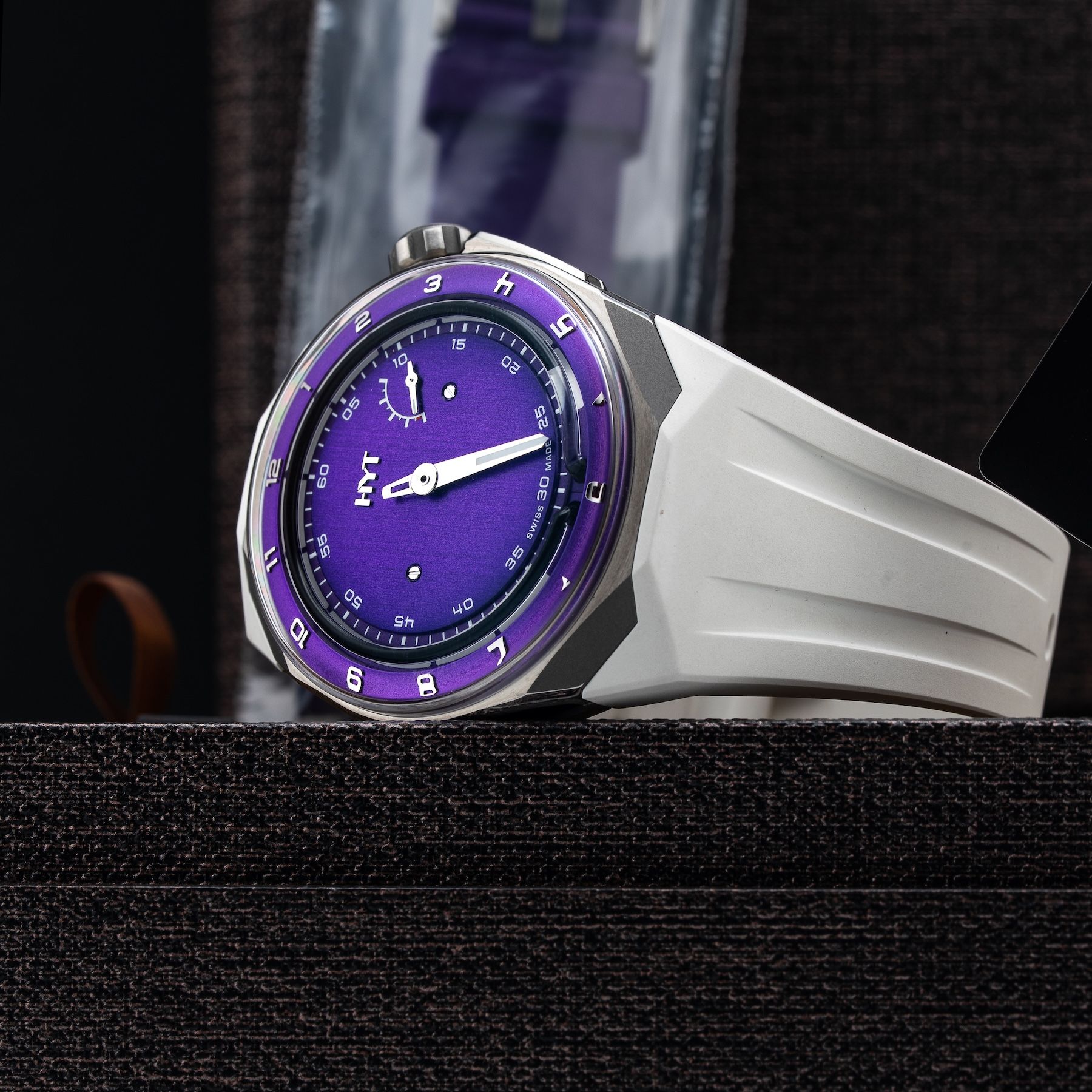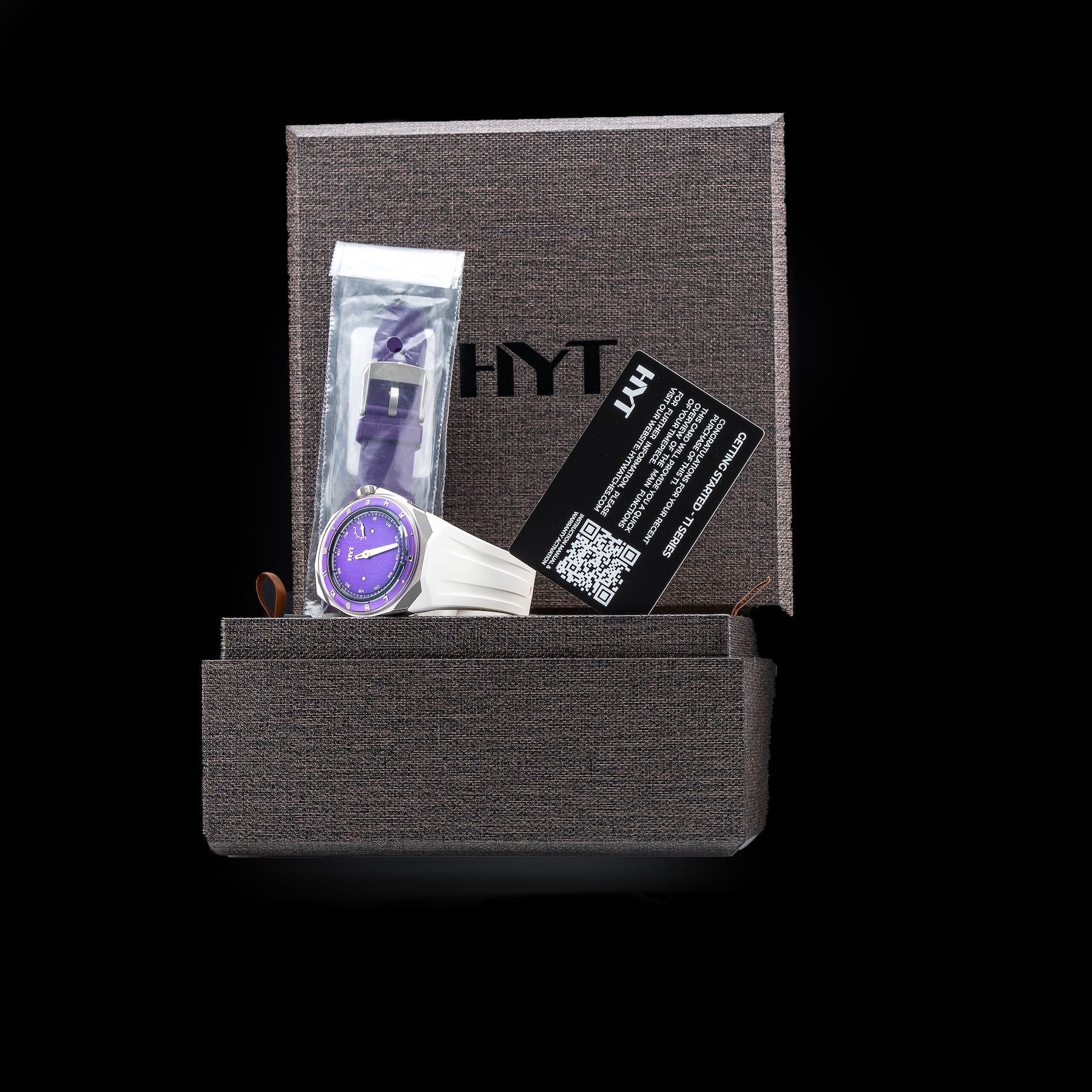 This HYT H03344-A T1 Titanium Purple Millésime Edition is in GREAT condition it has box, papers and warranty card. This watch has been fully authenticated and certified by Exquisite Timepieces. Please note, the photos shown are of the actual watch you will receive.