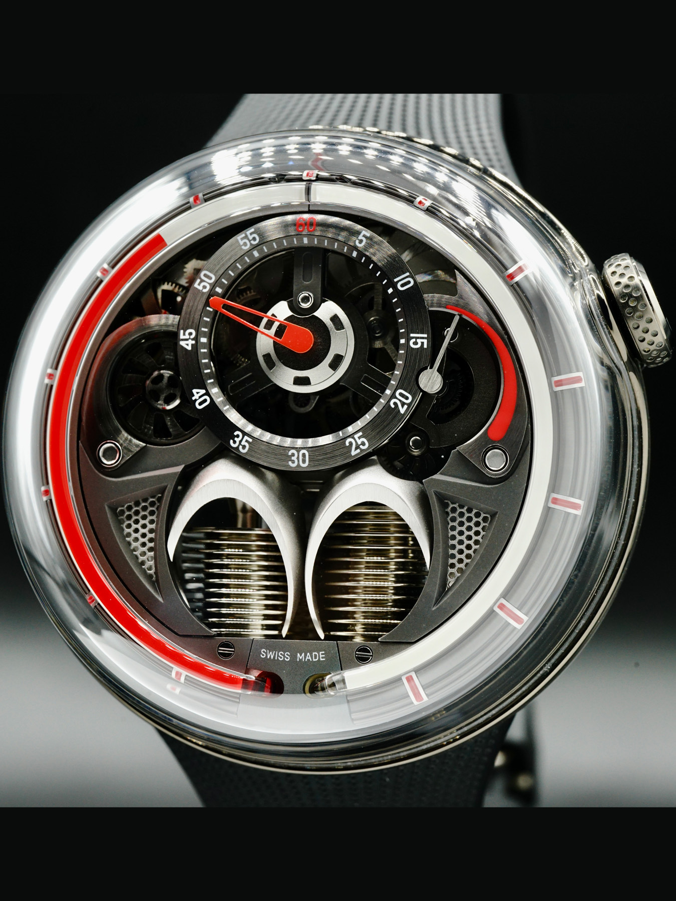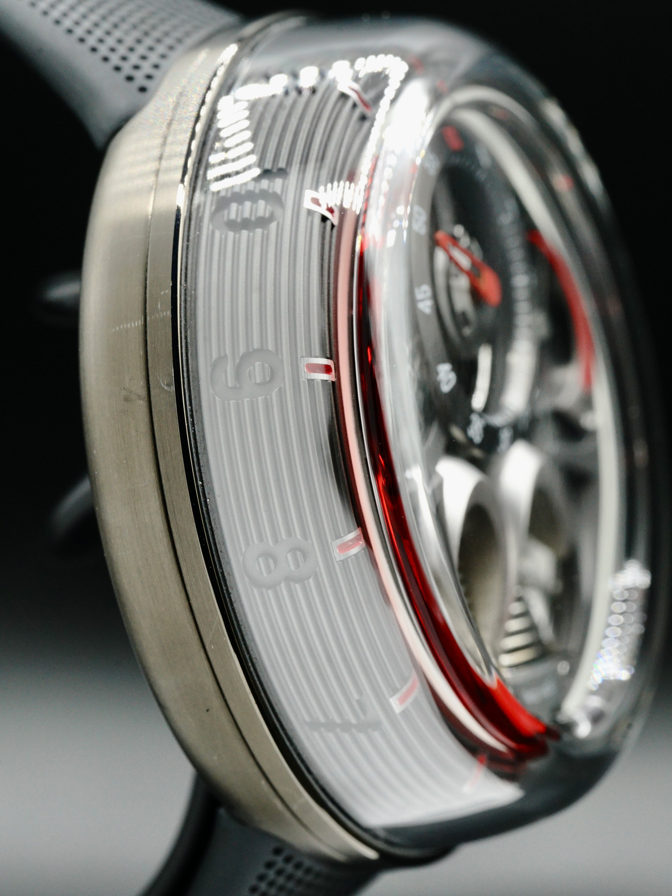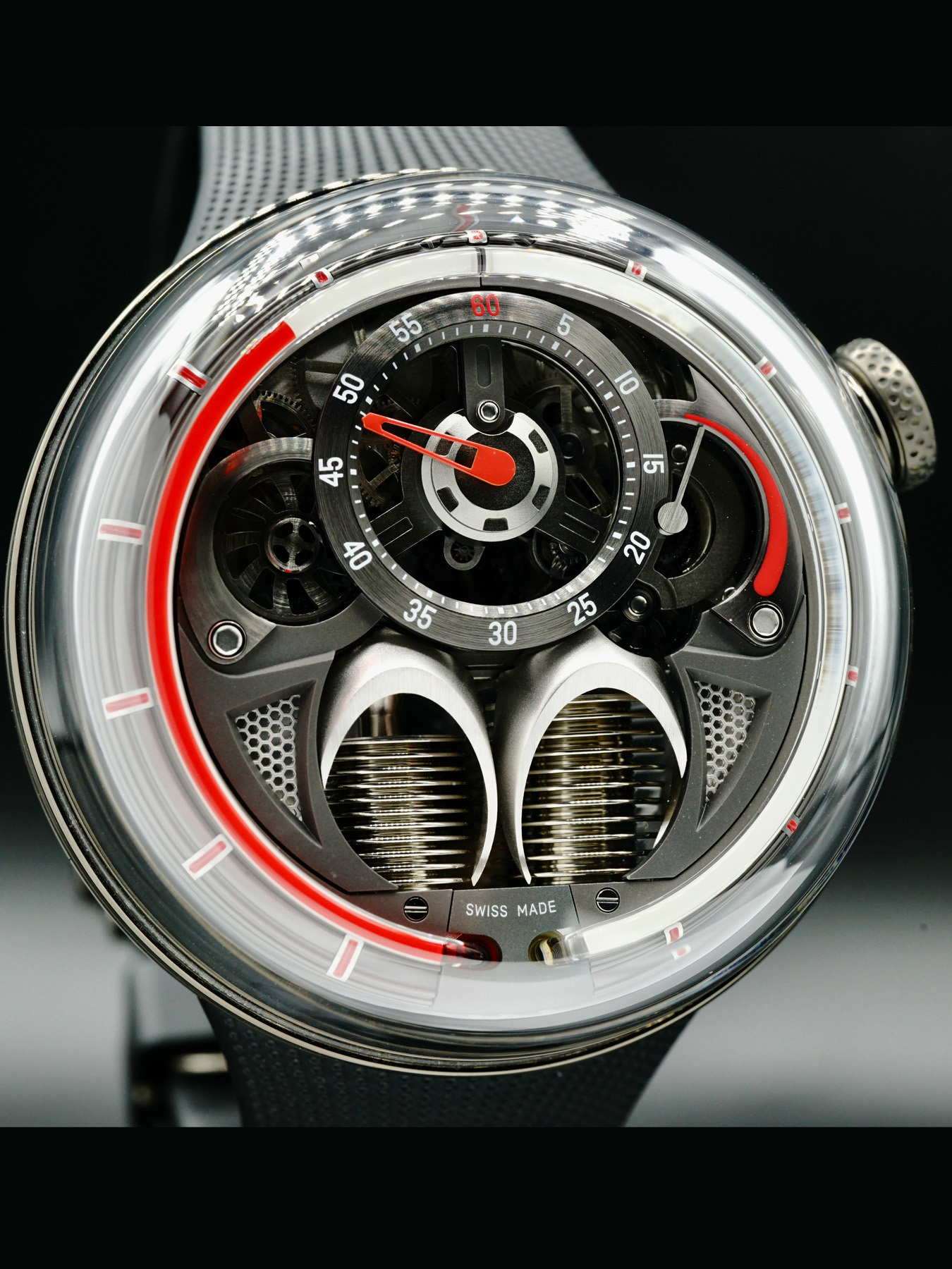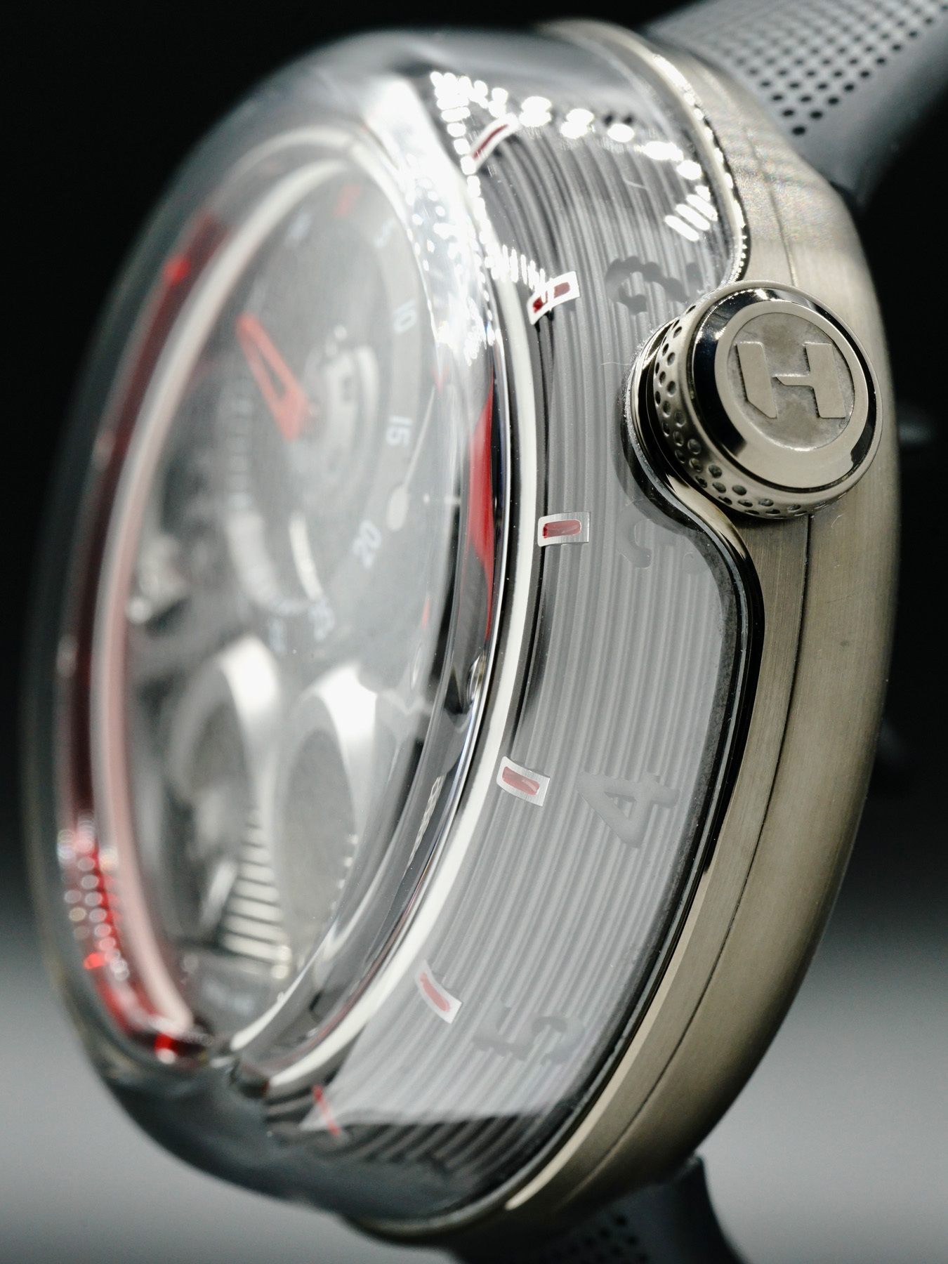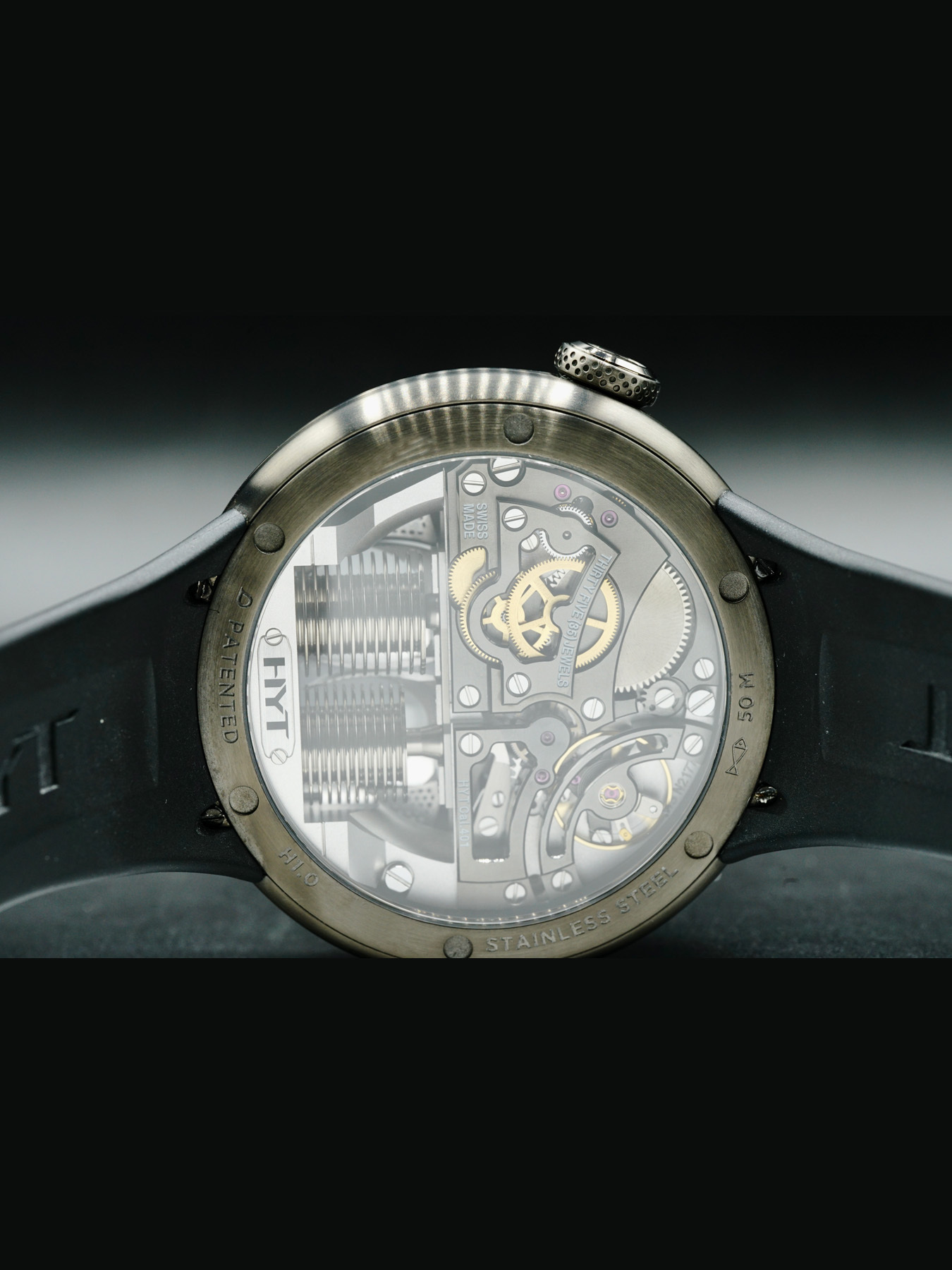 The H1.0 is empowered by three-dimensional transparency. Viewed from any angle it takes an architectural approach to visualizing the passage of time, placing the present in the context of the past and future, using liquids. All elements of the specially developed skeletonized mechanical movement collaborate closely to form the big picture of pure functionality. From the clearly visible power reserve display, to the constructed wheel that indicates the flow of the seconds, time is in perpetual motion. Positive energy emerges from a series of visible tensions, such as the shaping of the steeply curved case and the clipped lines of the bellows’ extractors. Even the side-view of the watch tells the story of time’s passage via cut-out digits embedded in the deep grooves of the case‘s exterior.