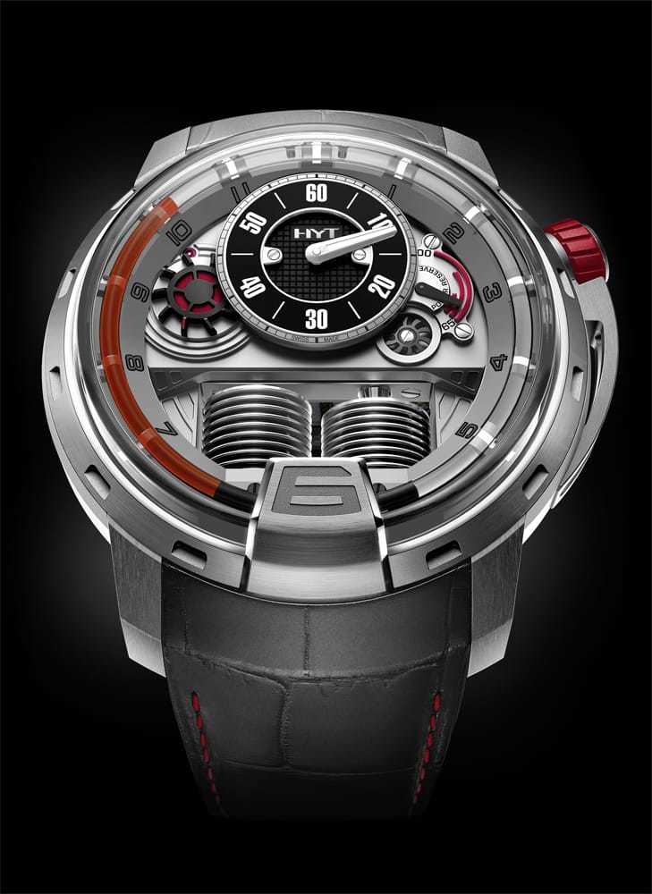 After indicating the time with a yellow fluid the brands dna hyt has taken on a new red fluid challenge: the colour of passion, of geneva and of switzerland. the liquid adjustement was not as simple as one could think and took eighteen technical months to perfect. its classical minutes dial preserves the heritage of the traditional haute horlogerie whilst seamlessly integrating the perfection of the high fluid technology. with its proprietary unique caliber, the h1 quai du mont-blanc movement is further enhanced by the beautiful côte-de-genève finitions.