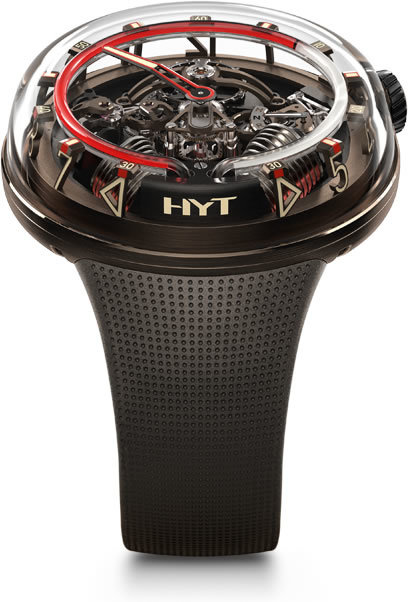 Science and art offer a totally new perspective on horology in a watch that visibly celebrates time’s essence. the former focuses on technical innovation, the latter on visual impact. its accurate measurement of time’s passage marks the conclusion of a challenging adventure. defying gravity is just one of the technical milestones that liquid time has reached. in the brown edition of the h20, red liquid records recently elapsed time, while clear liquid symbolizes the time that lies just ahead. the meeting point of the two substances is the precious present. a mechanical movement, created with aprp for exclusive use, is dedicated to precision. the 28-jewel caliber in this limited edition integrates rich brown pvd coating. seamless transmission between the mechanical movement and fluidic module takes place via the conversion of rotation into linear motion using a cam-follower system. a jumping minute hand and flange formed from one piece of metal add to the portfolio of expertise.