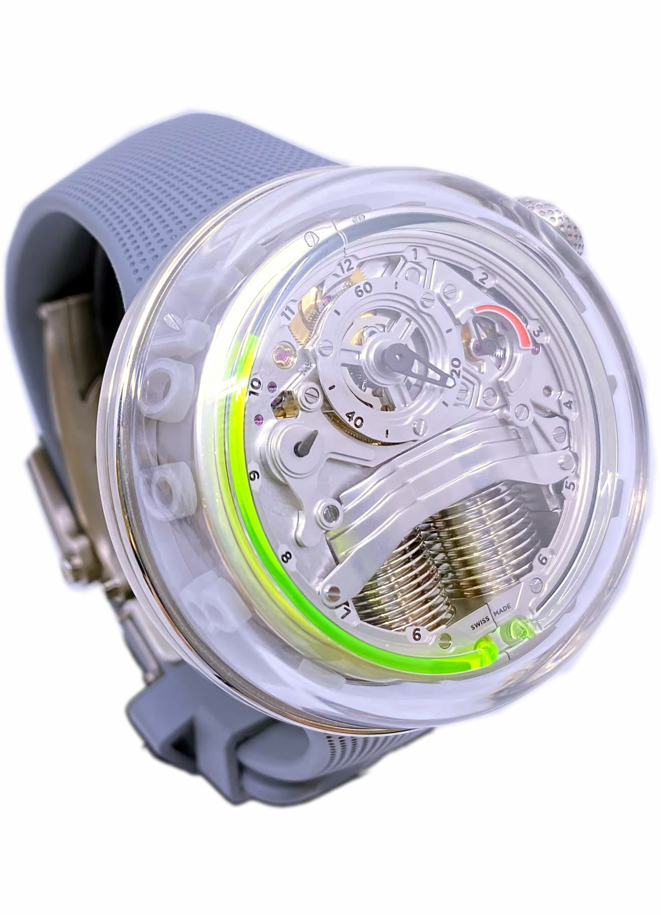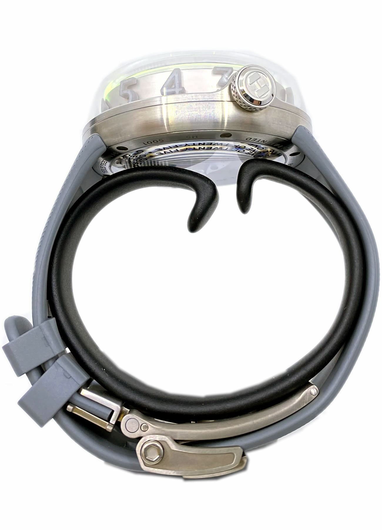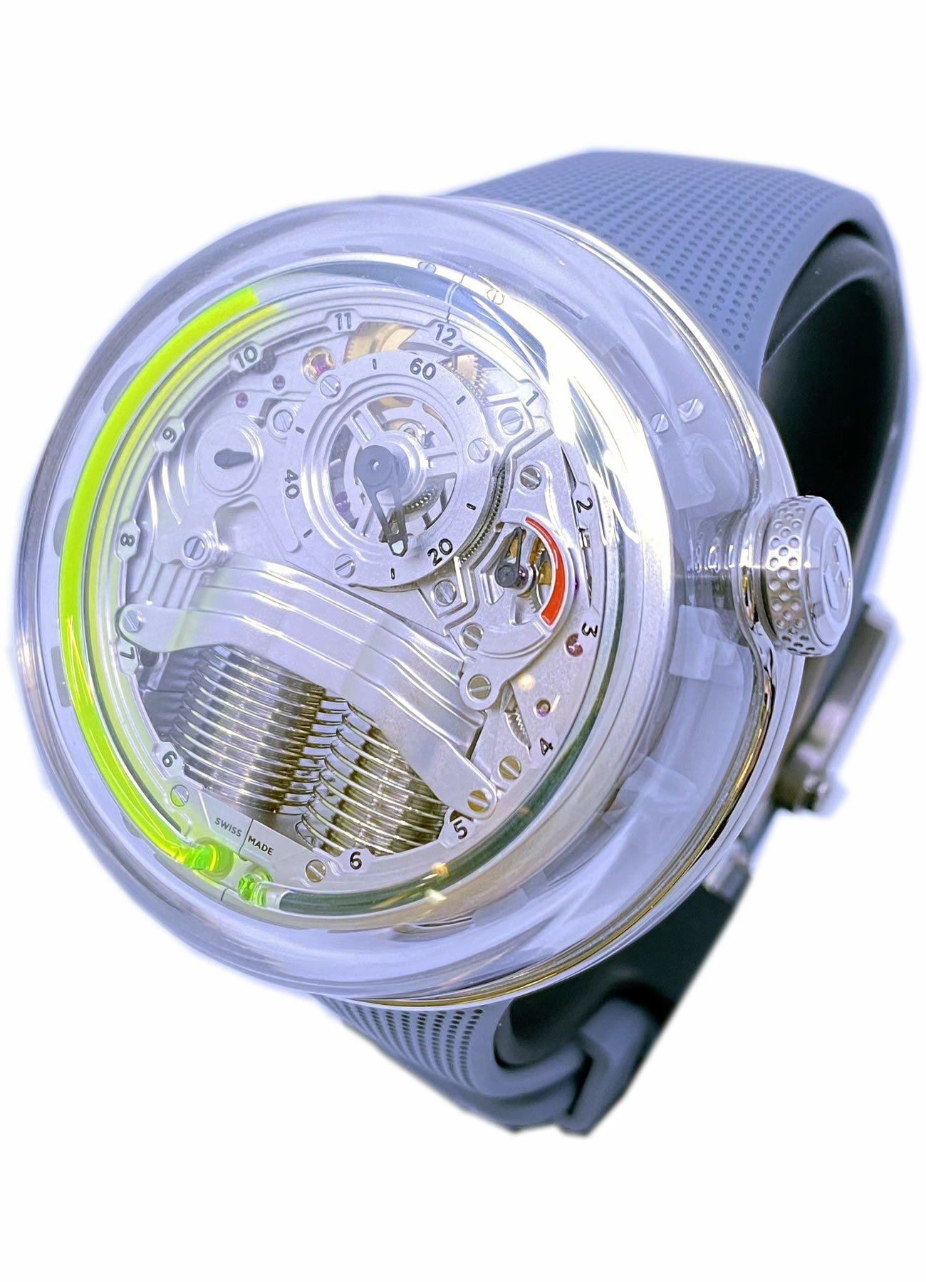 In the age of impatient immediacy, time’s value risks dilution. the HYT H5 is dedicated to measuring time in a way that draws attention to both its intrinsic passage and precious essence. an architectural approach, inspired by erosion, reveals the layers that create the whole in all its purity. a substance that erodes reveals. if this doesn’t happen, the story isn’t told. three-dimensionality and transparency invite viewing from all angles – by a generation obsessed with artificial intelligence and new virtual territories. a domed sapphire glass is ingeniously curved around a bold stainless steel case to simultaneously present and protect. stratified metal components, stepping and sinuous lines support the design’s strong storyline. the innovative neoralite external flange, with its cut-out numerals further enhance the H5’s fascination with perspective. the striking vertical digits appear to float around the watch during the day and start to glow as darkness falls. created from one single piece of luminescent, super-luminova®-filled, translucent material, this component’s complex production process involves 3d printing, molding, injection and subtle grinding. like natural erosion, personal evolution continues around the clock, time after time.