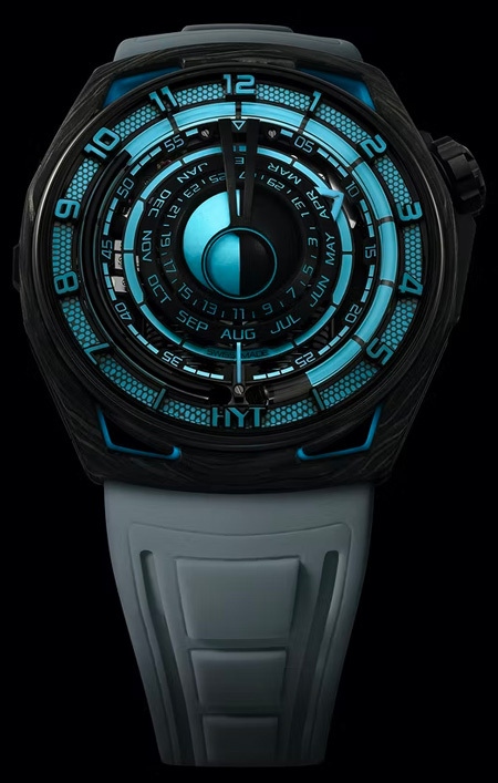 In addition to its spectacular luminescent properties, the 48 mm Hydro Carbon and Tec Light® case with a sapphire crystal dome and contrasting dial are immediately striking. One of the most remarkable elements of this dial is the black fluid contained in the capillary tube allowing the retrograde indication of the hours.