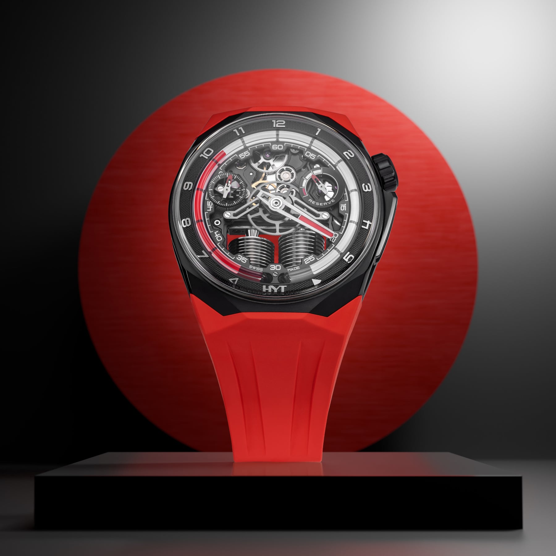 Its black DLC‑coated titanium case with red ceramic trim sets the tone: stealth surfaces cut by a vivid line of colour that echoes the red fluid tracking the hours. On the dial, white and red decals, red SLN and bold numerals create a high‑contrast stage where the liquid meniscus reads like a rev counter sweeping around the periphery.