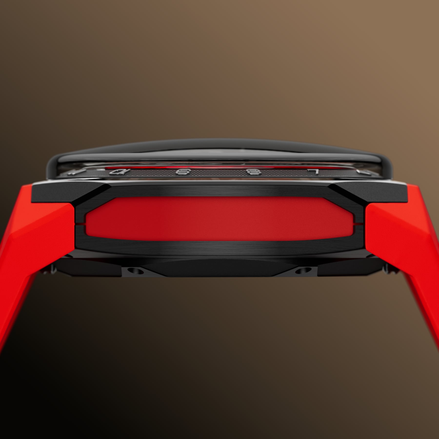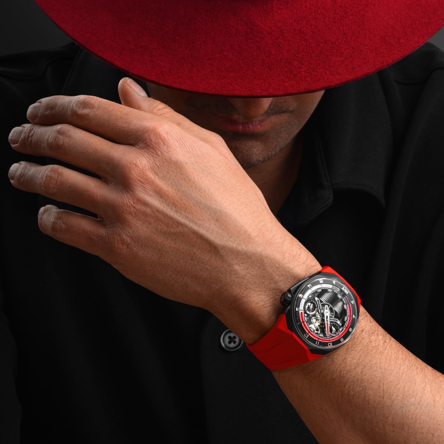 The angular 45.30 × 17.20 mm titanium case remains surprisingly wearable thanks to its ergonomic profile and steep strap integration. A full red rubber strap picks up the colour of the fluid and ceramic trim, turning the watch into a pure adrenaline gauge on the wrist, yet the quick‑release system lets you switch to a more discreet strap in seconds.